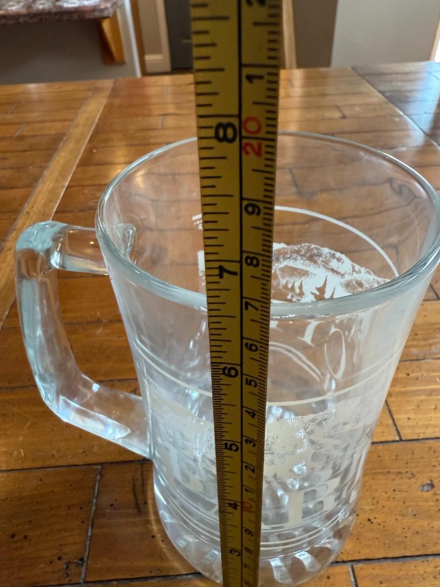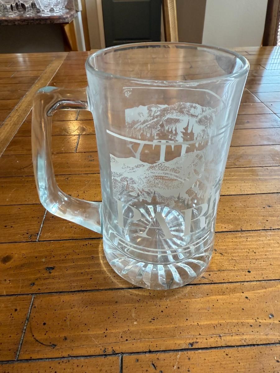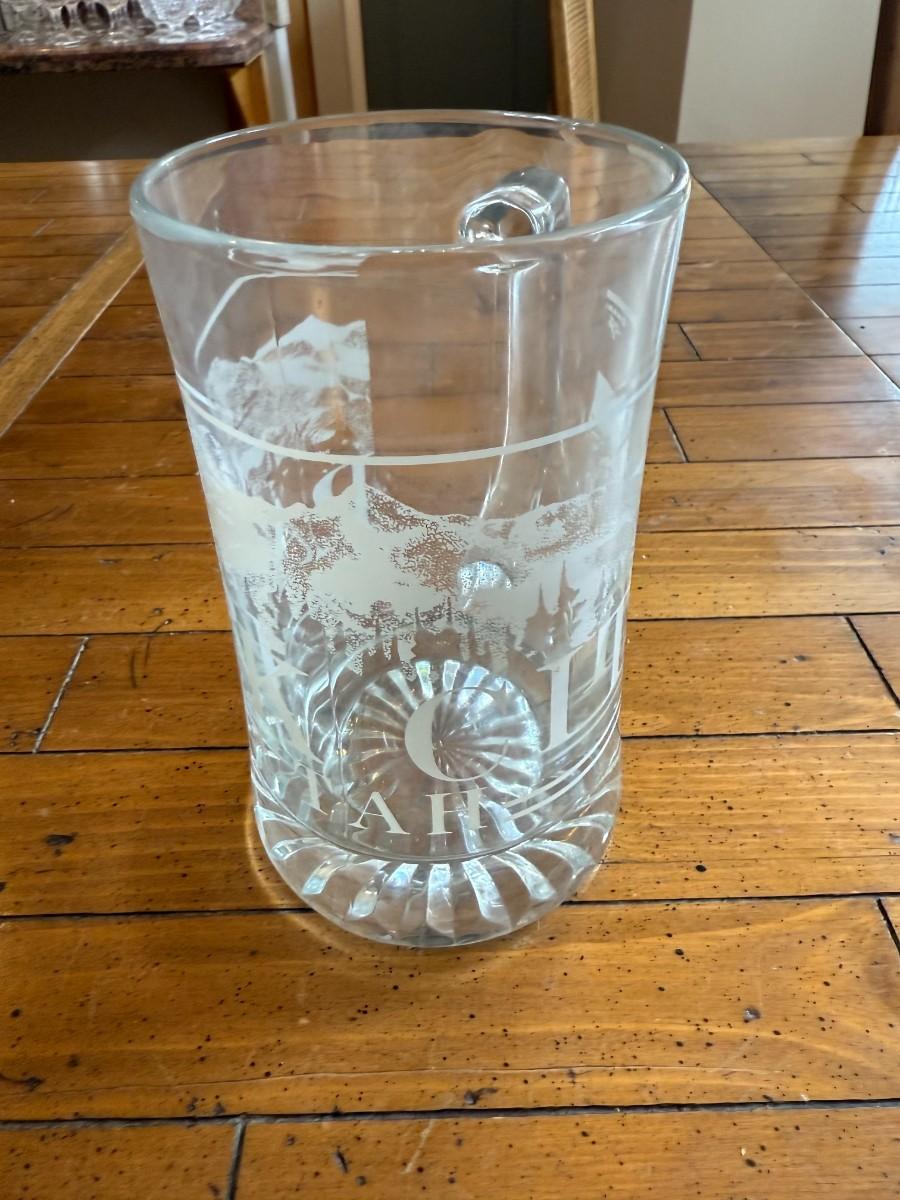 Heavy clear glass stein with frosted mountain and lodge scene, marked "Park City." Great for ski lodge display.
