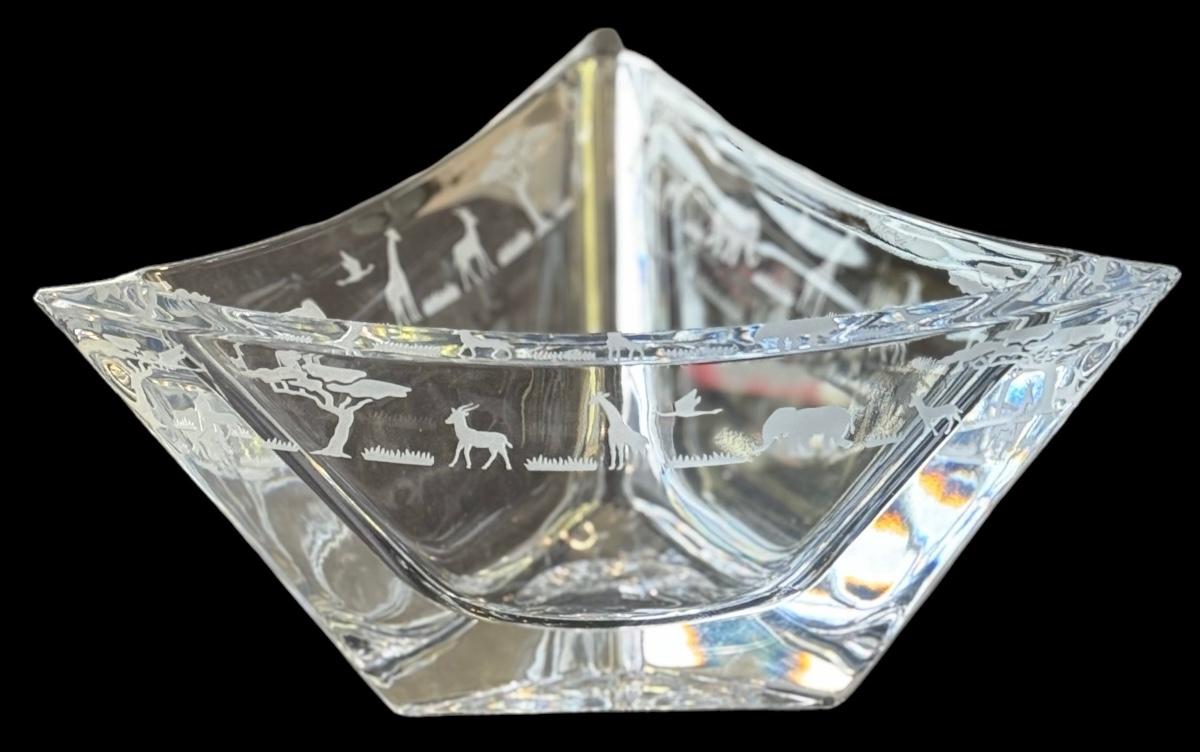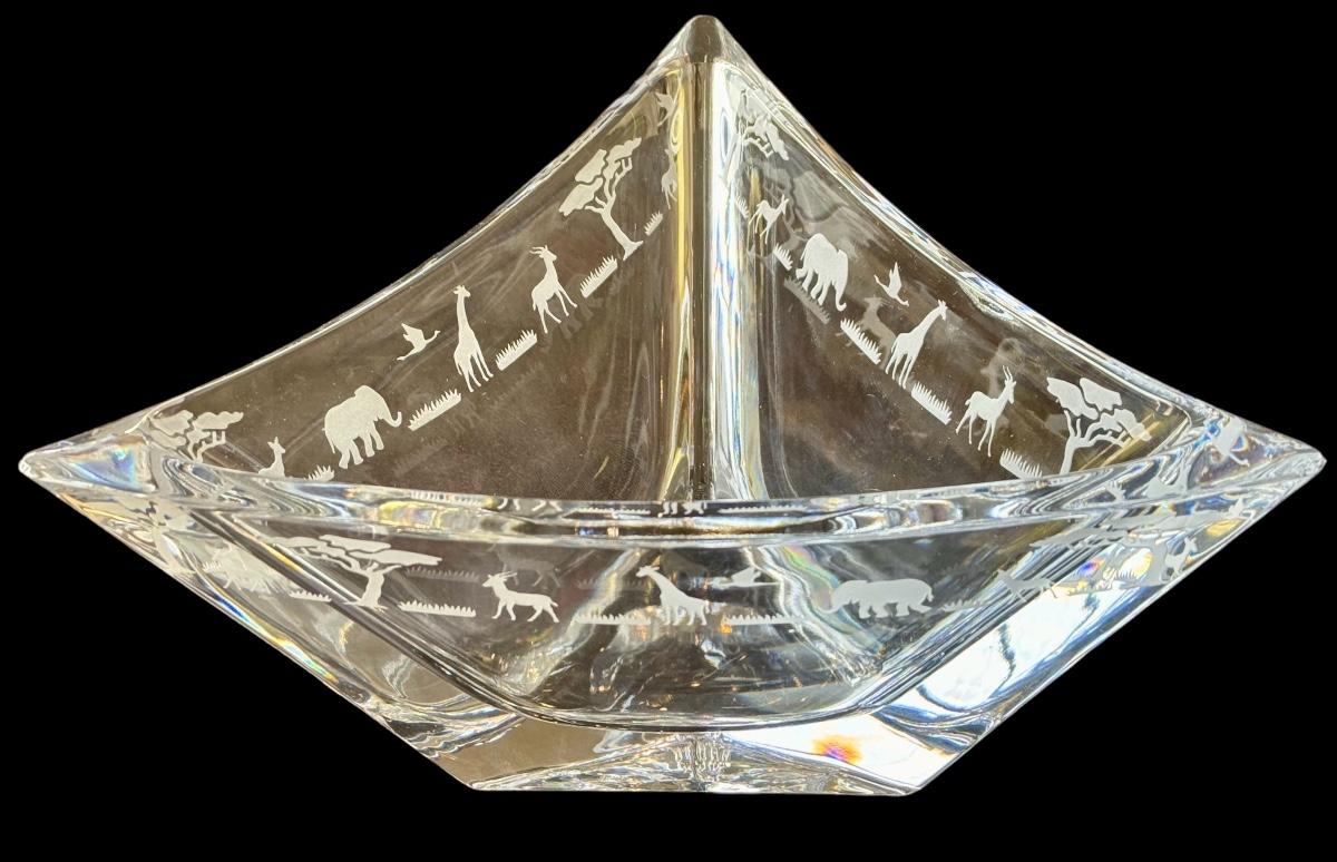 Vintage Mikasa Crystal Triangular Bowl with African Motif Etchings