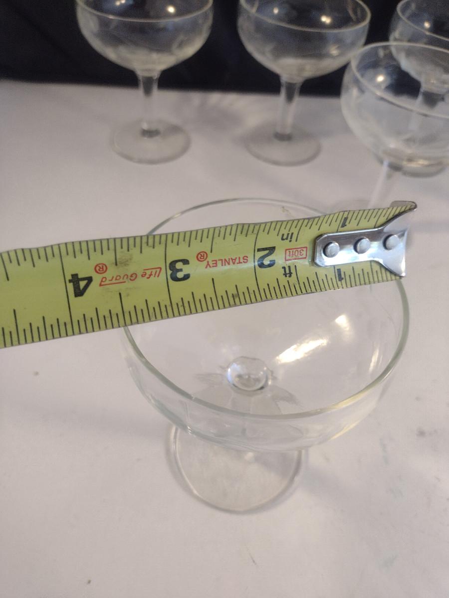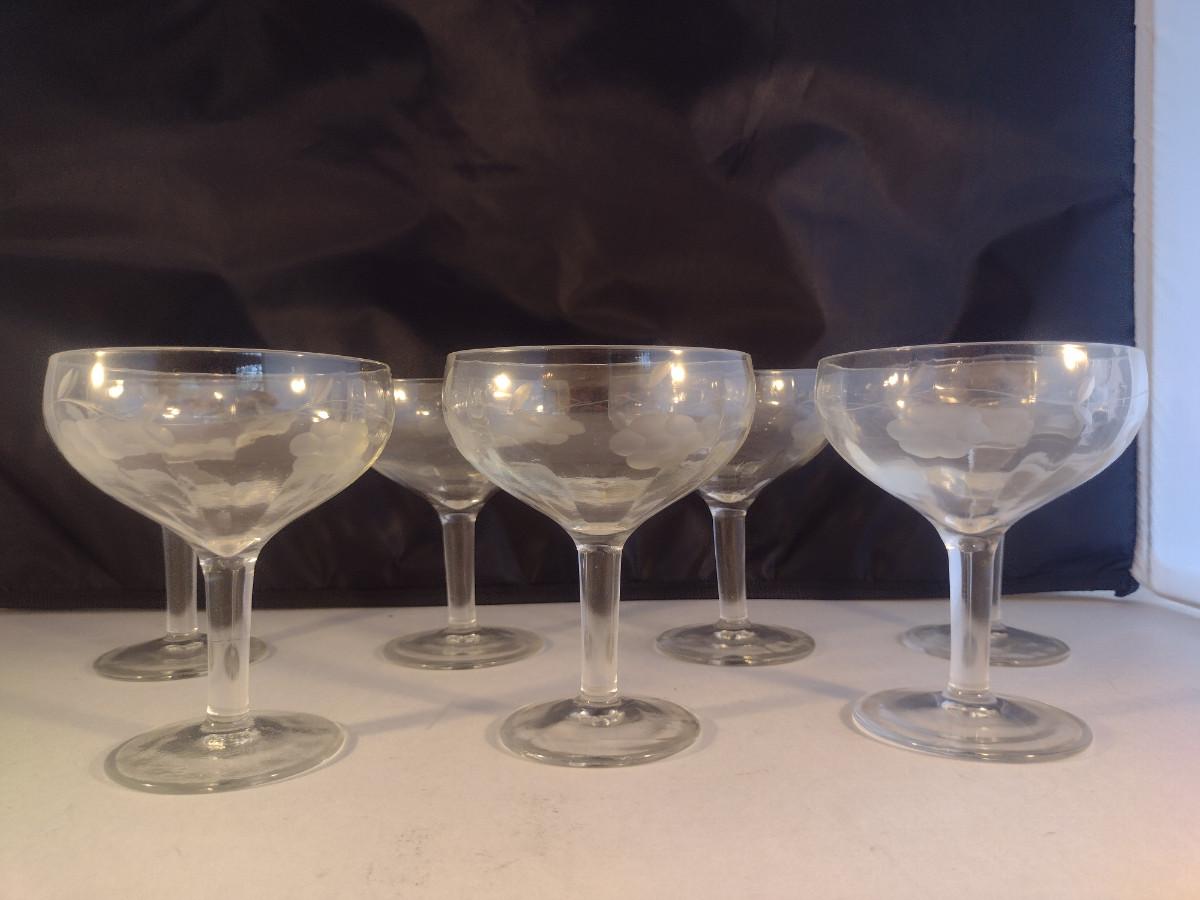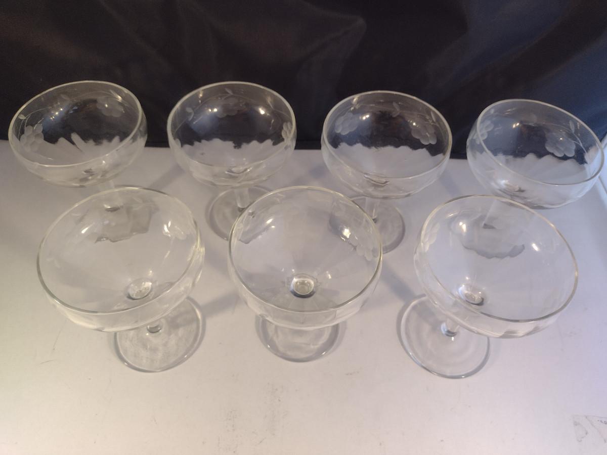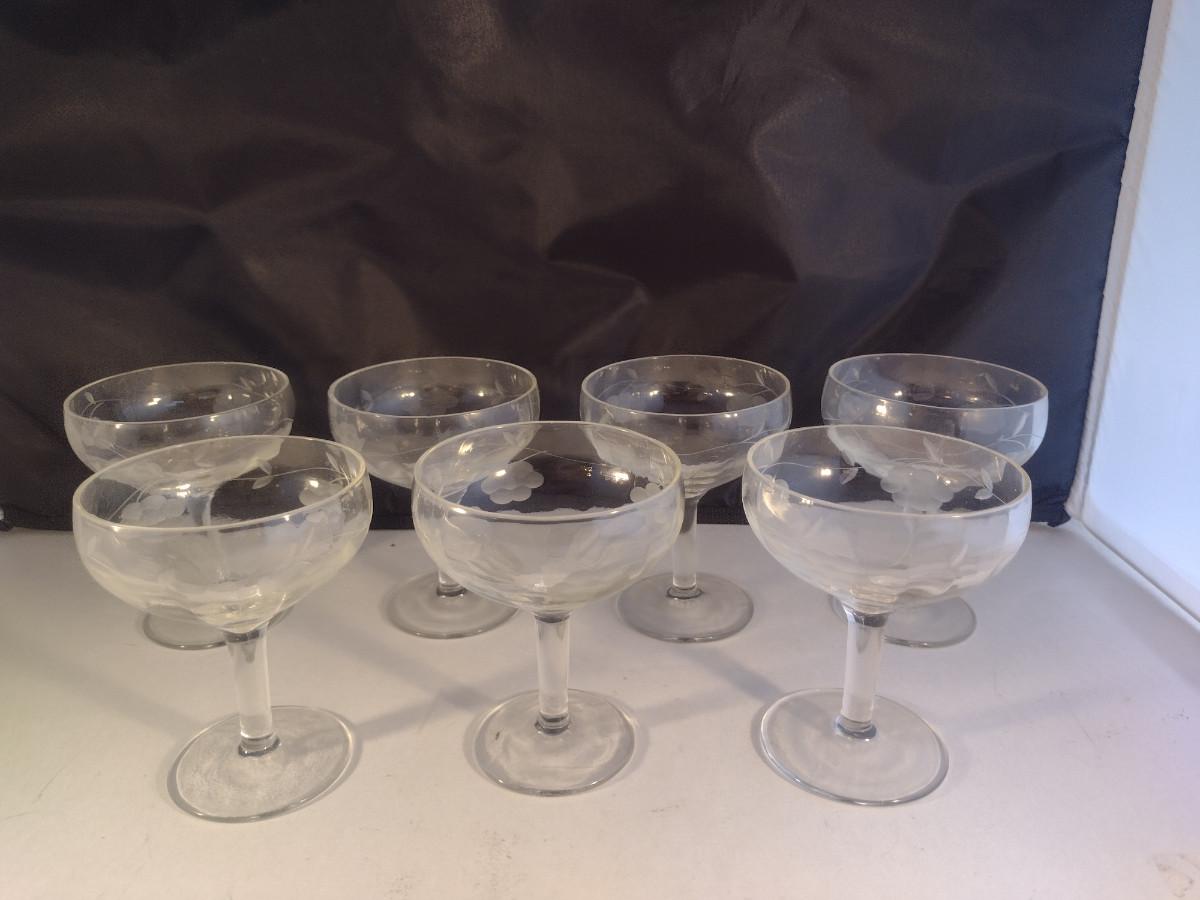 Etched Glass Champagne Coupe/Sherbet Glasses- 7 Piece. Items are in used condition and have small 'chigger bite' chipping.