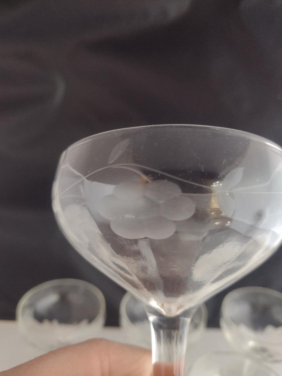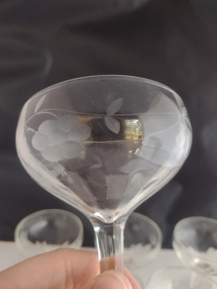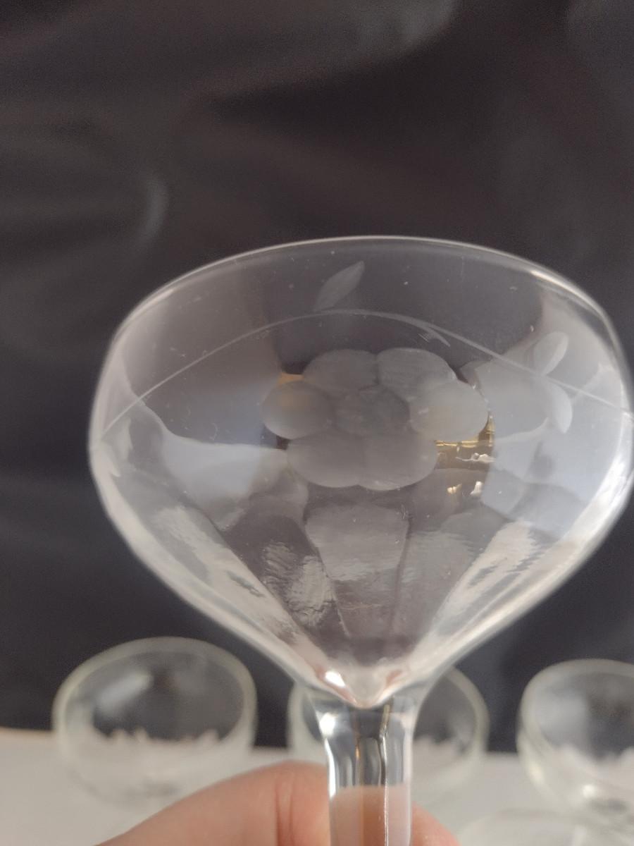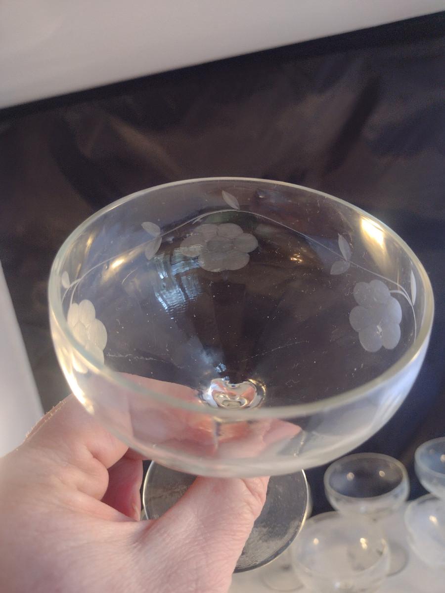 Etched Glass Champagne Coupe/Sherbet Glasses- 7 Piece. Items are in used condition and have small 'chigger bite' chipping.