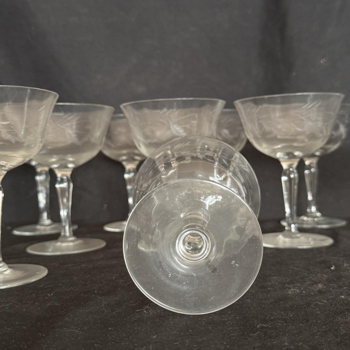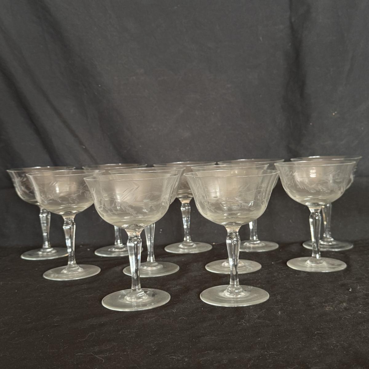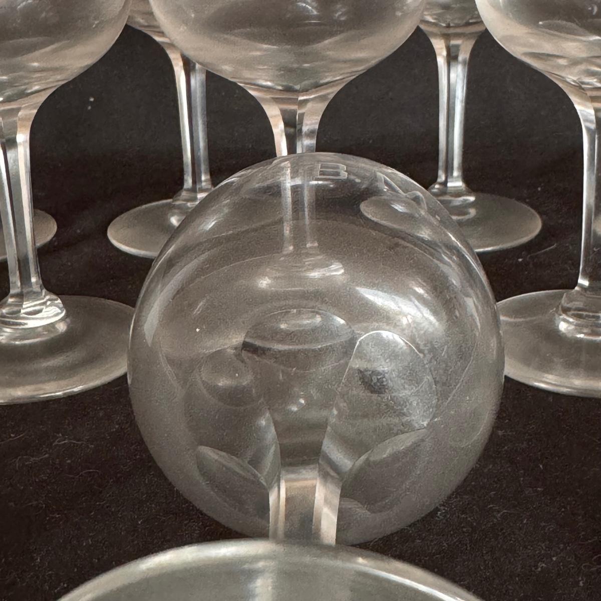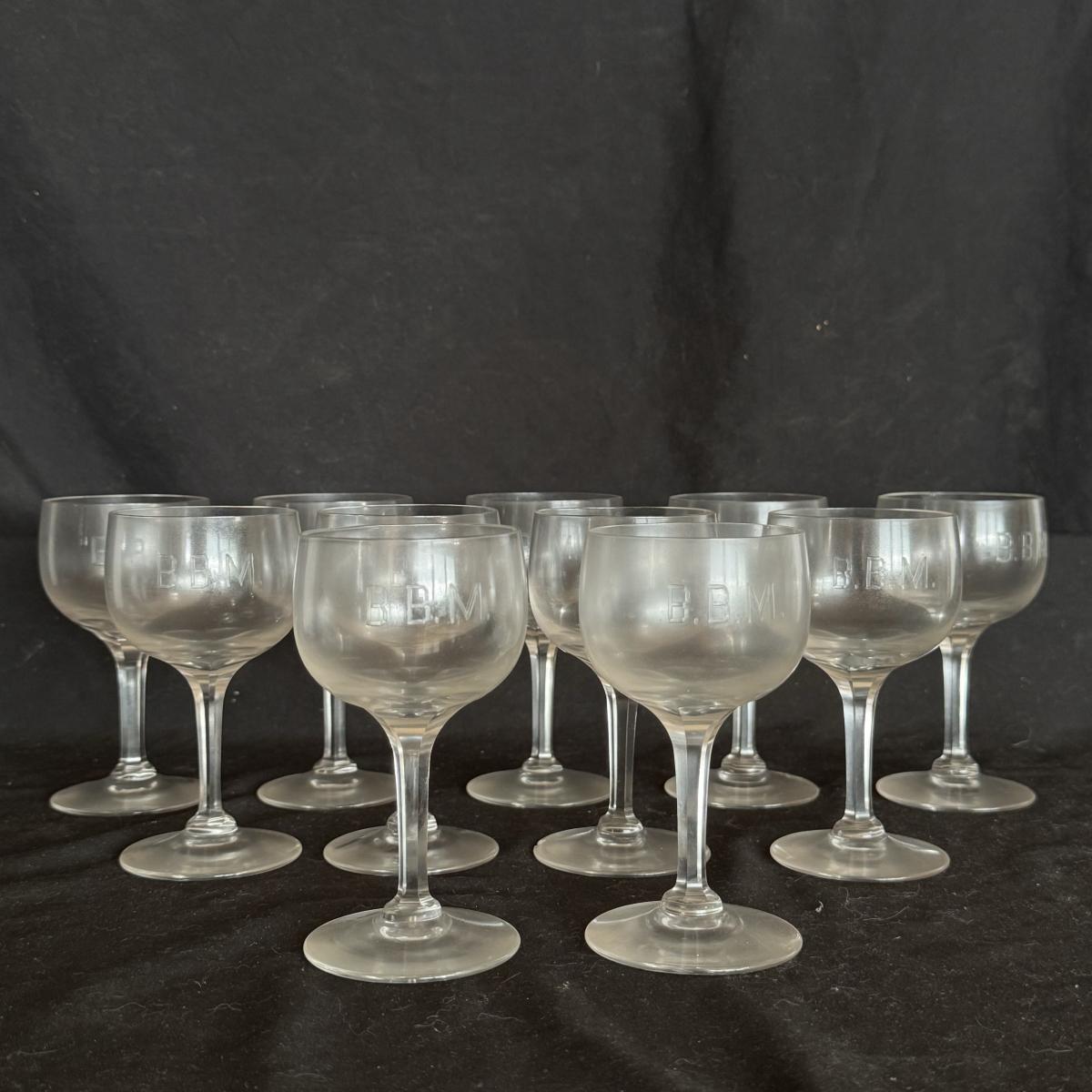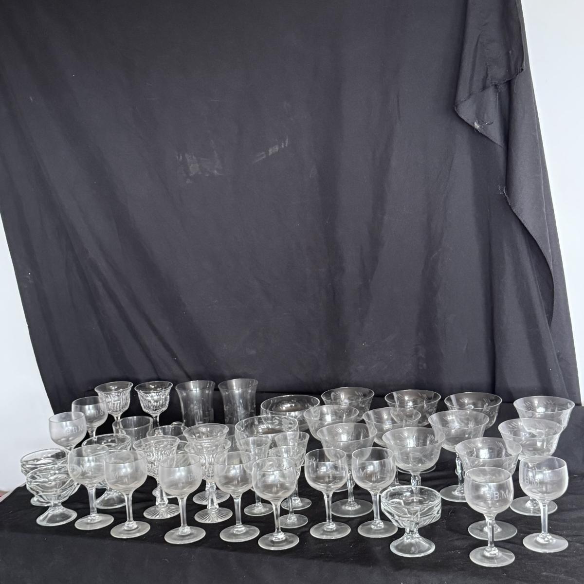 This lot includes eleven wine glasses that have B.B.M. etched on the front, eleven cocktail glasses with floral etching, and several other glassware. The B.B.M. glasses measure 2.5” x 5”H. Local pick up only.