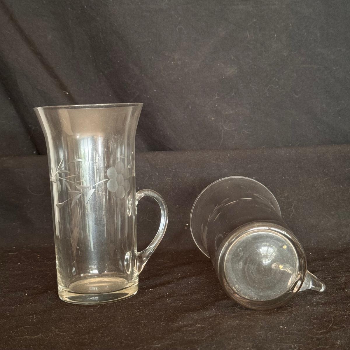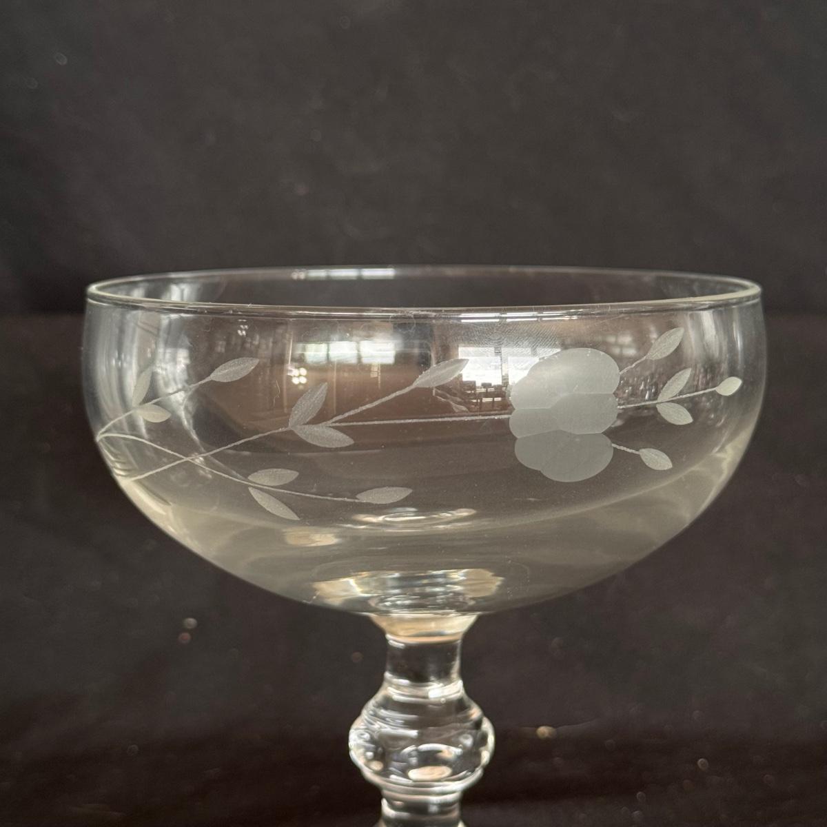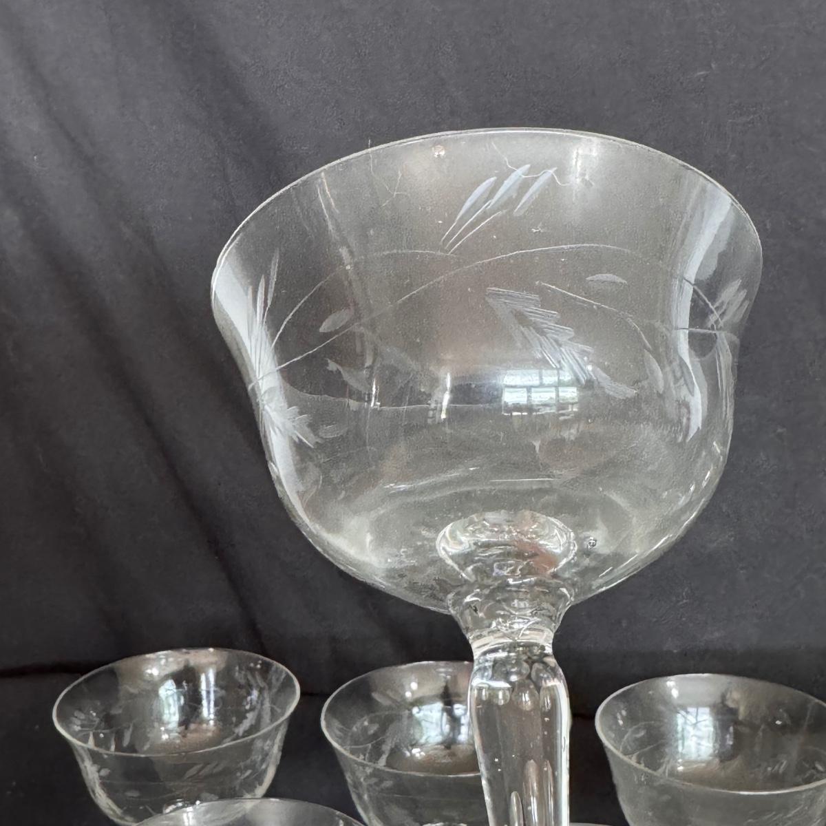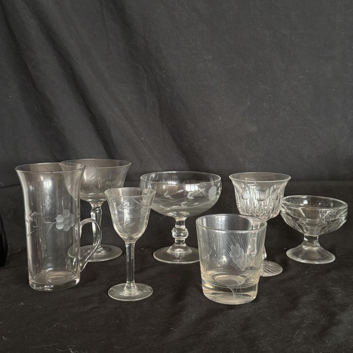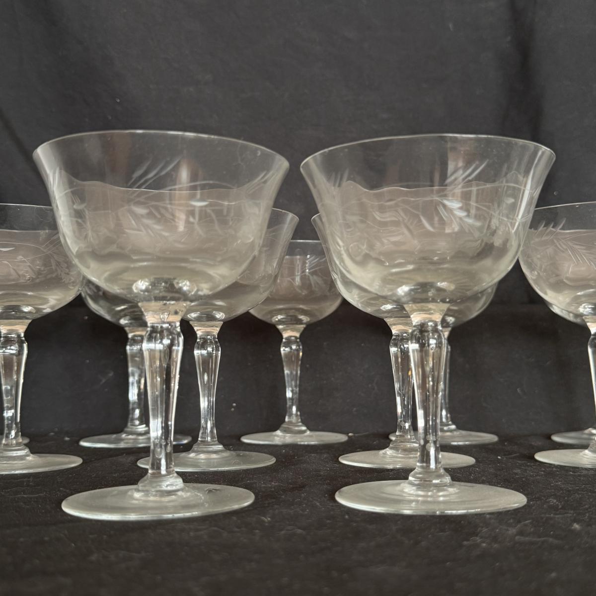 This lot includes eleven wine glasses that have B.B.M. etched on the front, eleven cocktail glasses with floral etching, and several other glassware. The B.B.M. glasses measure 2.5” x 5”H. Local pick up only.