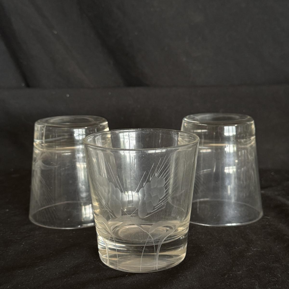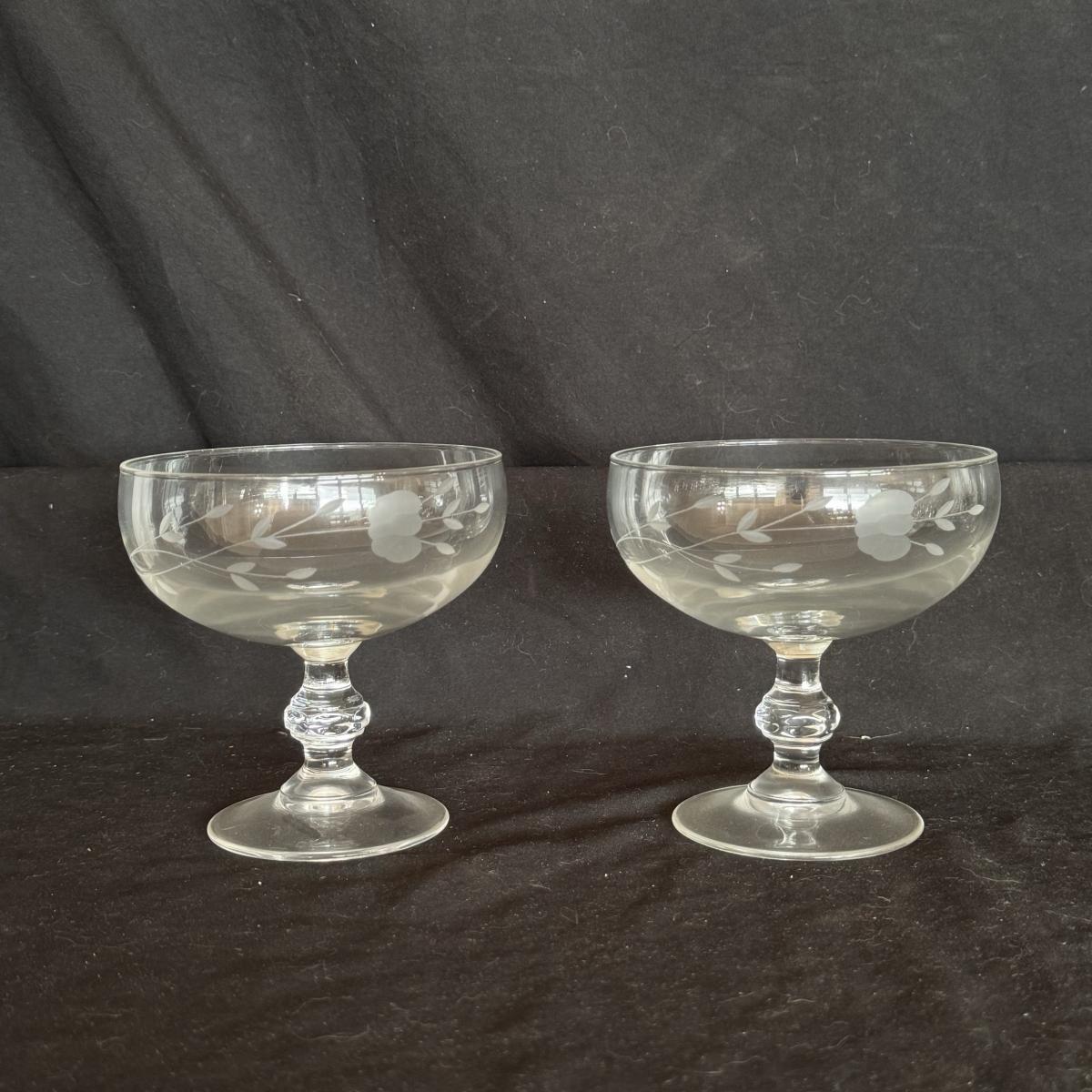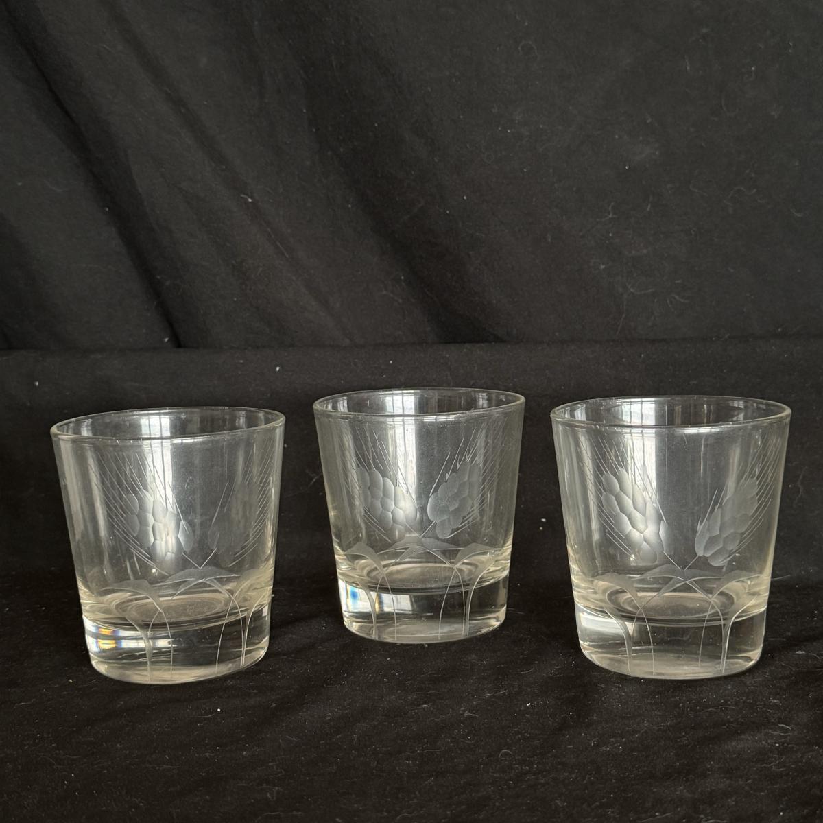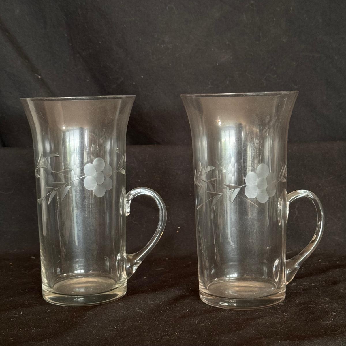 This lot includes eleven wine glasses that have B.B.M. etched on the front, eleven cocktail glasses with floral etching, and several other glassware. The B.B.M. glasses measure 2.5” x 5”H. Local pick up only.