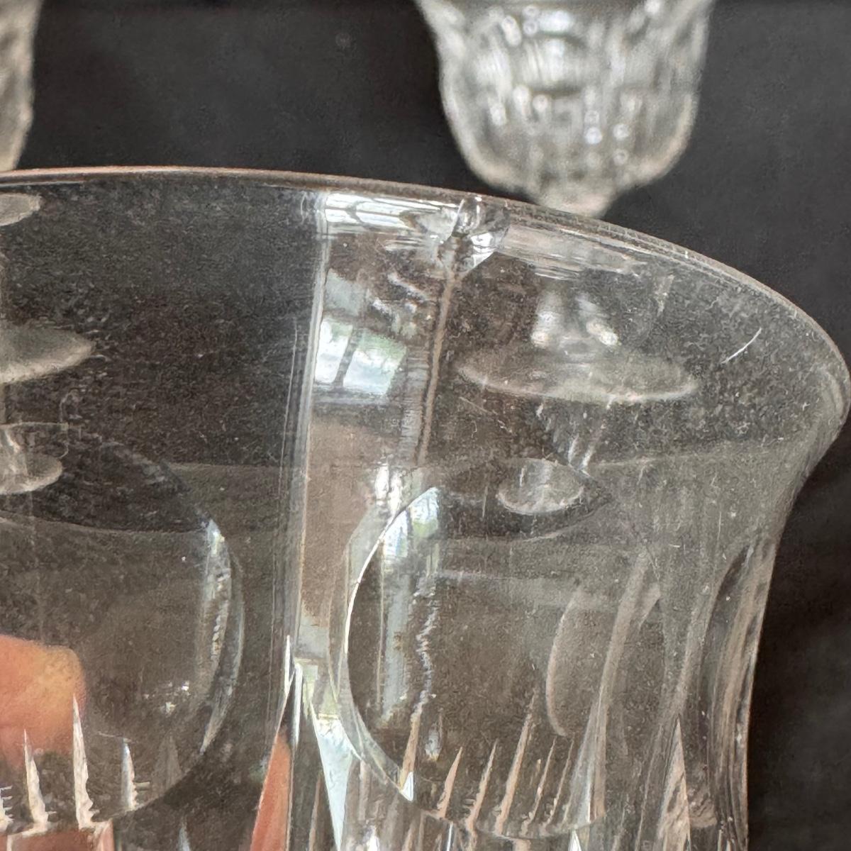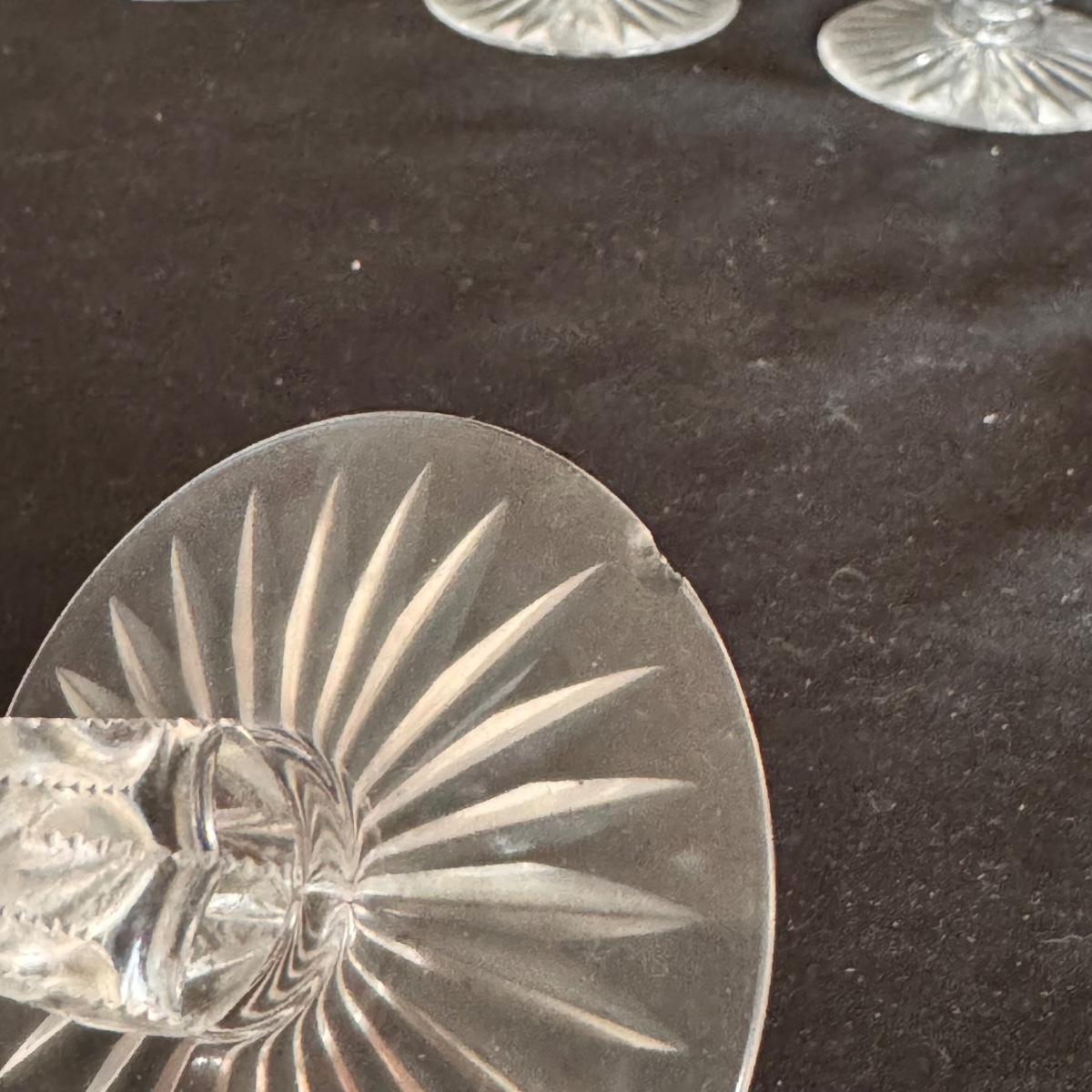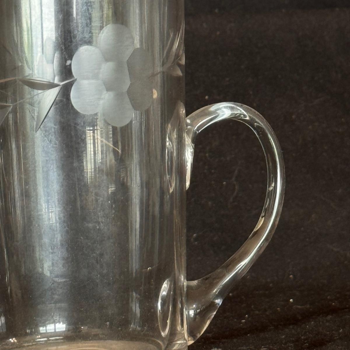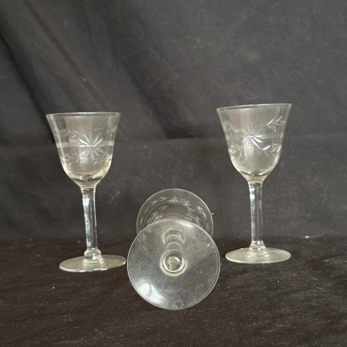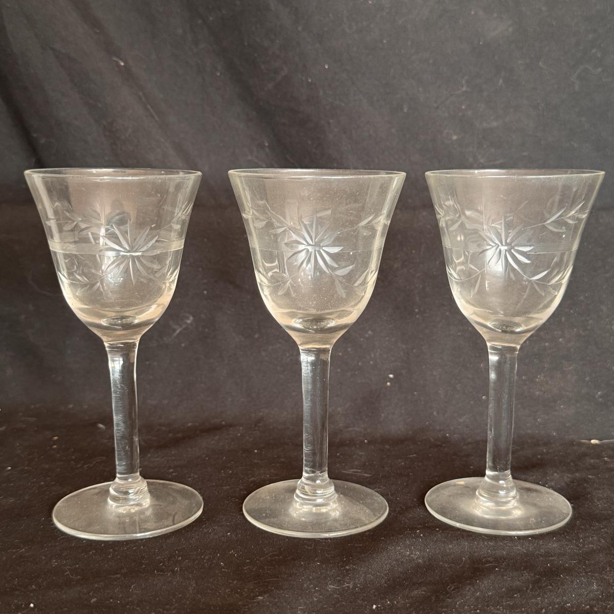 This lot includes eleven wine glasses that have B.B.M. etched on the front, eleven cocktail glasses with floral etching, and several other glassware. The B.B.M. glasses measure 2.5” x 5”H. Local pick up only.