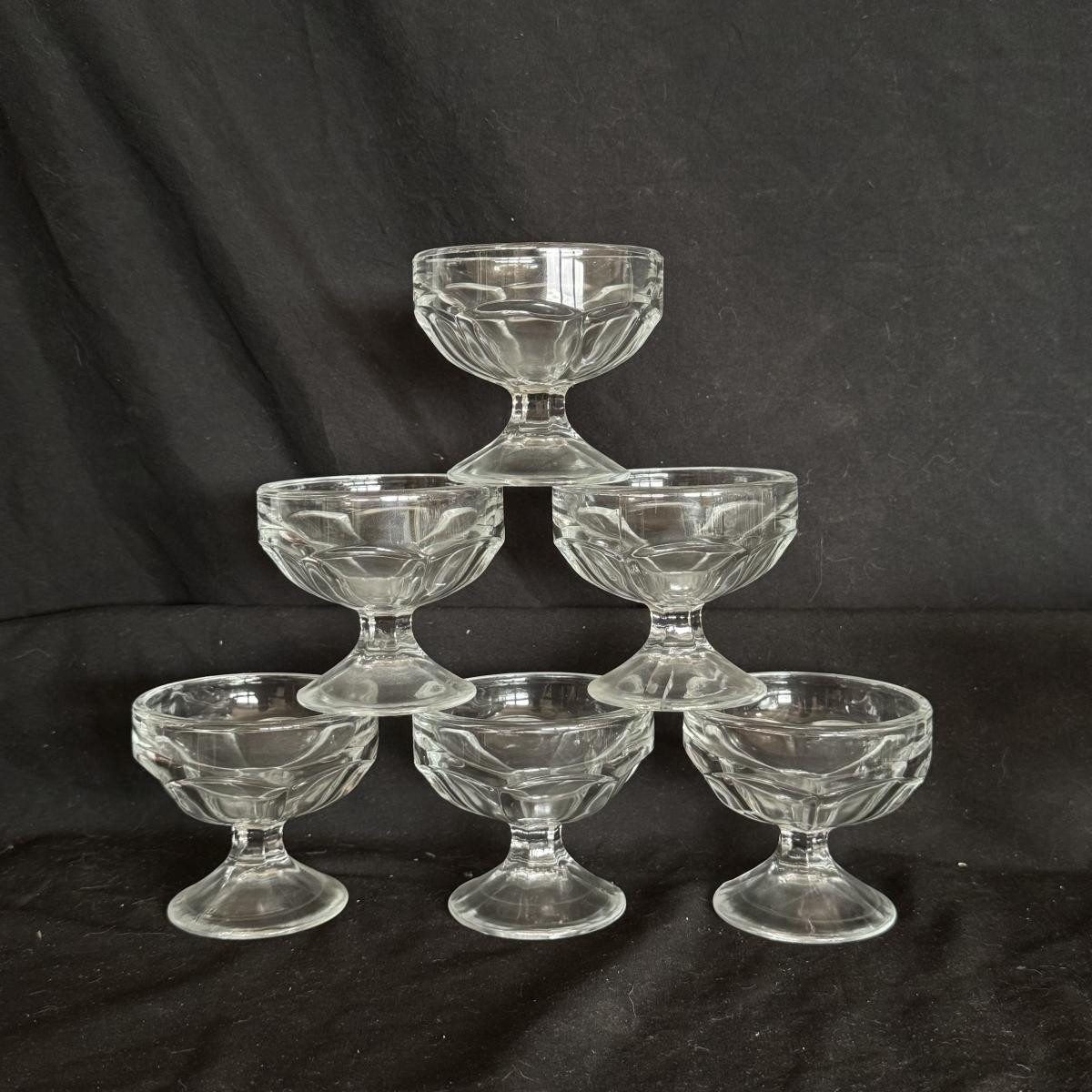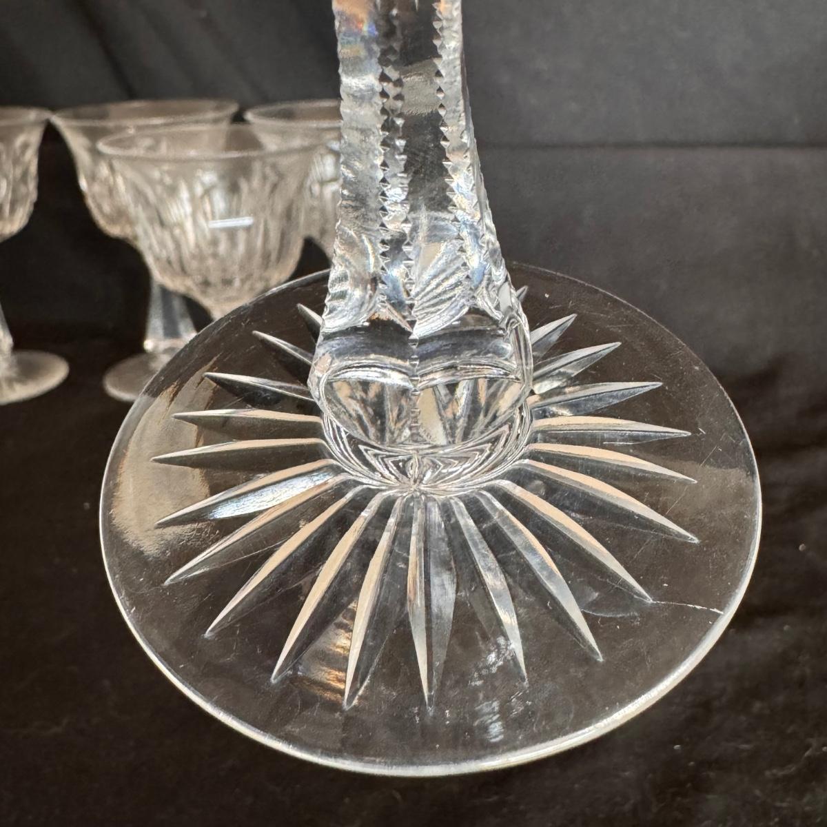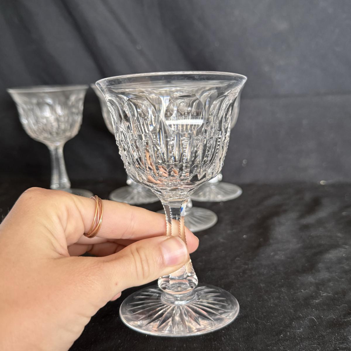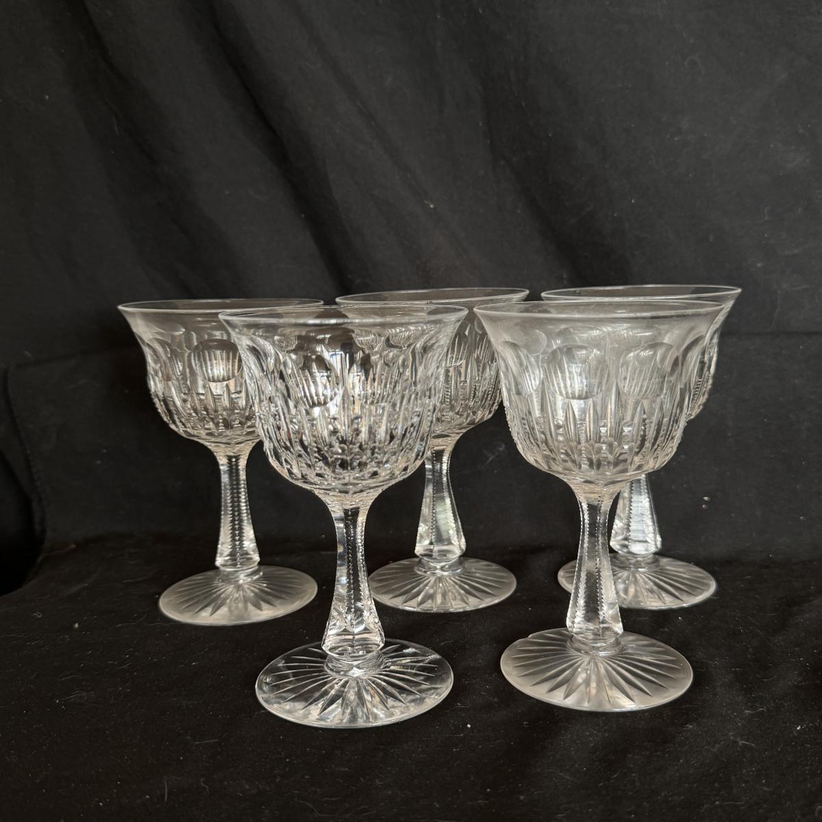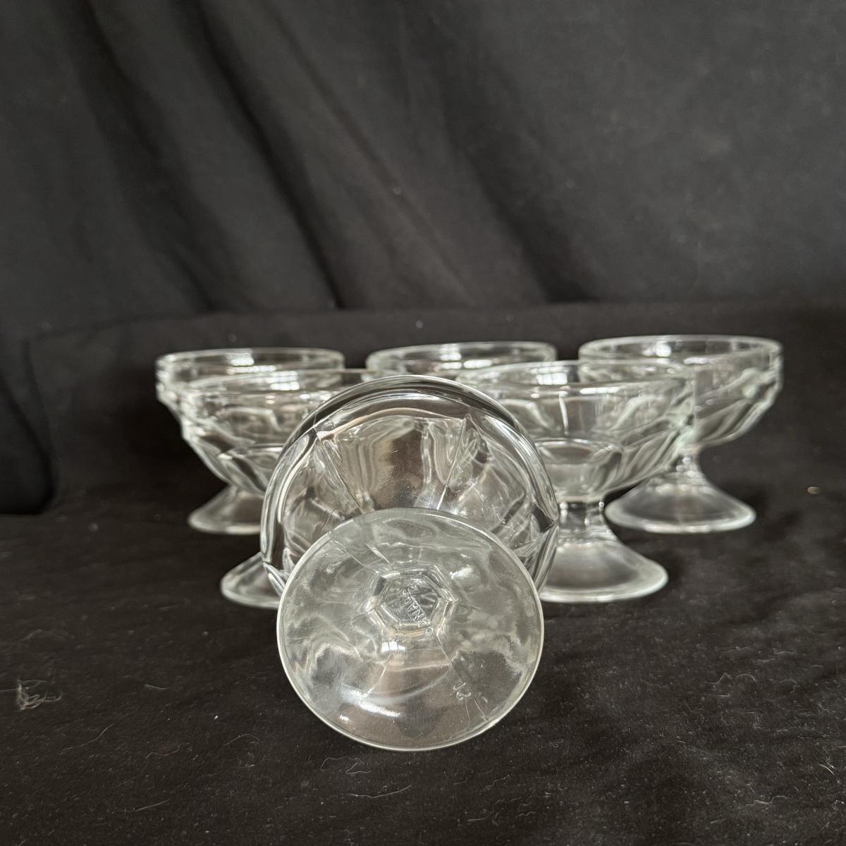 This lot includes eleven wine glasses that have B.B.M. etched on the front, eleven cocktail glasses with floral etching, and several other glassware. The B.B.M. glasses measure 2.5” x 5”H. Local pick up only.