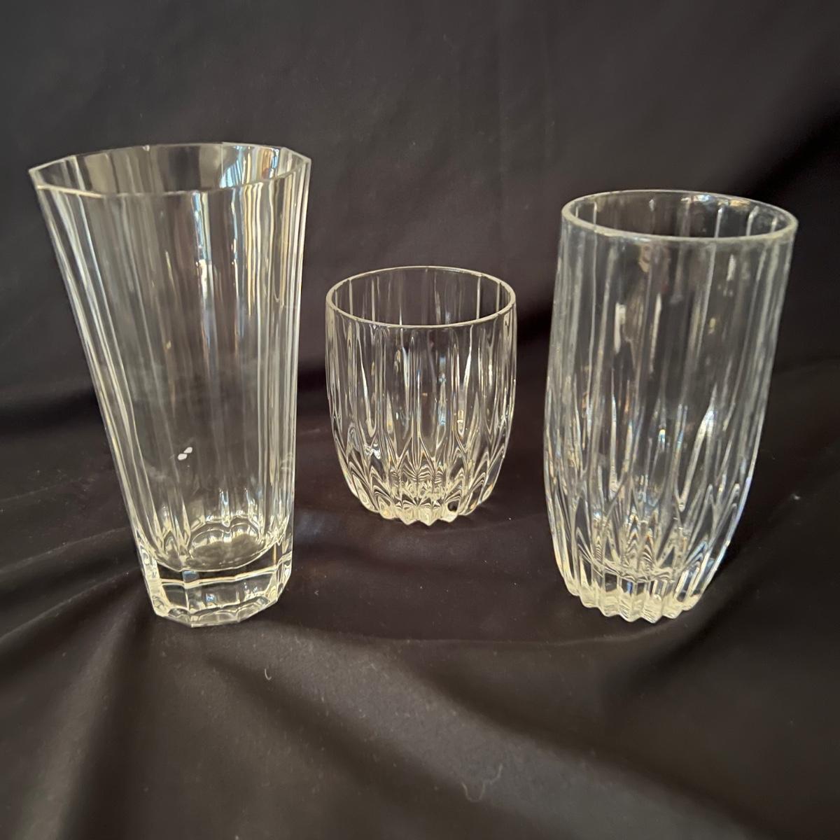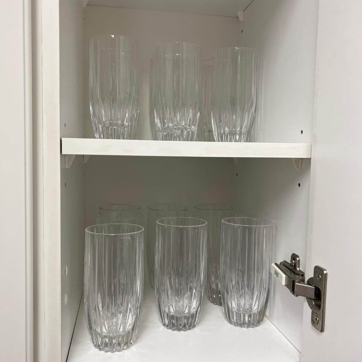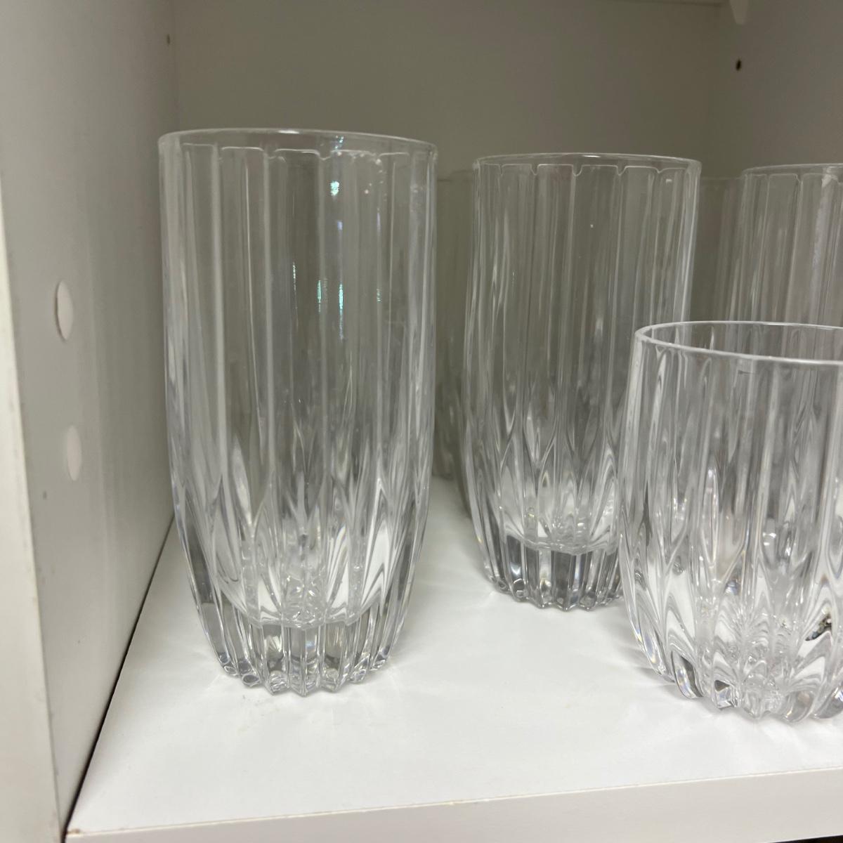 Twenty five glass tumblers in total in this lot that all are part of a matching set except for an additional four that are the tallest glasses, measuring 6” tall.