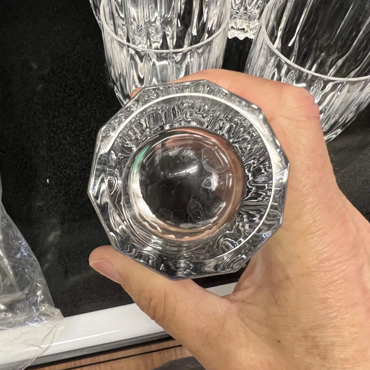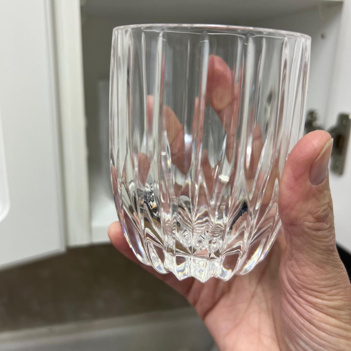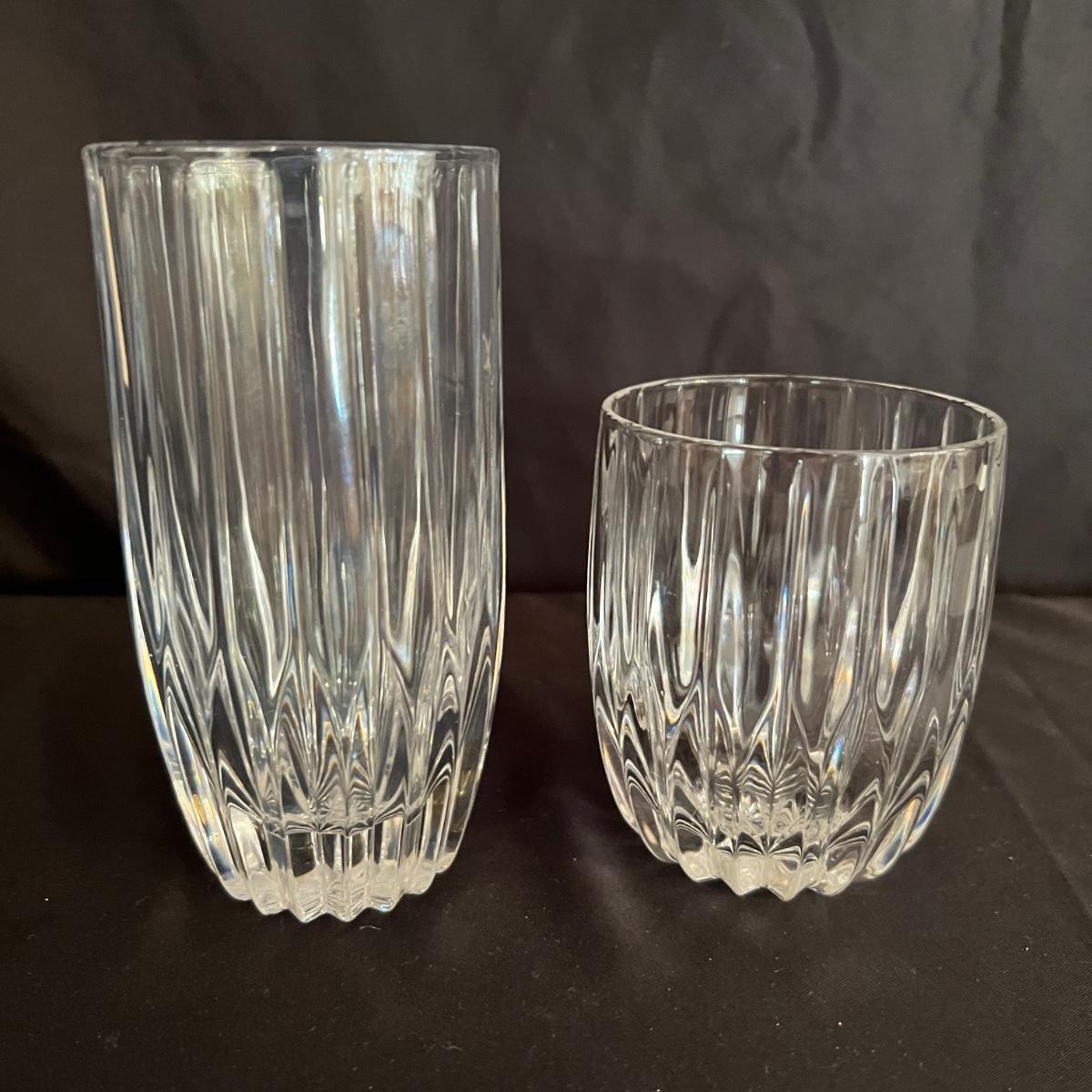 Twenty five glass tumblers in total in this lot that all are part of a matching set except for an additional four that are the tallest glasses, measuring 6” tall.