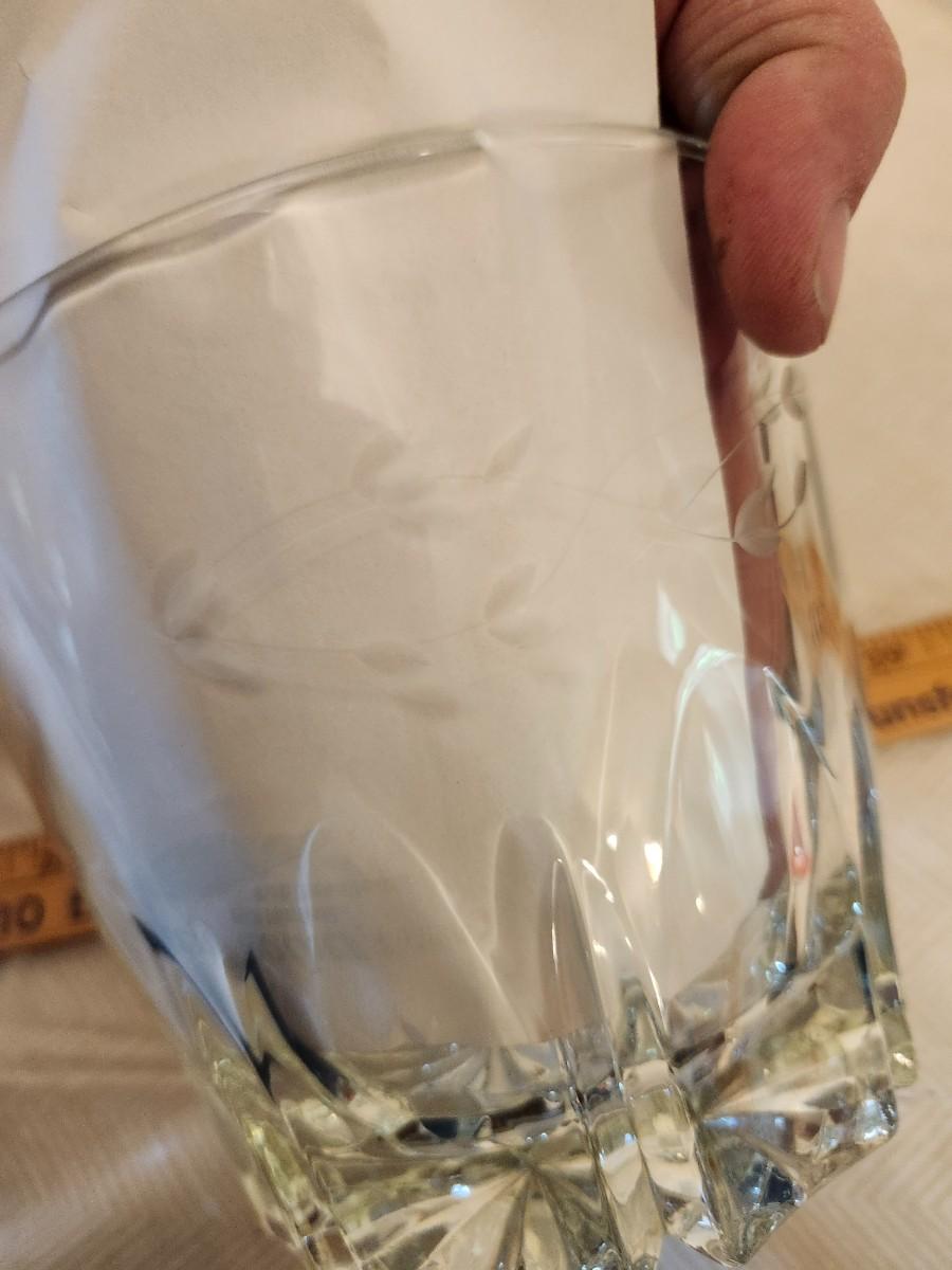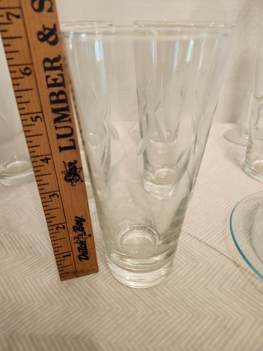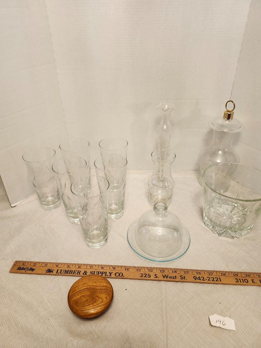 Etched Glassware lot Six Etched Tumbler, ice bucket, vase, butter dish etc.