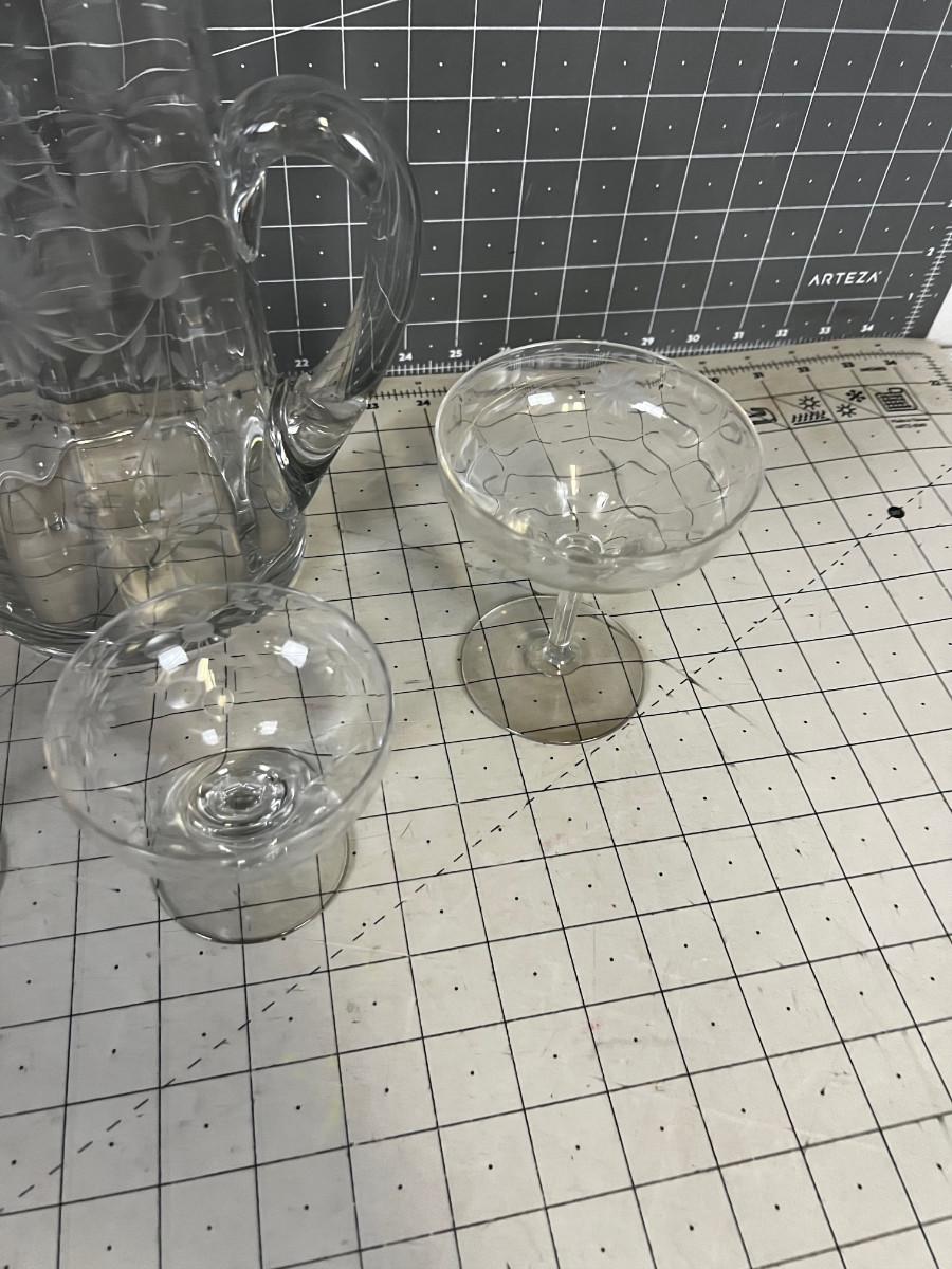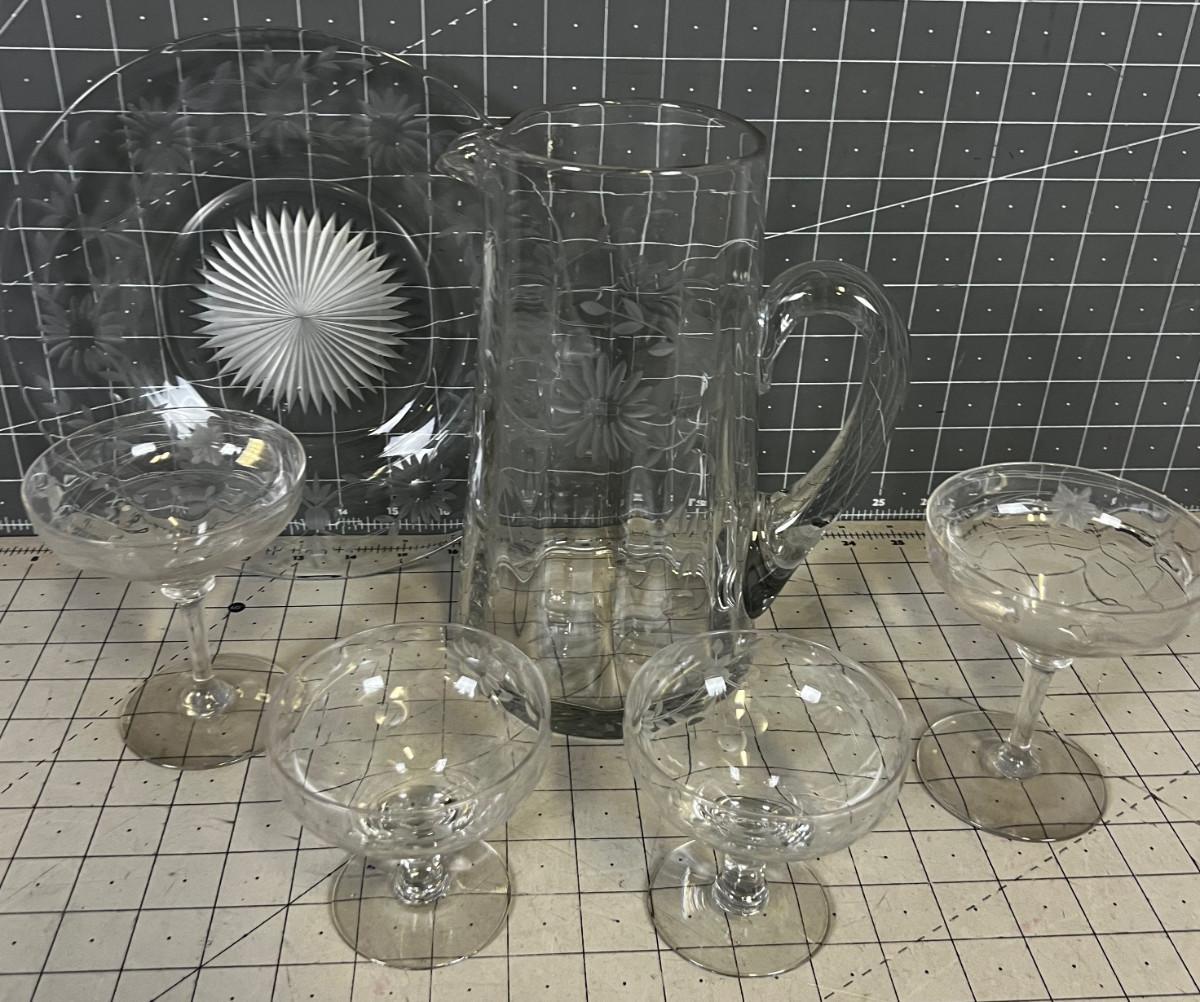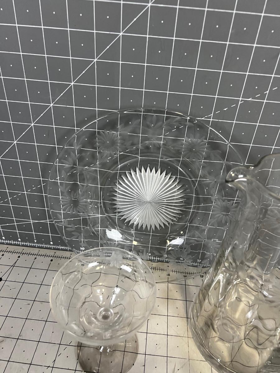 Etched Glassware, Pitcher, Plate, 2 Glasses, DAISY Pattern