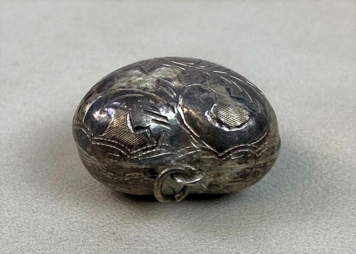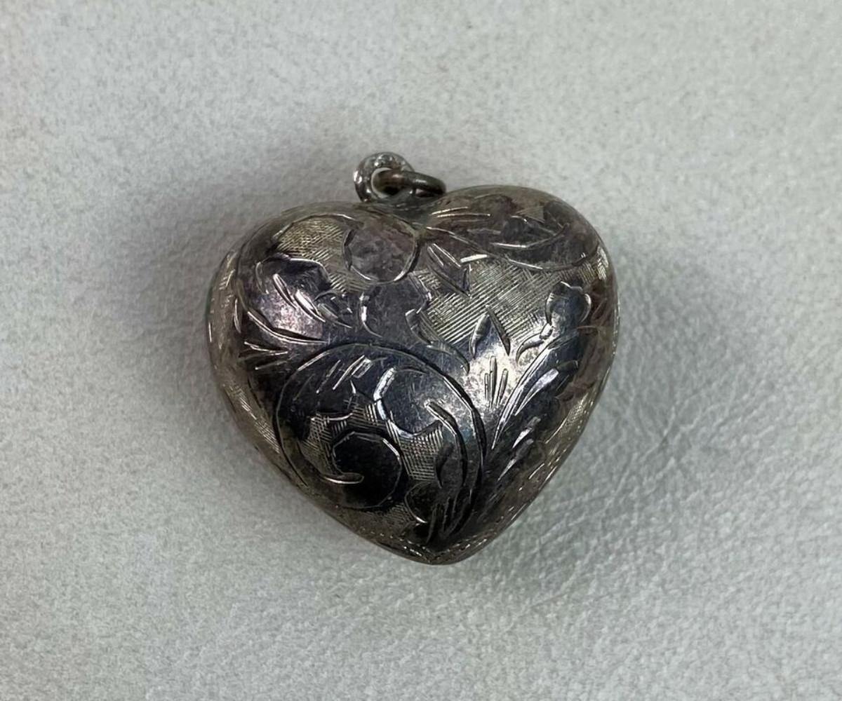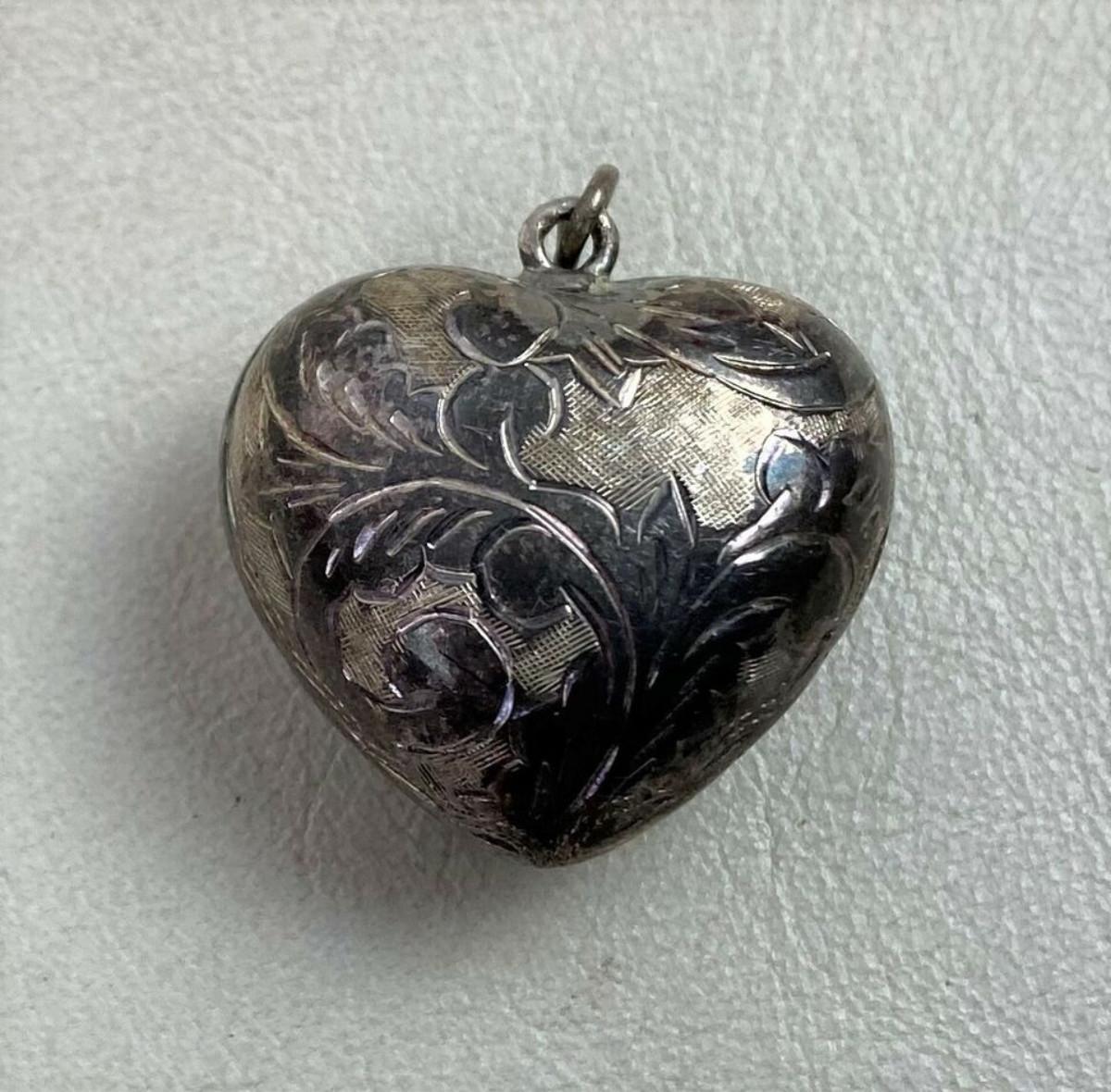 Good condition on this intricately etched puffy heart pendant..Double sided...Silver plated I believe...1" x 7/8"...Unmarked...No chain...As shown...I have left patina as is.