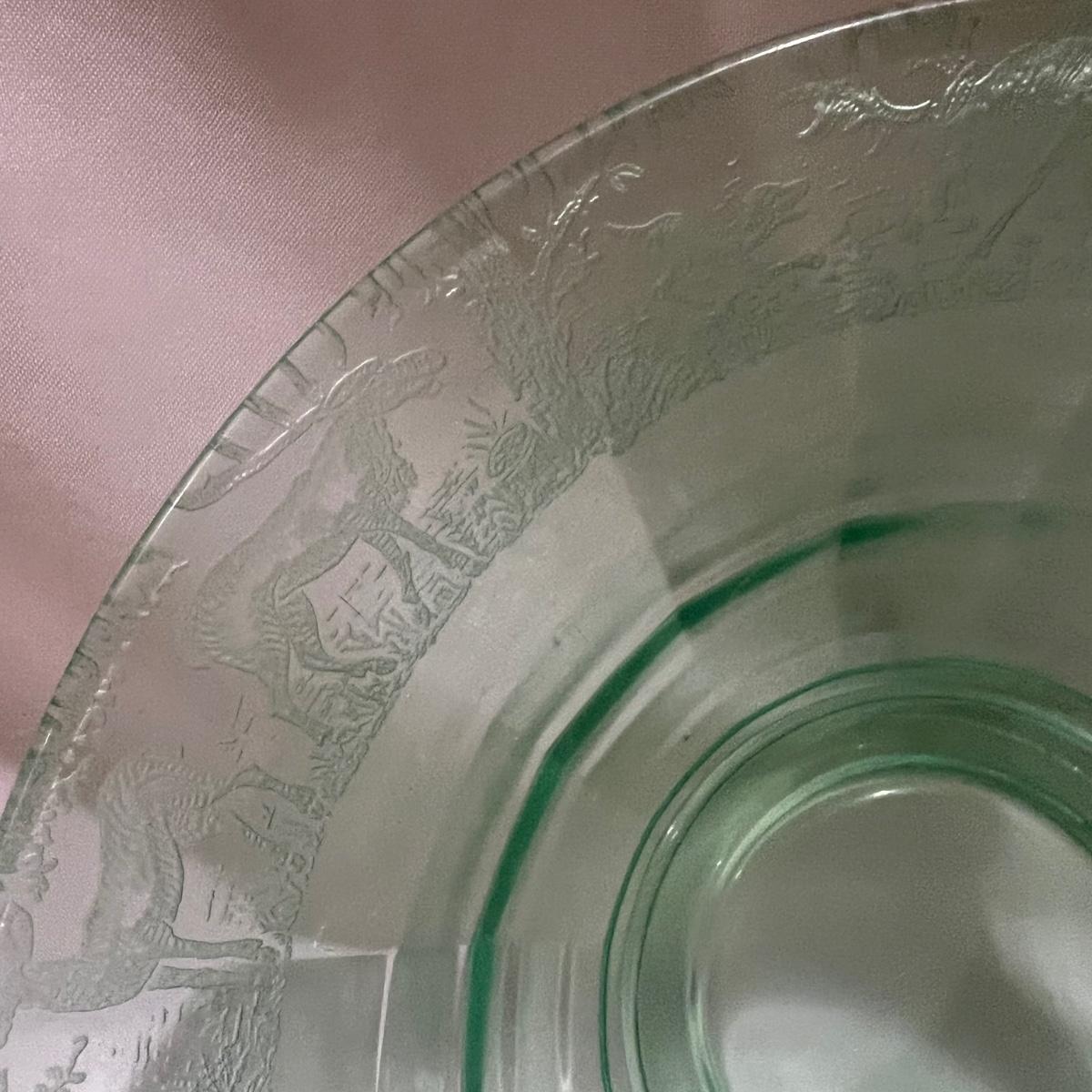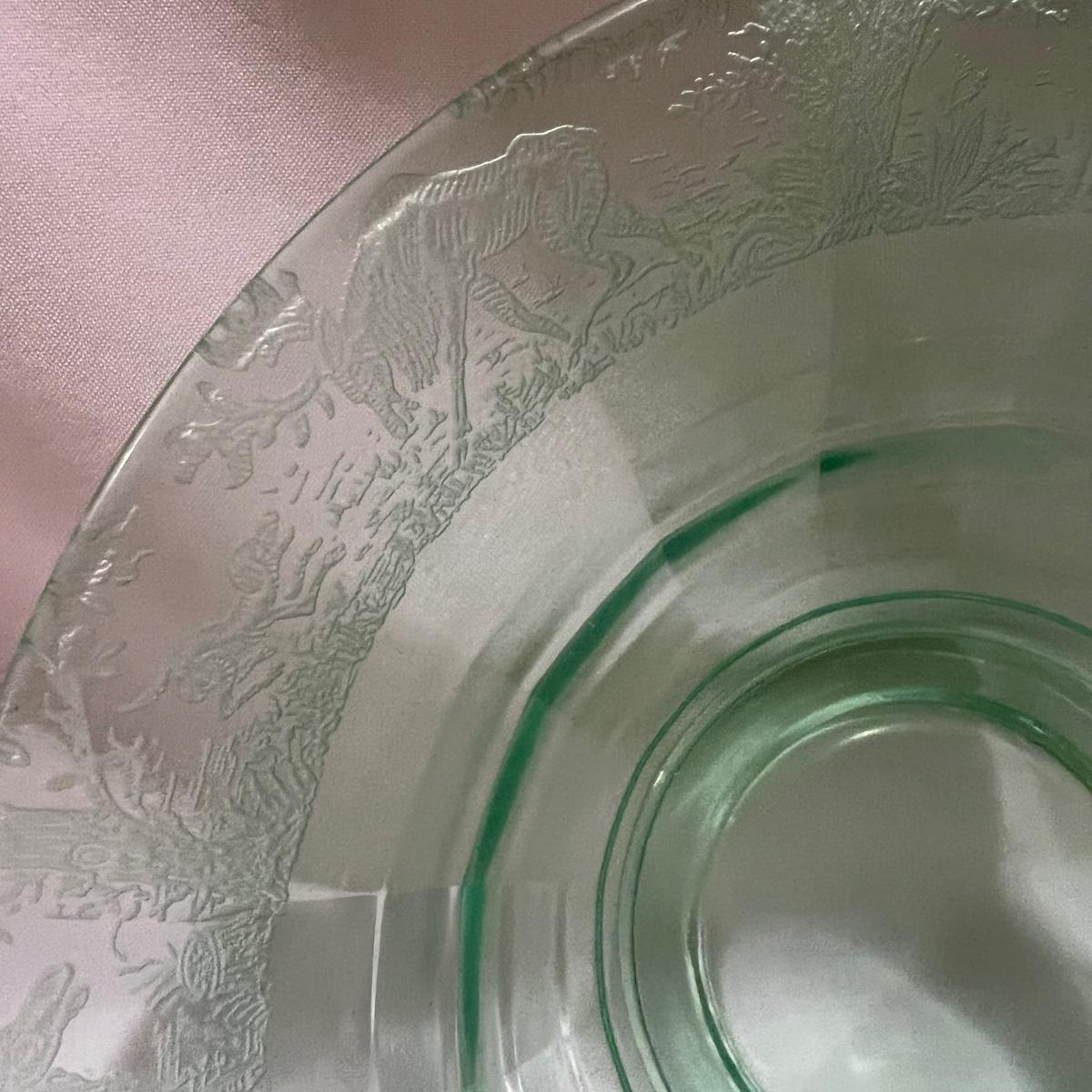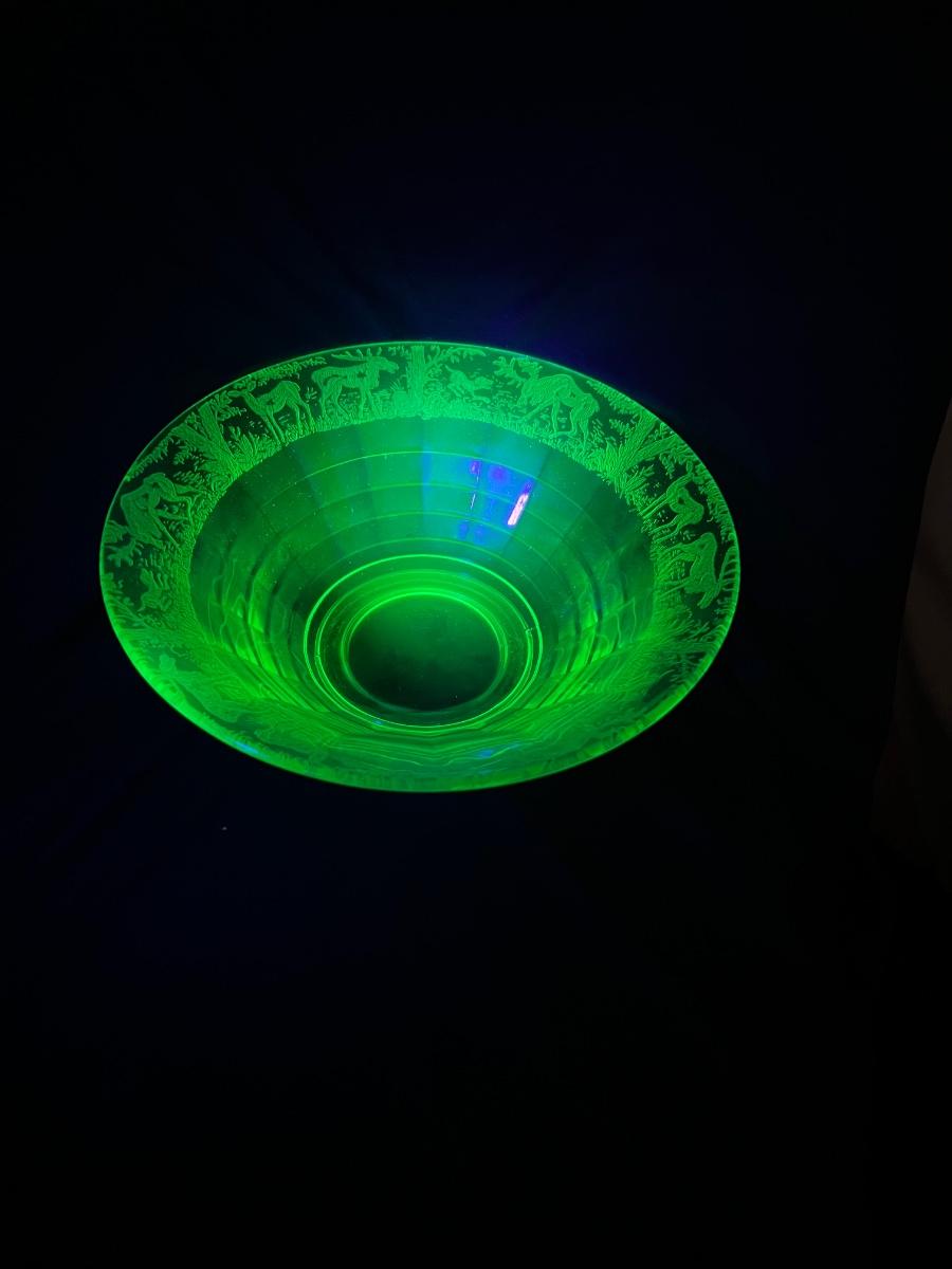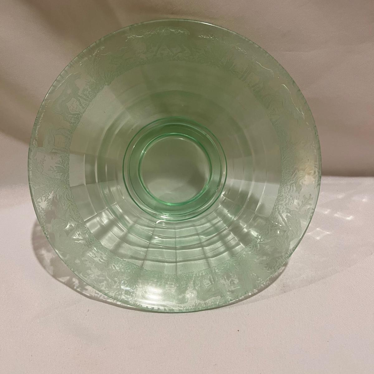 Stunning 11”D etched uranium glass bowl (with moose and deer), also a beautiful pitcher complements, and makes this a rare find and a lovely set. Pitcher is approximately 7” x 8” x 9”H.
