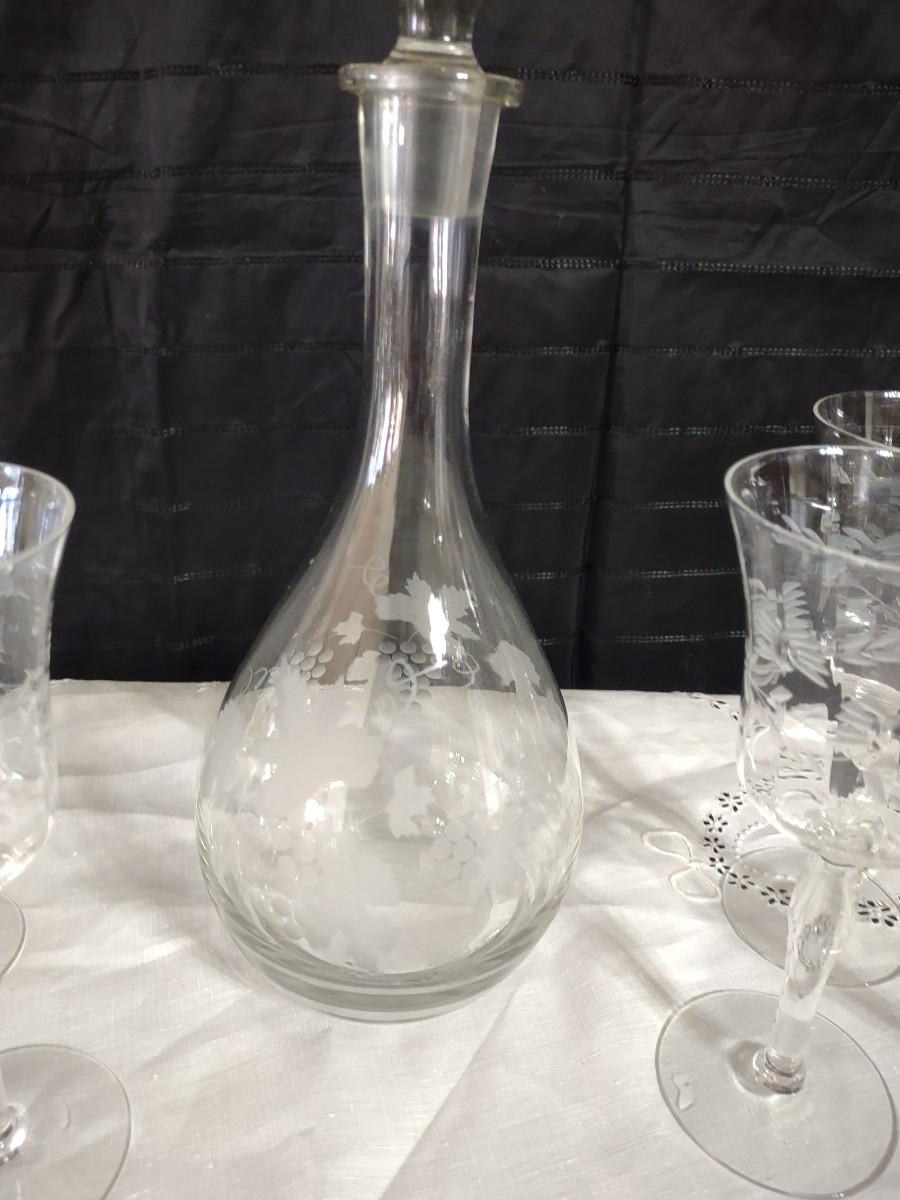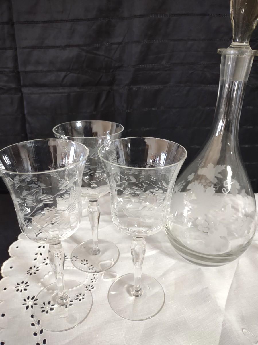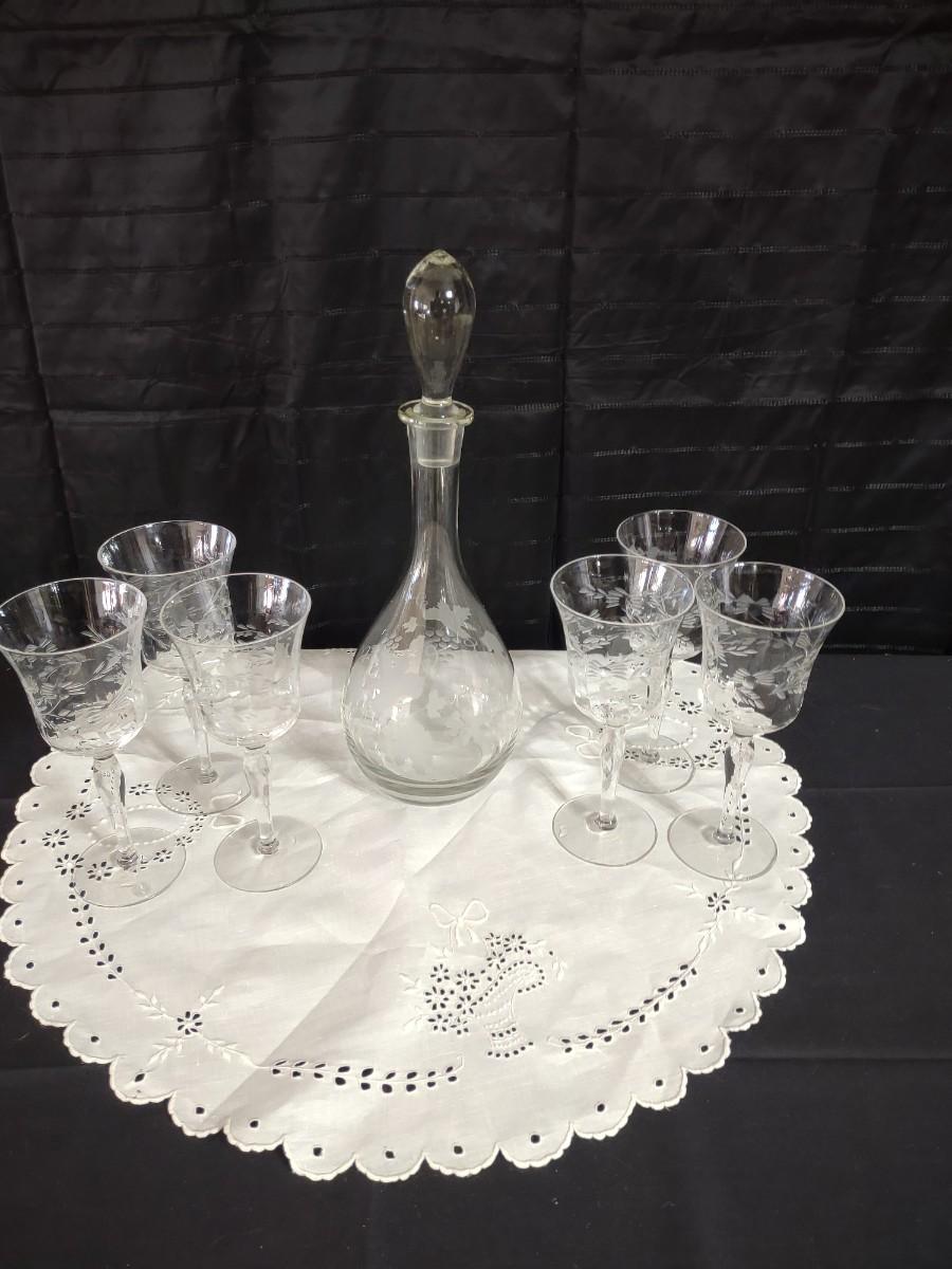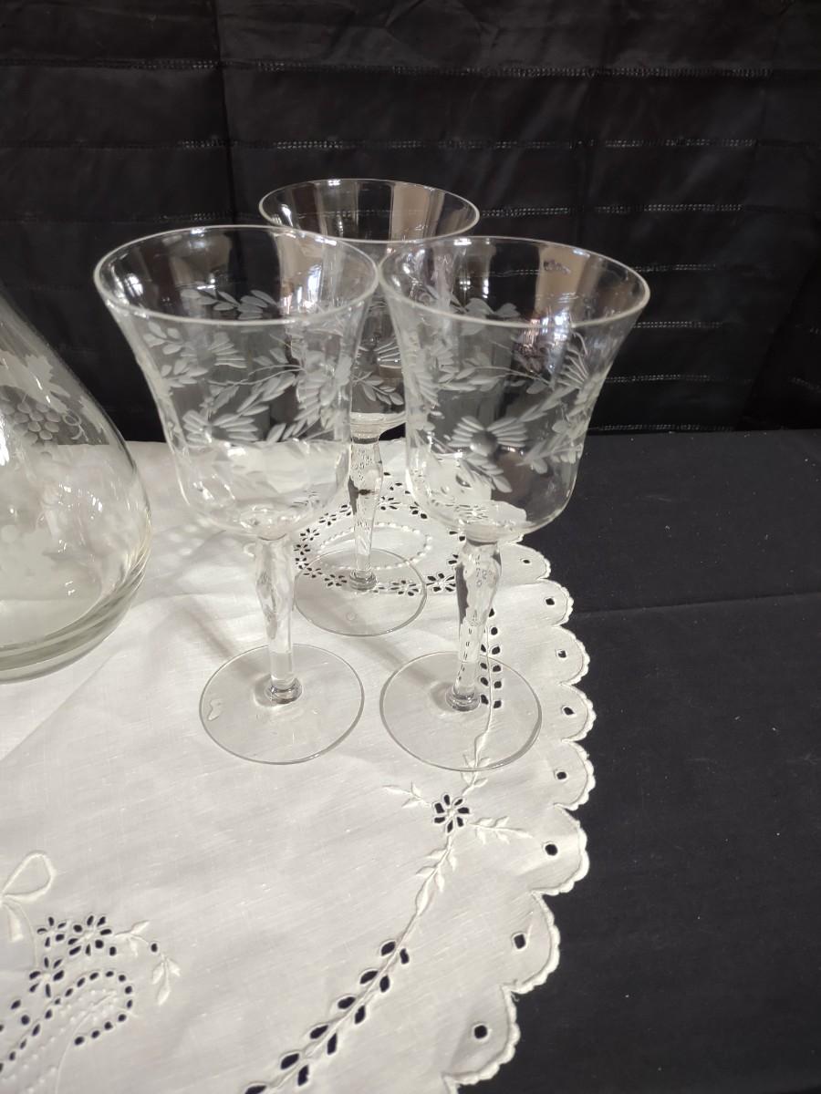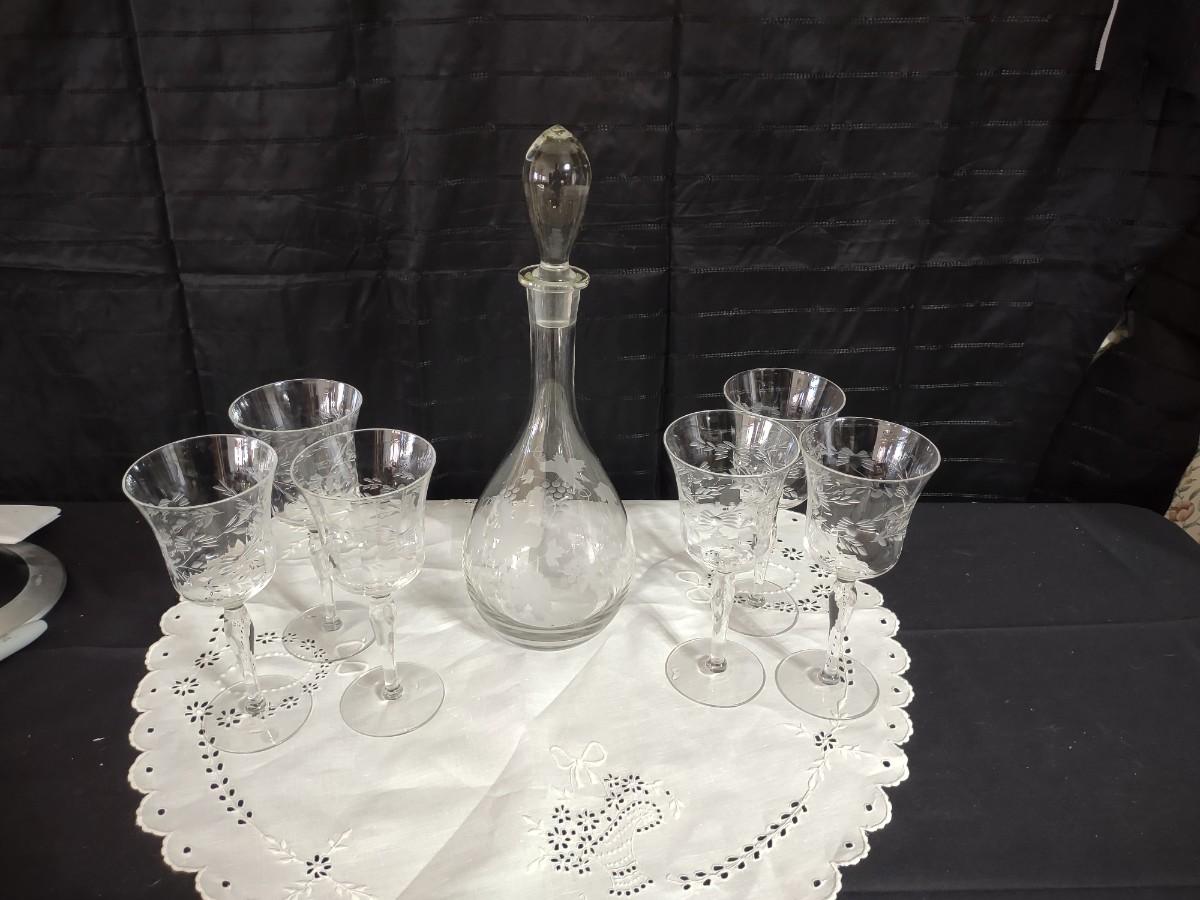 ETCHED CRYSTAL WINE DECANTER W/ WINE GLASSES
