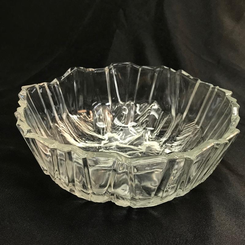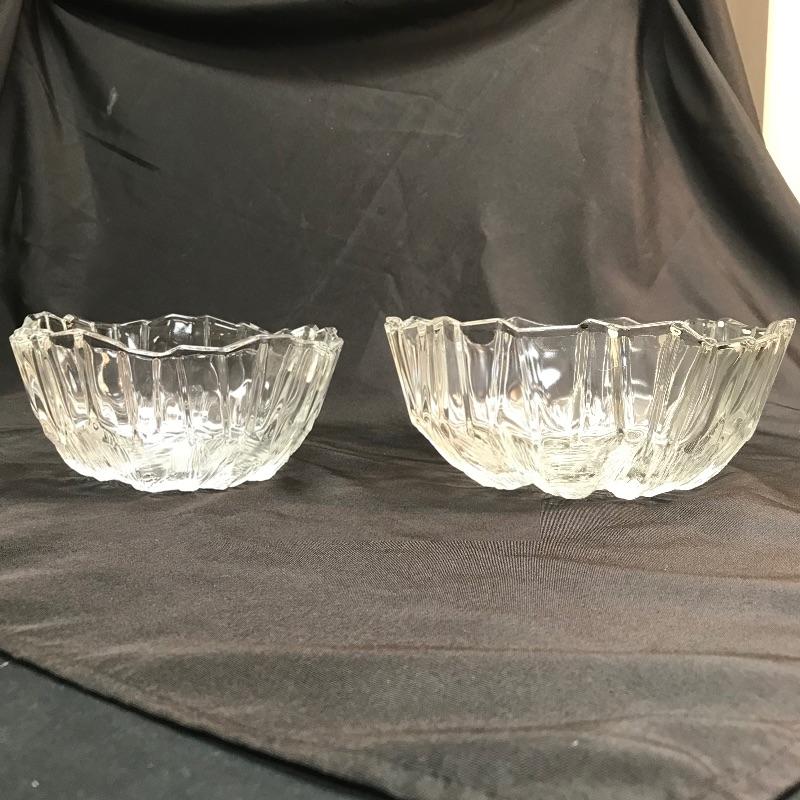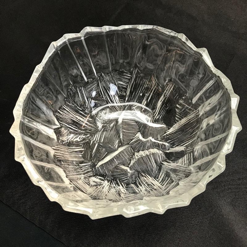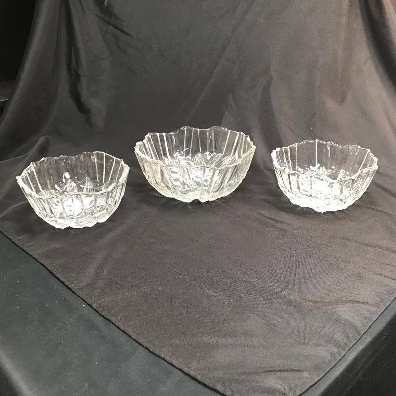 Up for auction is a set of three etched, jagged-edge, glass bowls. They’re unmarked on the bottom. The two smaller ones measure 7 3/4 inches in diameter. The large one measures 9 7/8 inches in diameter.