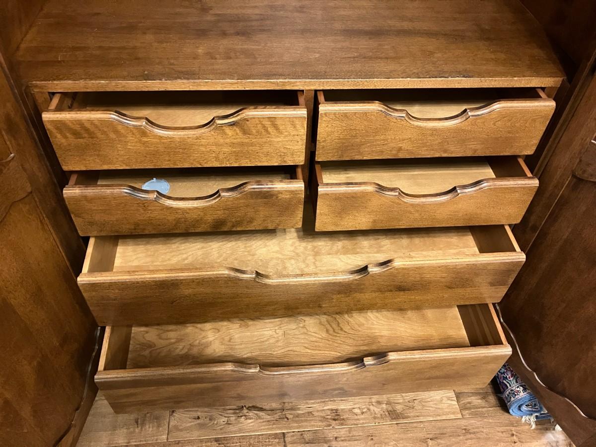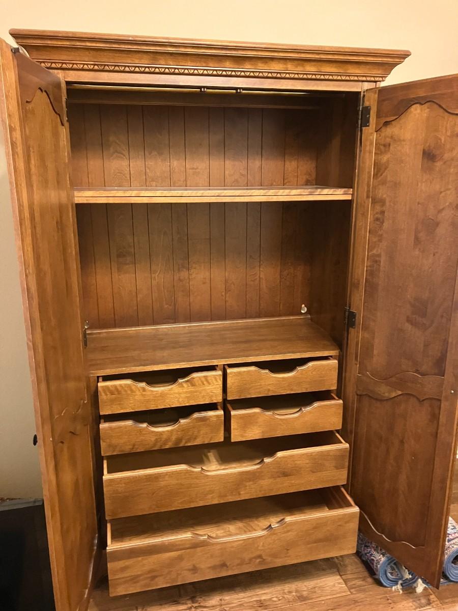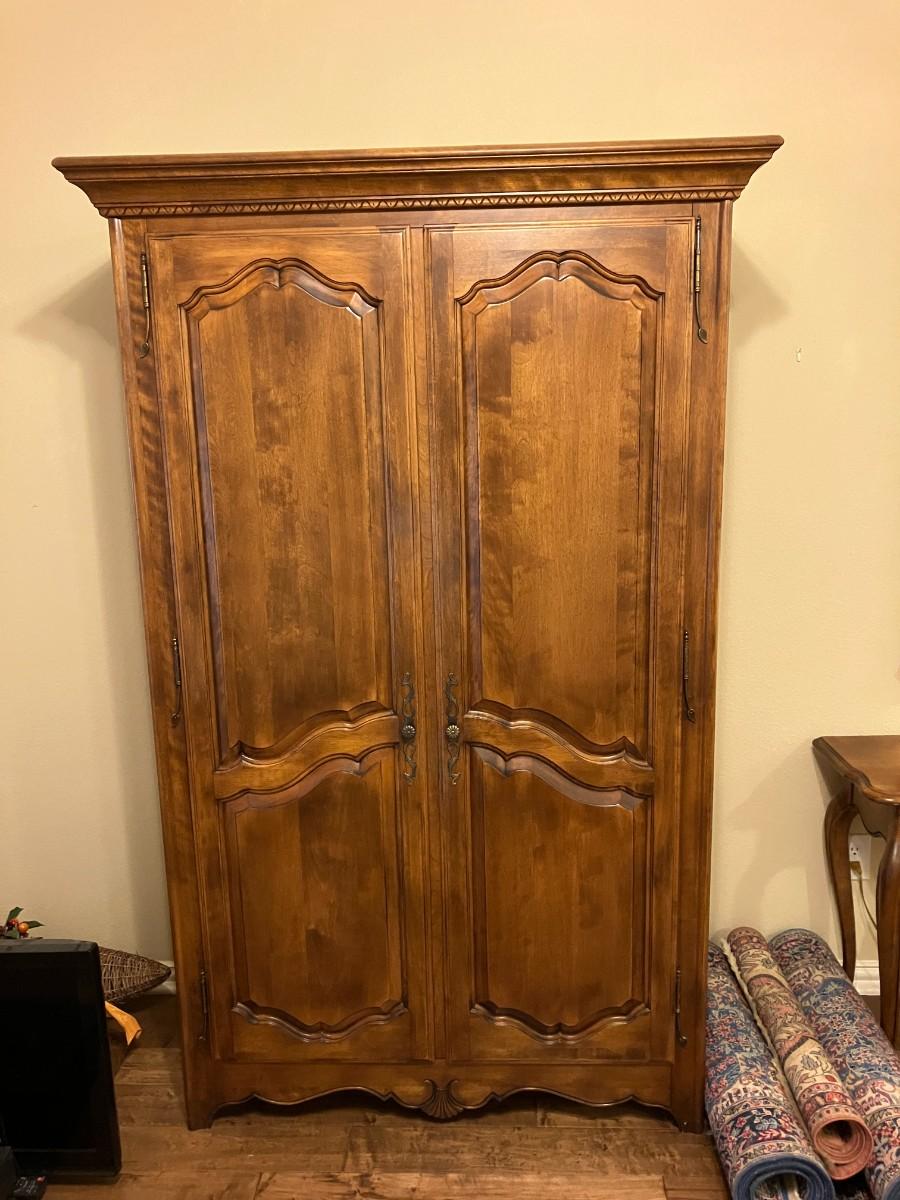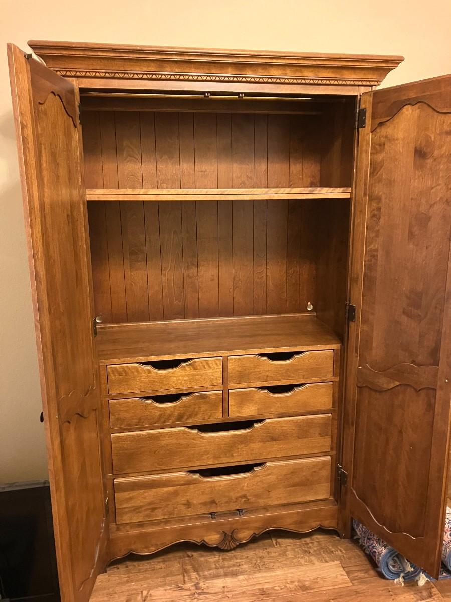 Beautiful and functional! This armoire boasts multiple shelves and drawers for storage! Great as extra closet space, craft or linen storage and more! Could be utilized without front doors as a storage or display piece. 76" H x 43" W x 19" D