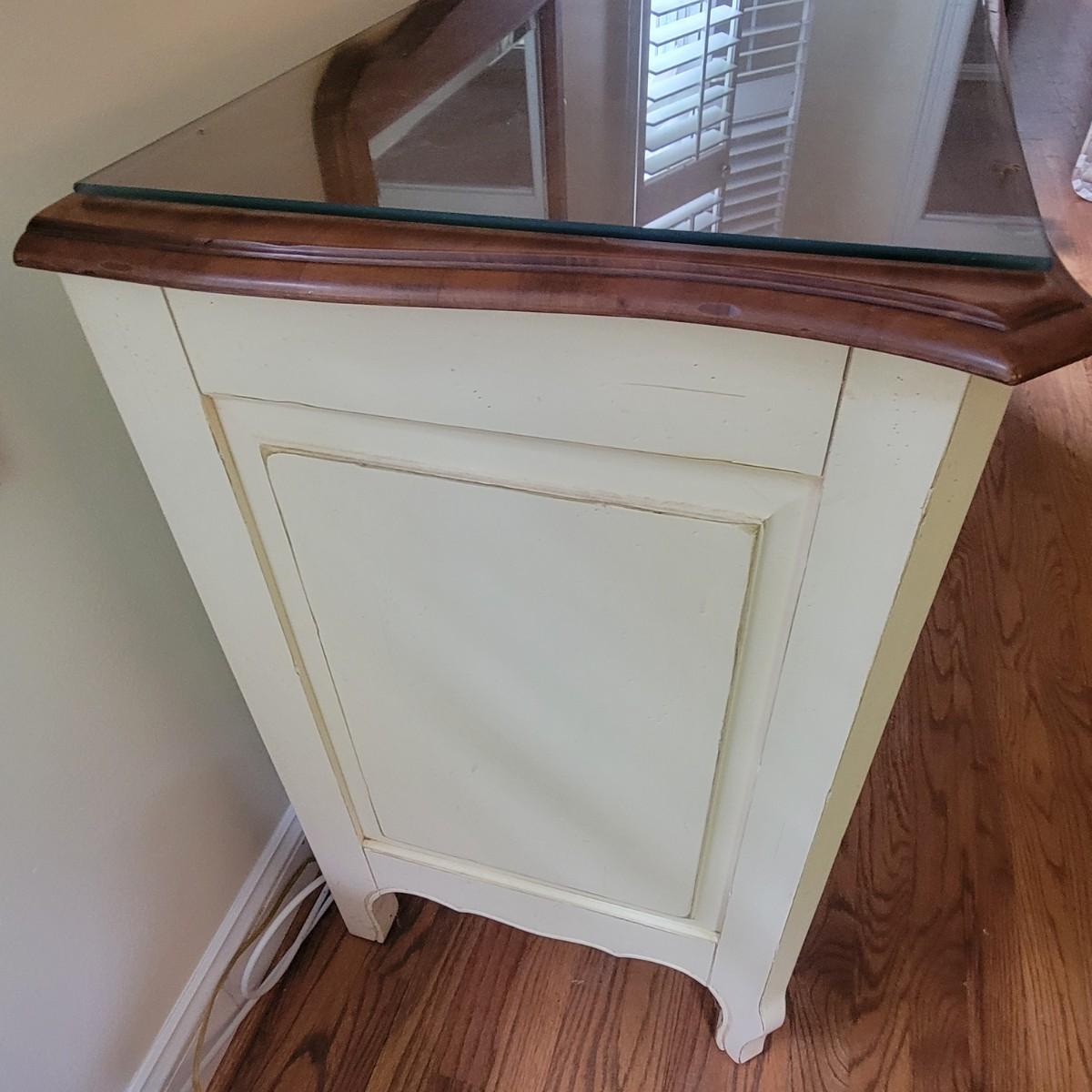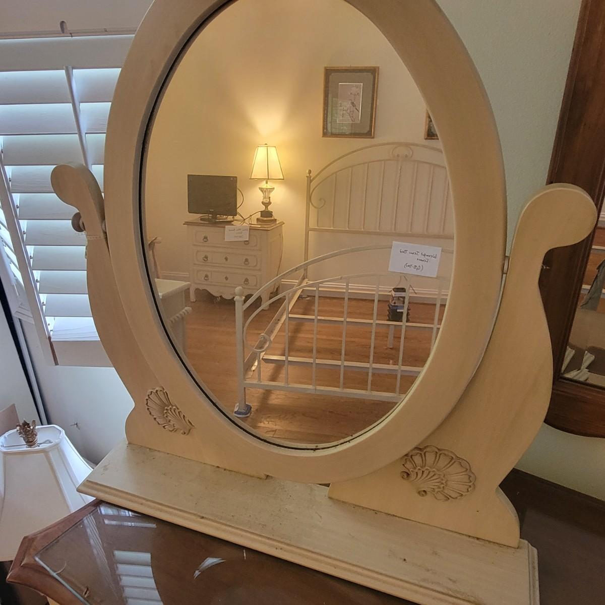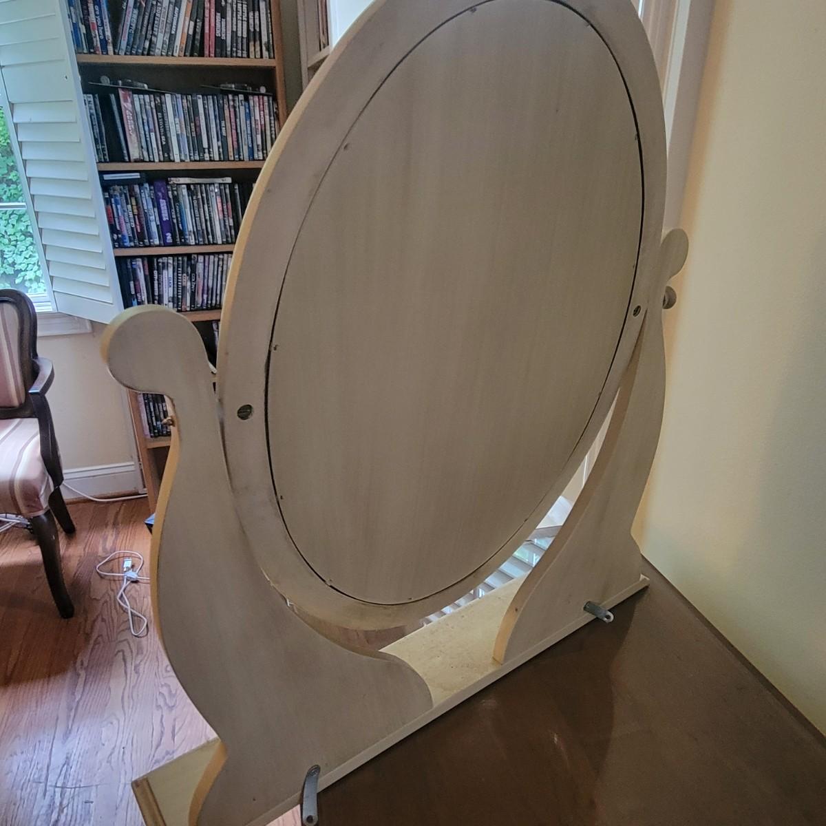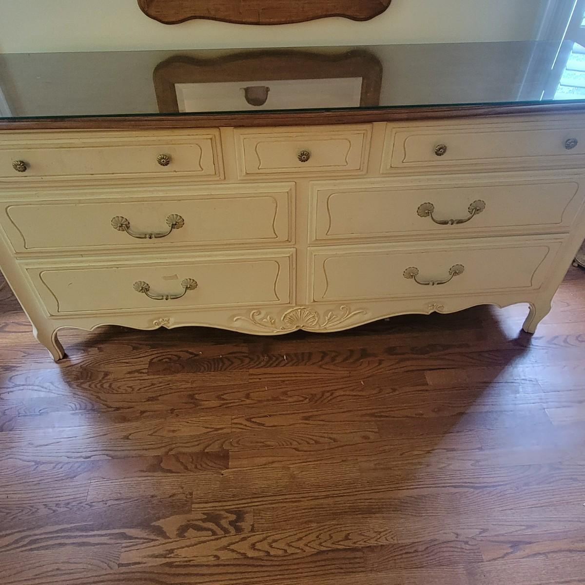Bedroom dresser hand crafted by Ethan Allen features dovetailed drawers and a tempered glass top. Measures approximately 89" x 19.5" x 33" Matching mirror swivels and has mounting brackets to attach to dresser. Measures approximately 23" x 4" x 24" Local pickup only