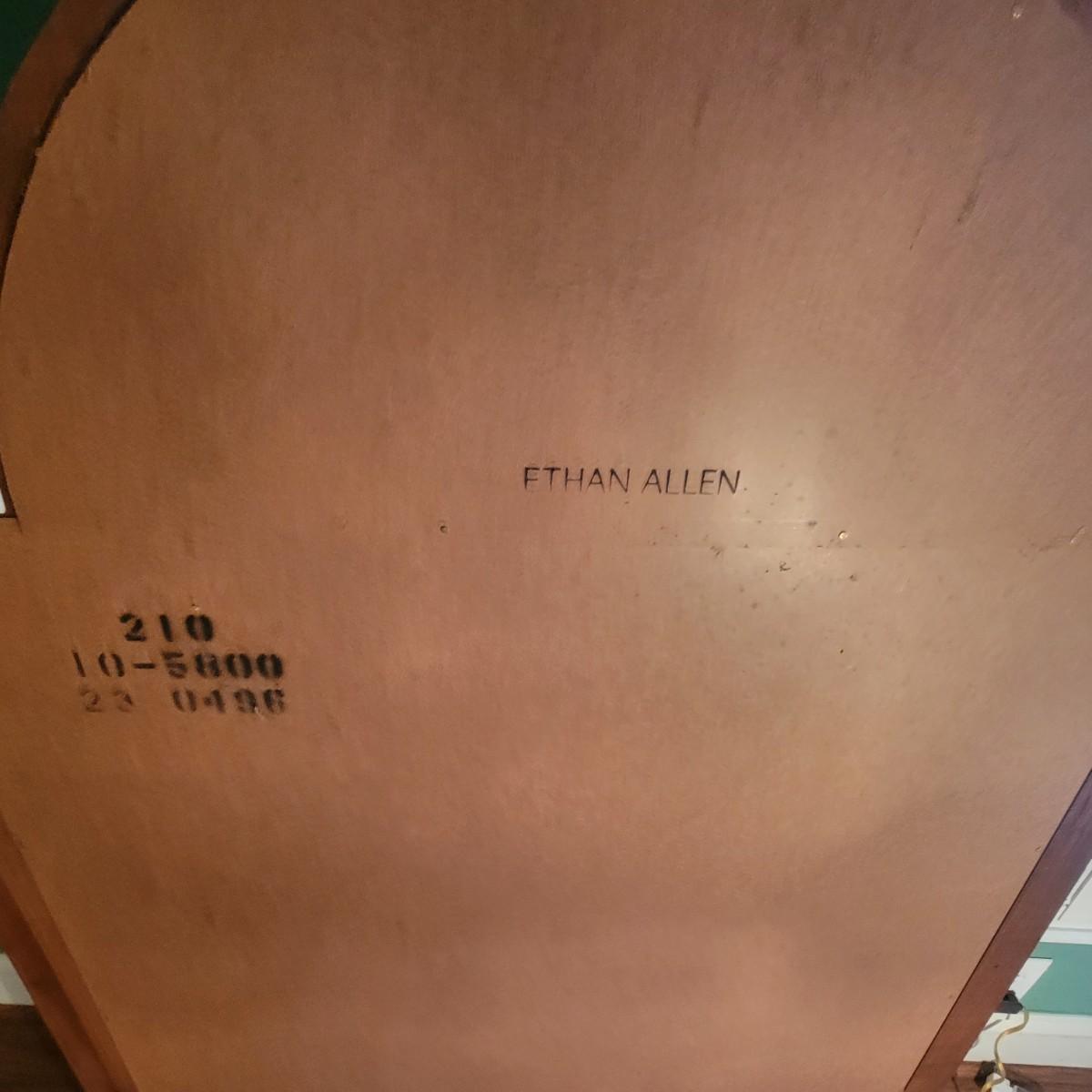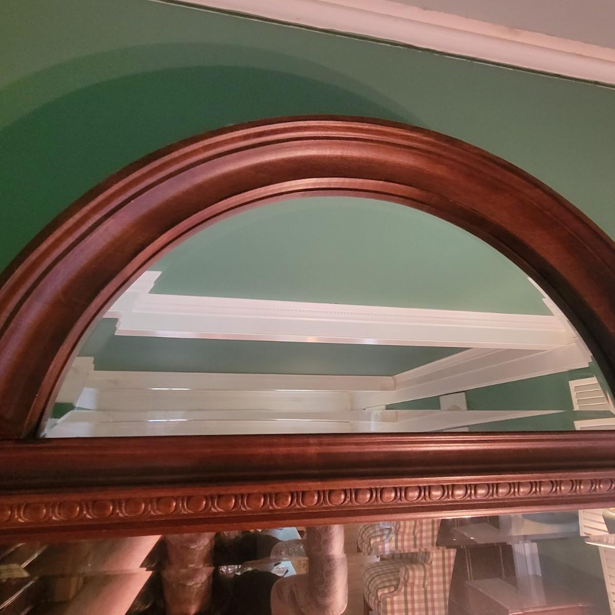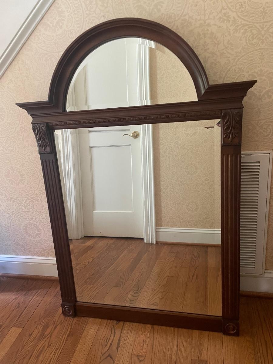 Solid wood frame of two beveled mirrors: a half circle sitting atop a rectangle. Mirror is from the Ethan Allen Regent's Park collection. Matches dresser and other items in living room that are listed in different lots in this auction. Measures approximately 46" x 33" x 3" Shipping Available.