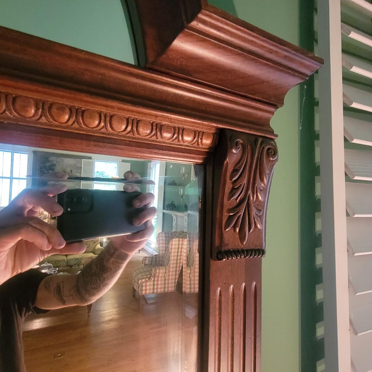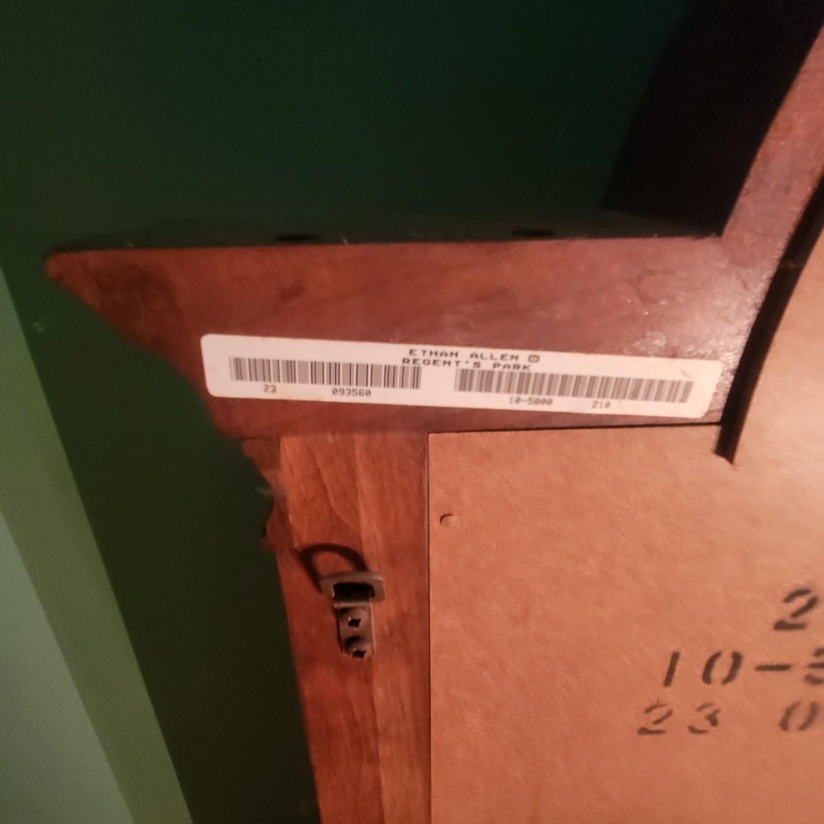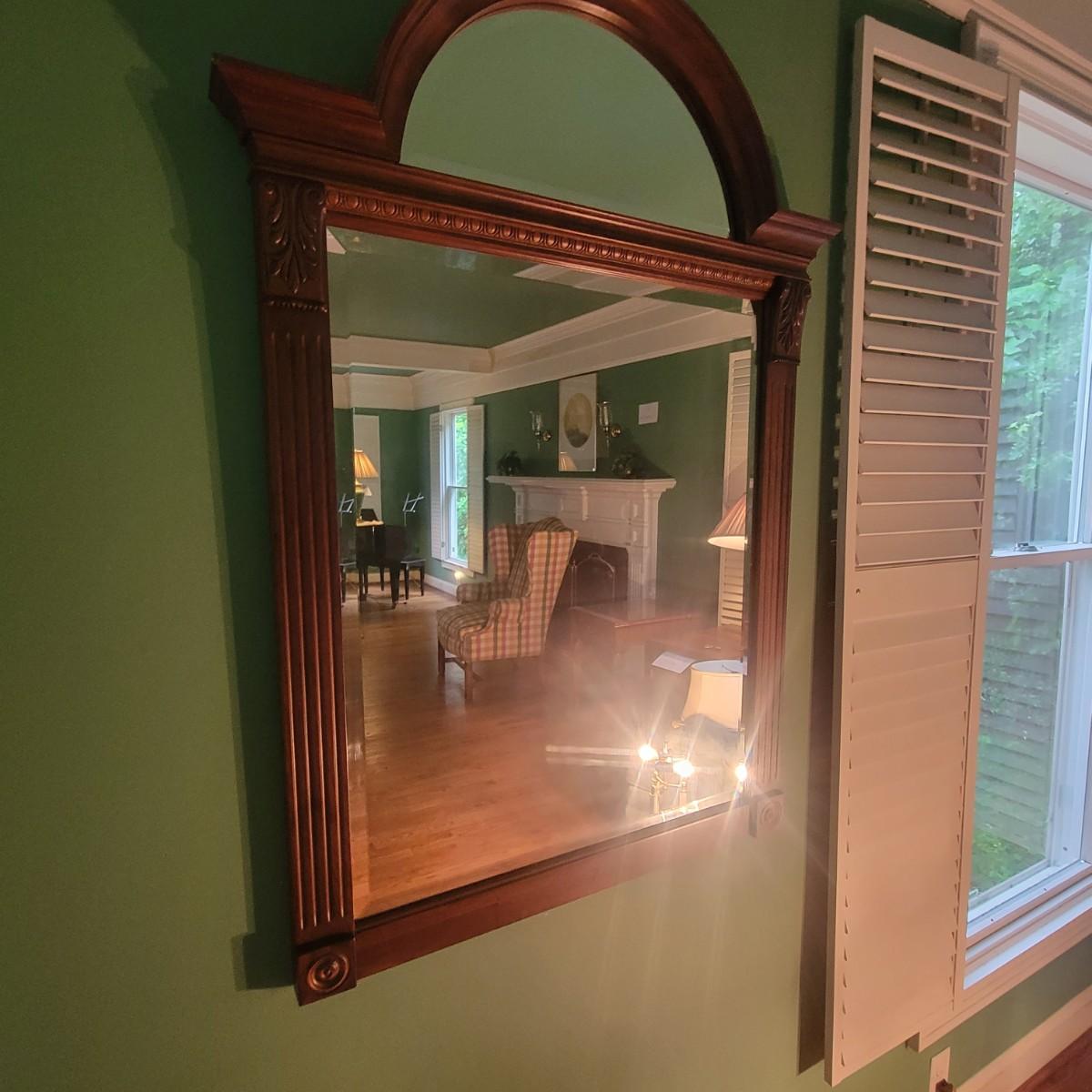 Solid wood frame of two beveled mirrors: a half circle sitting atop a rectangle. Mirror is from the Ethan Allen Regent's Park collection. Matches dresser and other items in living room that are listed in different lots in this auction. Measures approximately 46" x 33" x 3" Shipping Available.