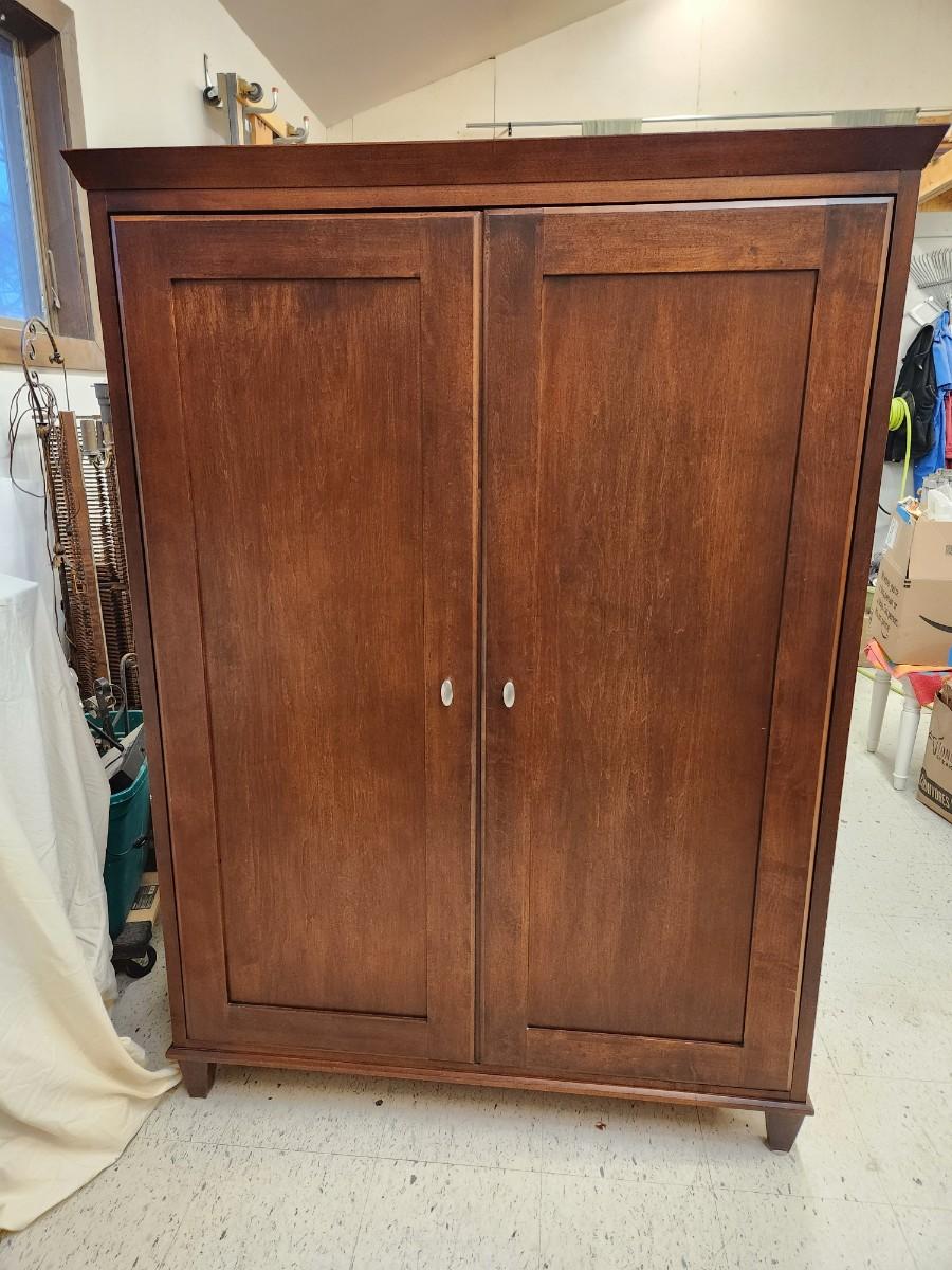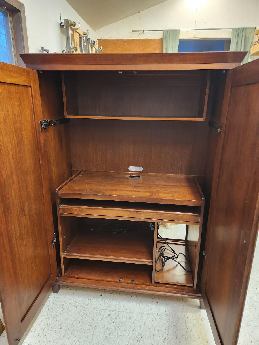 Huge cherry computer armoire made by Ethan Allen. This would make the best coffee bar because it has outlets in it and lots of storage. This piece is incredibly heavy and will require help loading. Please plan accordingly.