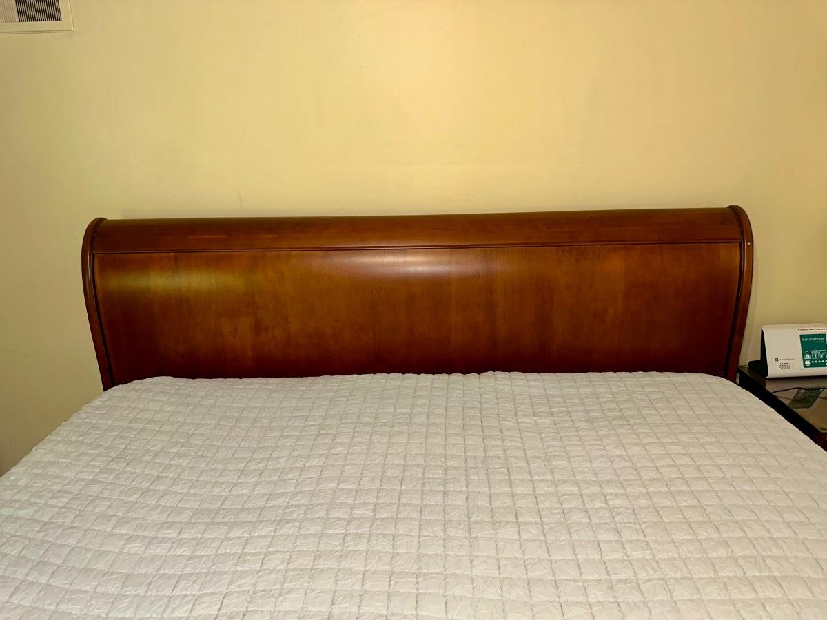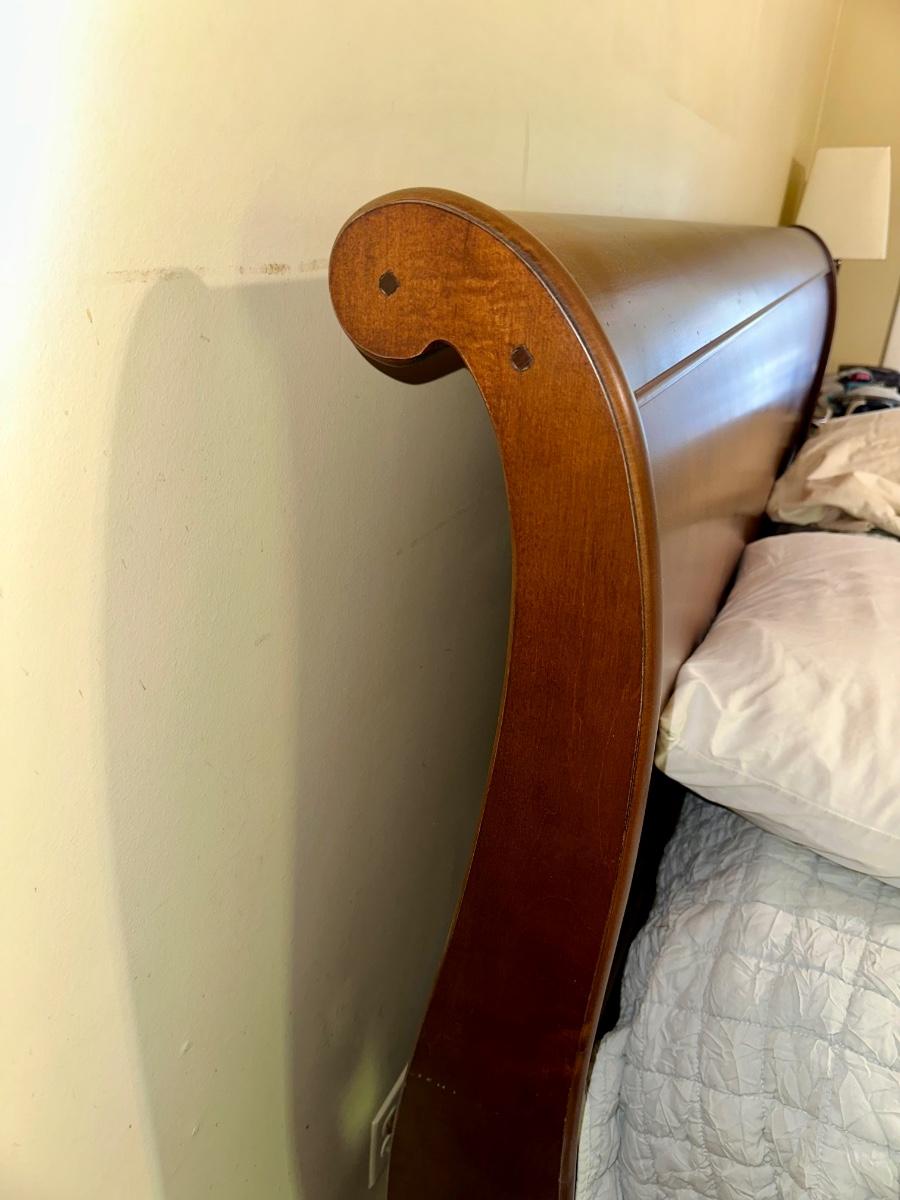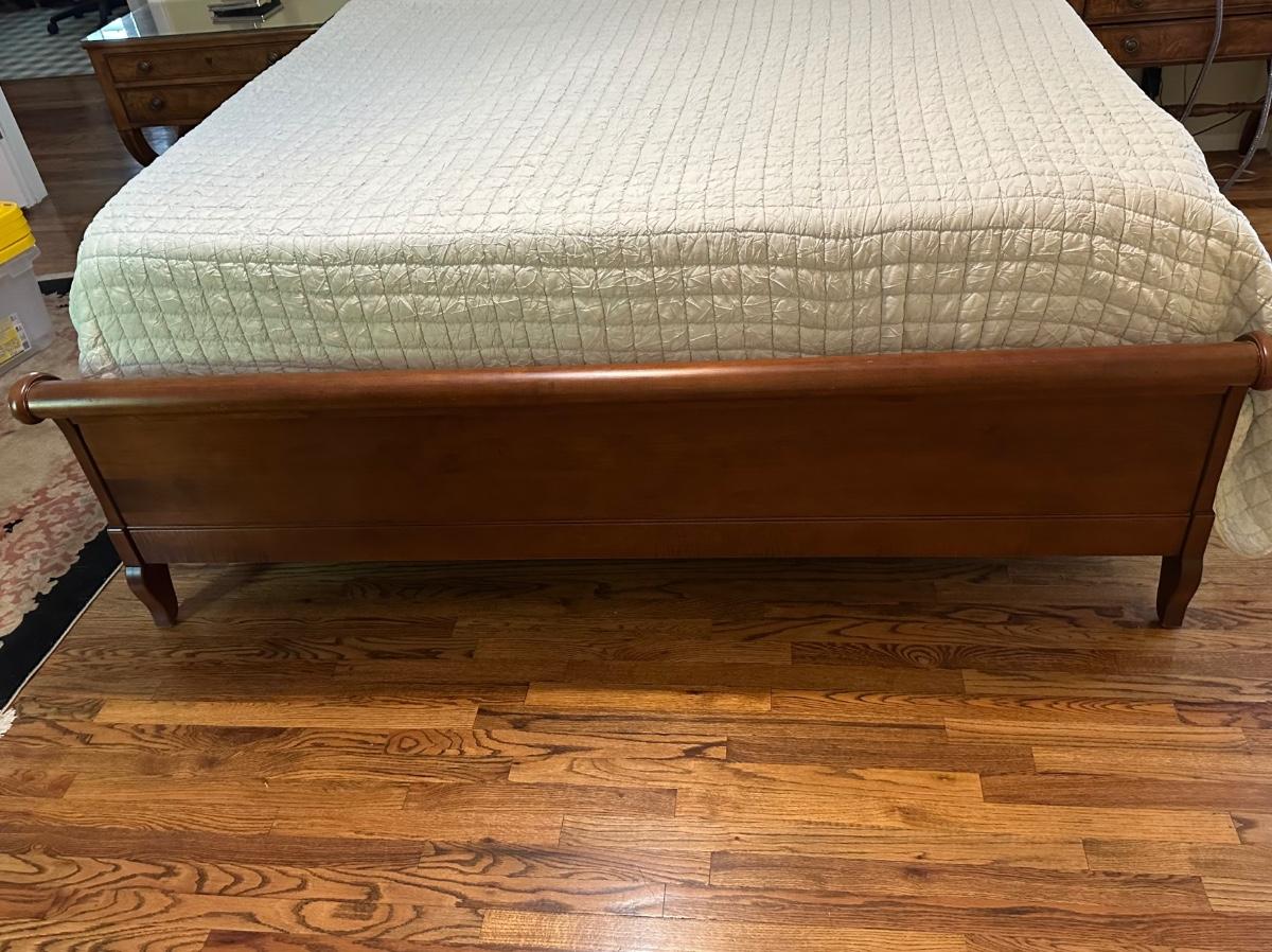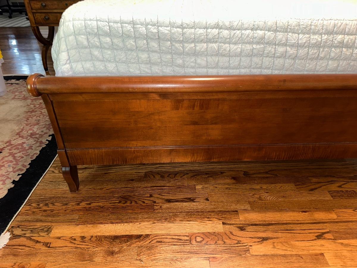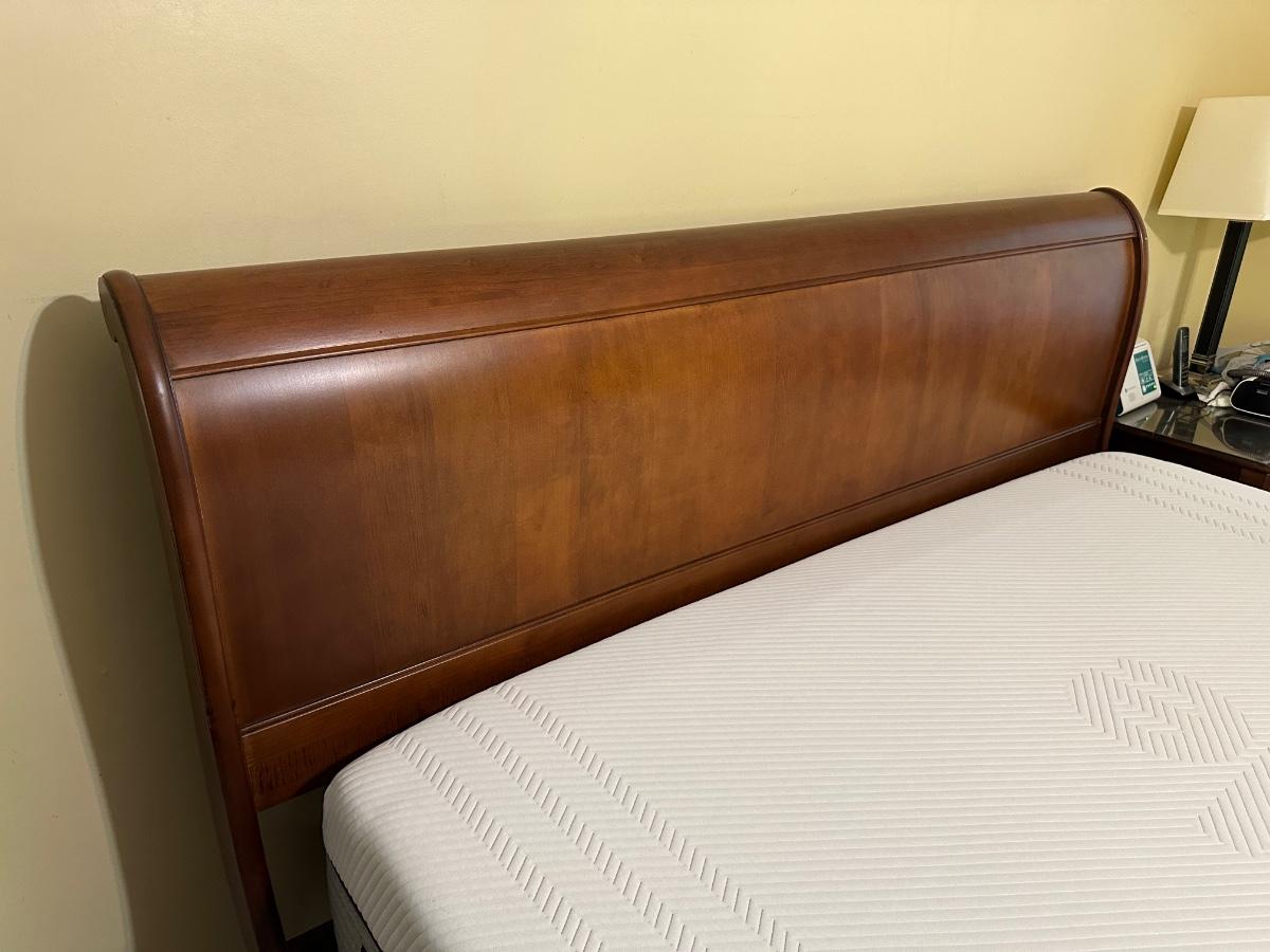 ETHAN ALLEN “CHLOE” SLEIGH STYLE KING BED WITH “PURPLE.3” MATTRESS