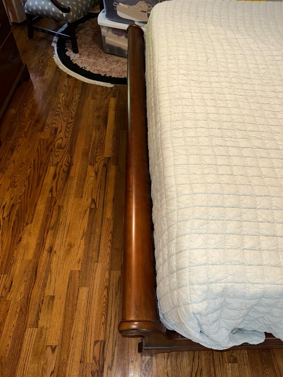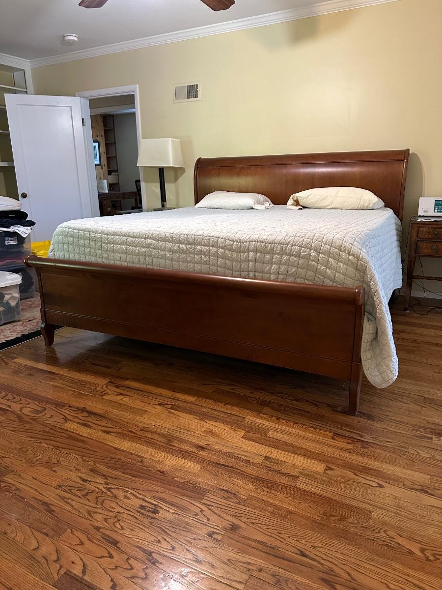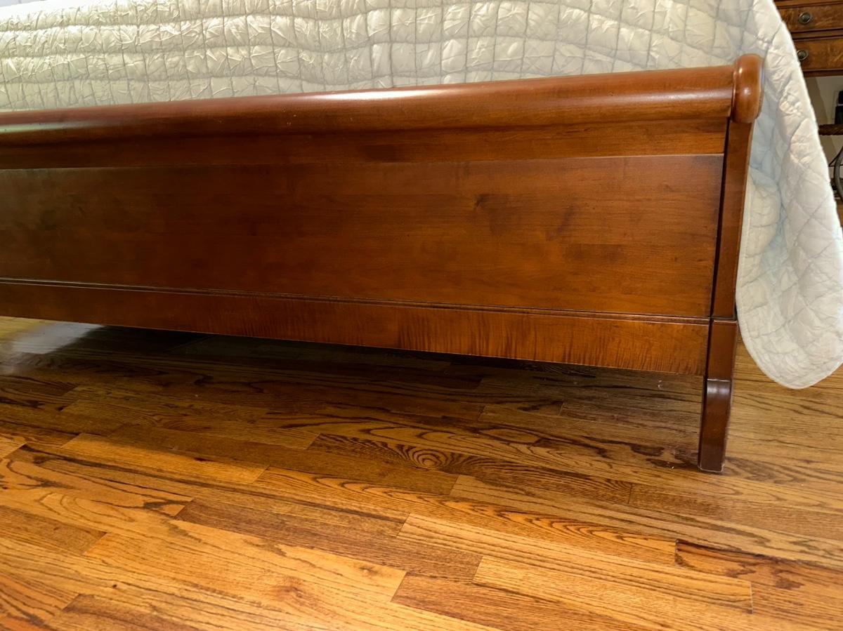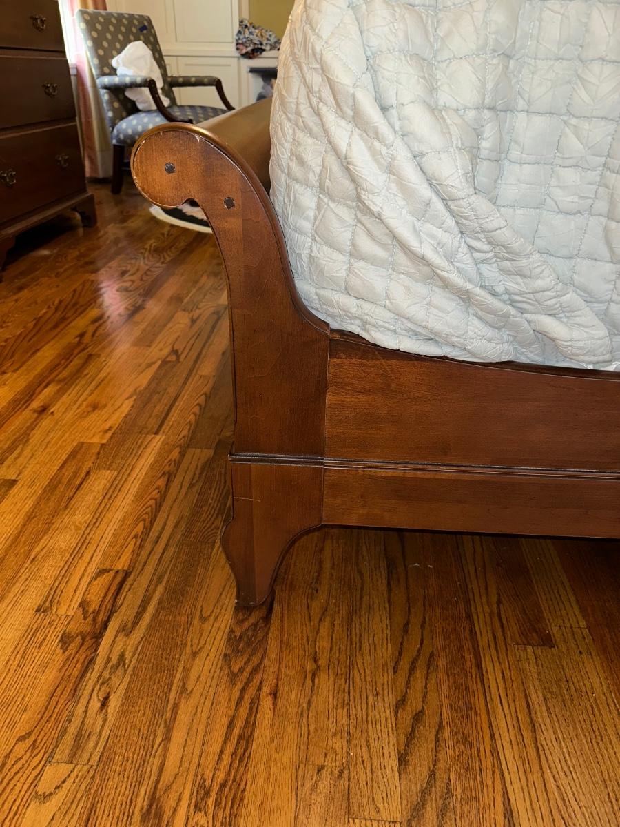 ETHAN ALLEN “CHLOE” SLEIGH STYLE KING BED WITH “PURPLE.3” MATTRESS