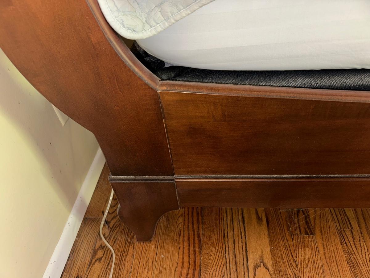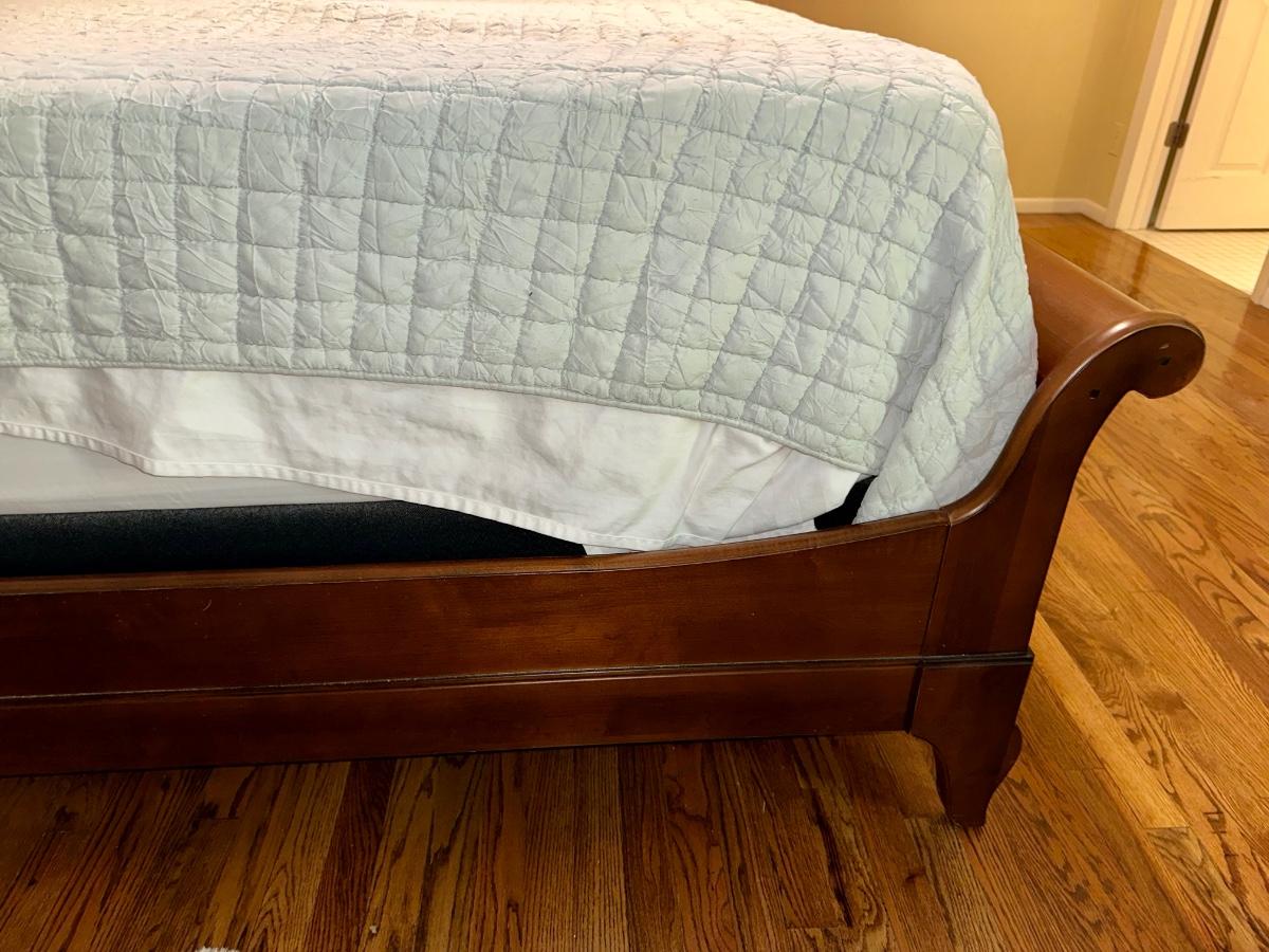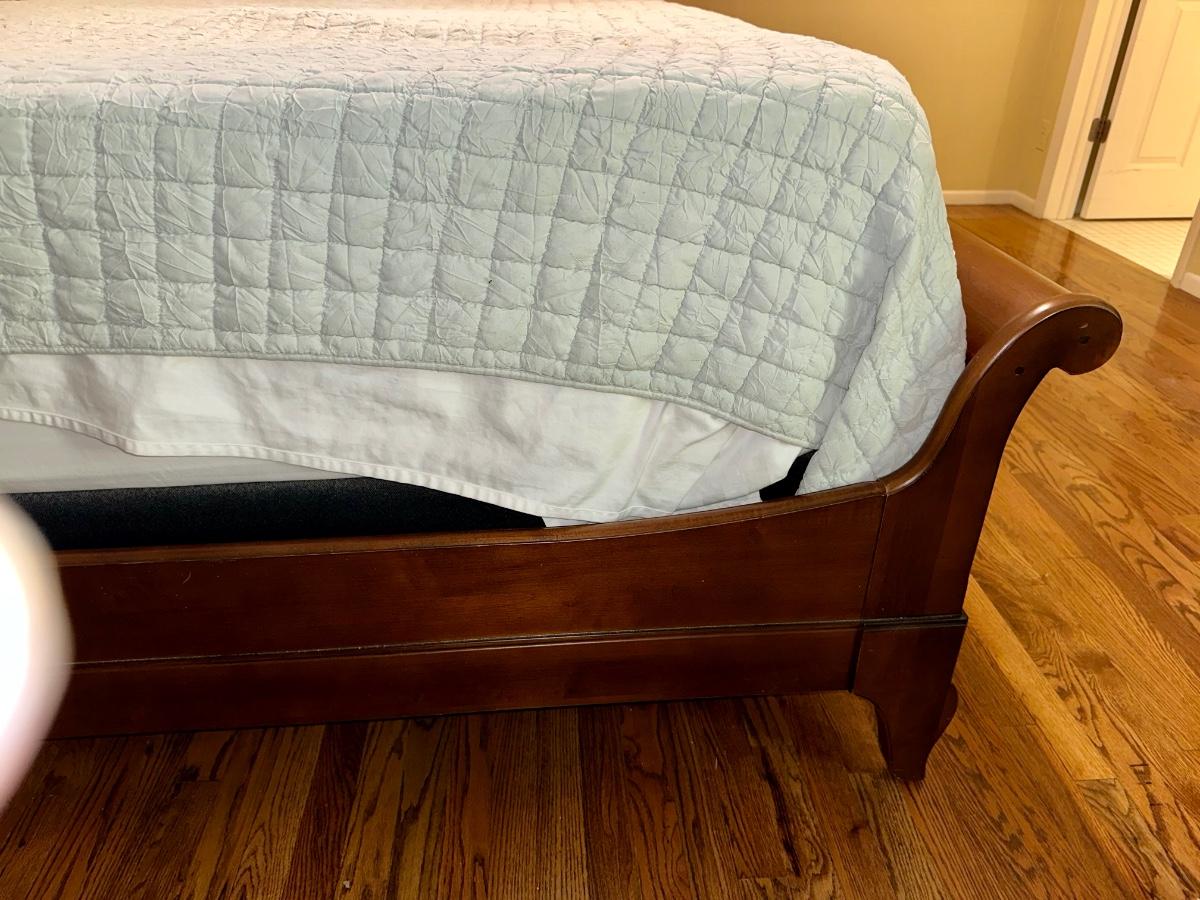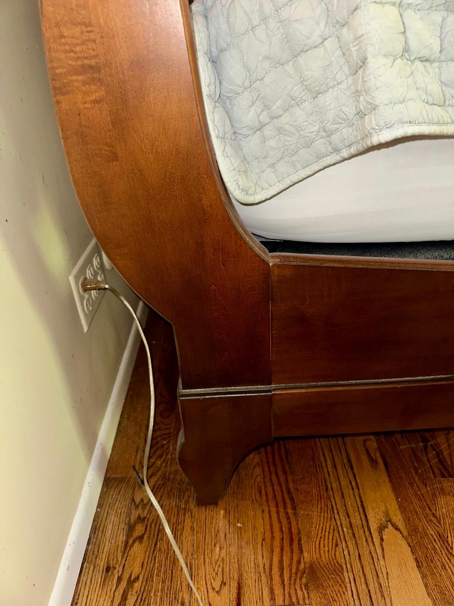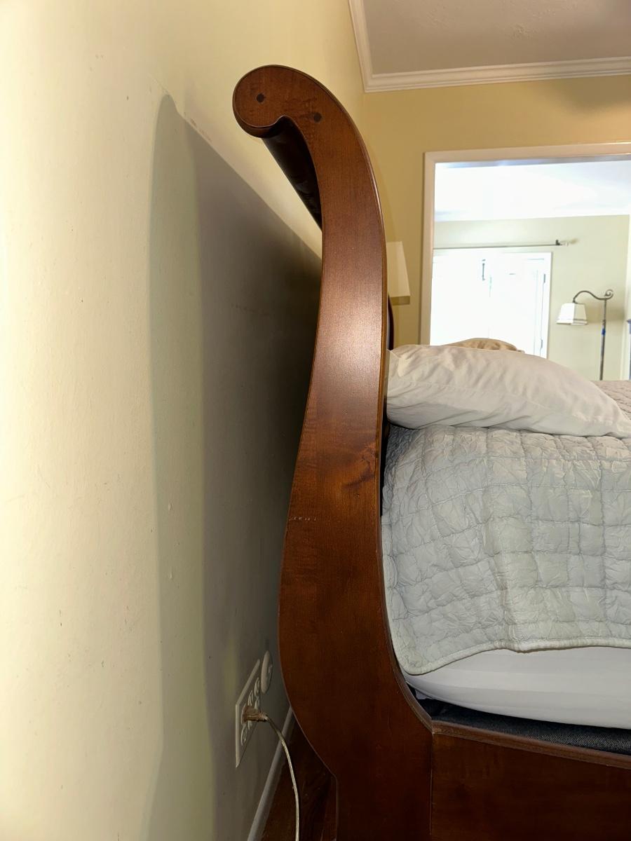 ETHAN ALLEN “CHLOE” SLEIGH STYLE KING BED WITH “PURPLE.3” MATTRESS