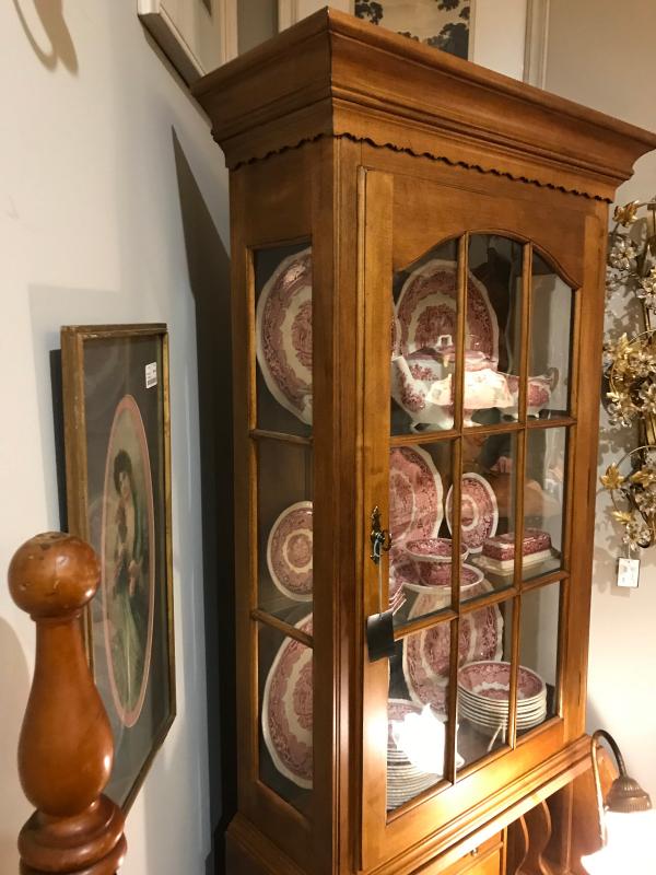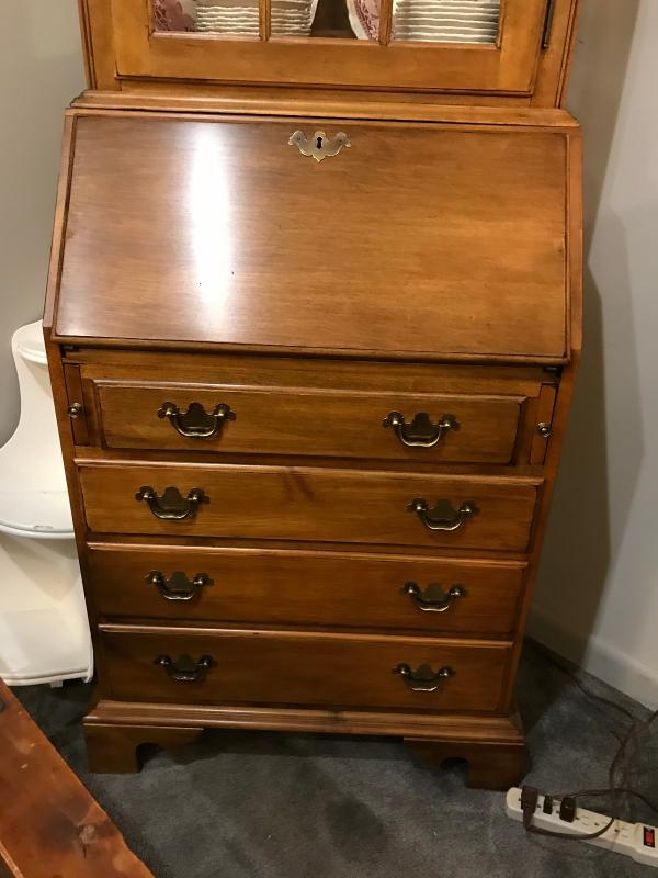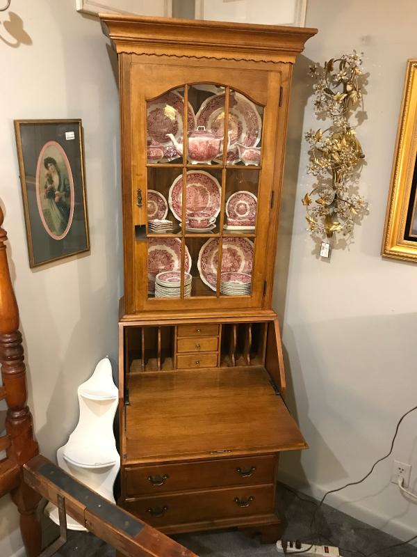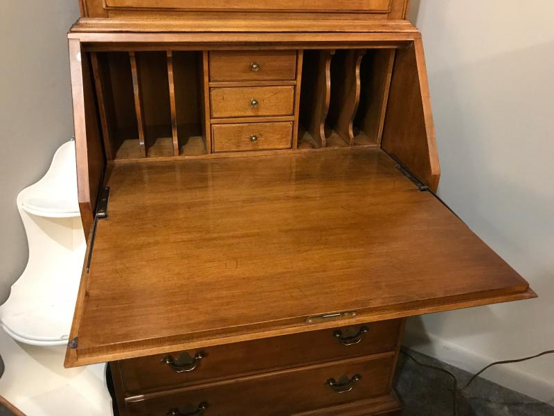Very nice maple lady's secretary from Ethan Allen's "Circa 1776" collection. Divided light glass door opens to two glass shelves in the lighted top. Four drawers in the base. Drop down desk with automatic pull out supports opens to several storage cubbies and drawers. 28" x 17" x 80" H Excellent condition. Decorative items not included.