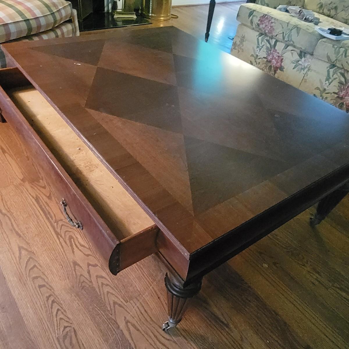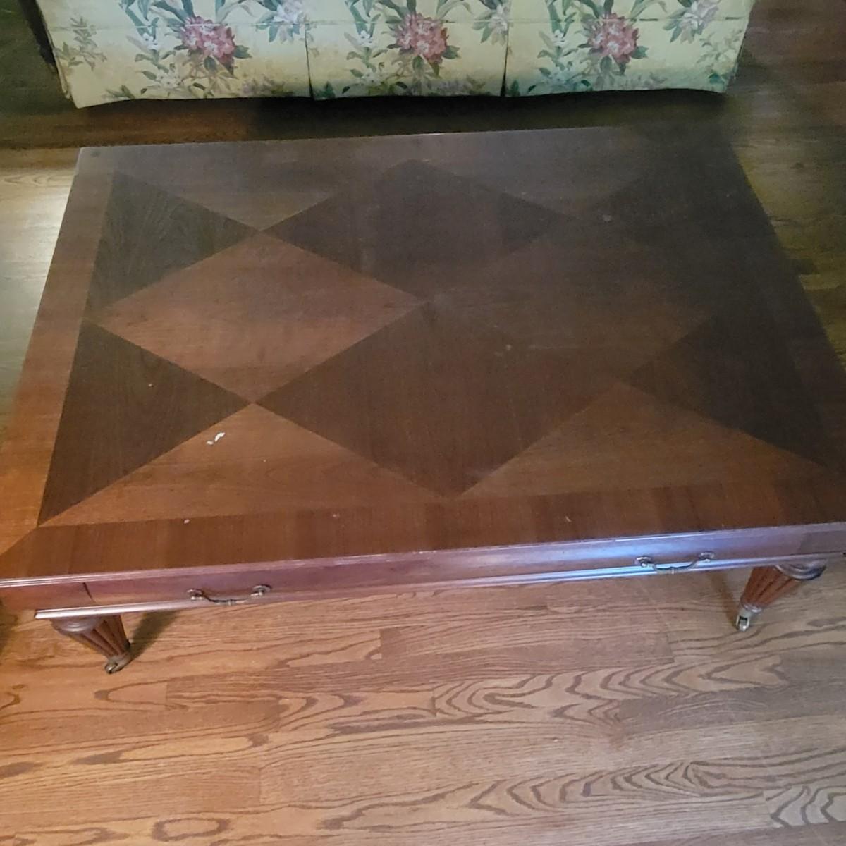 Large Ethan Allen coffee table with a diamond pattern veneered top and brass casters and accents. Some minor scratches, see photos. Has dovetail drawers. Measures approximately 50" x 36" x 20" Local pickup only