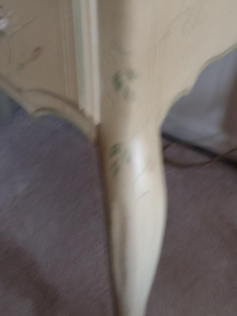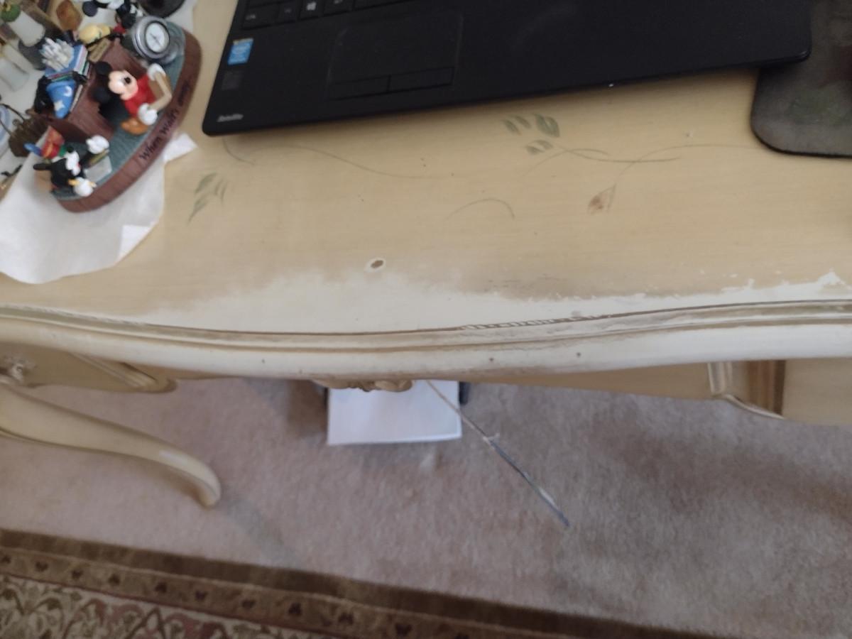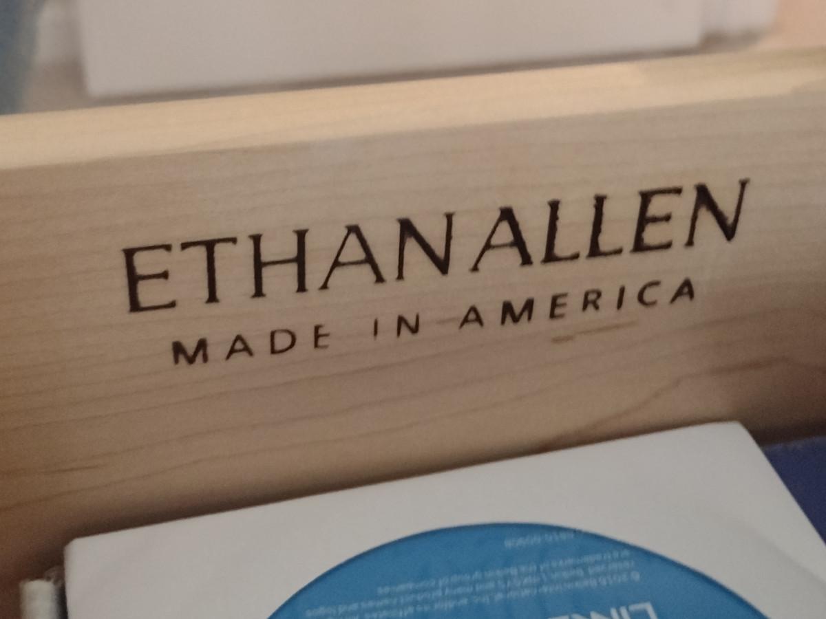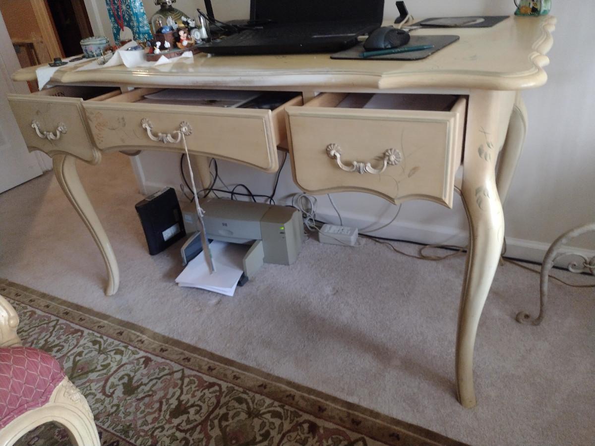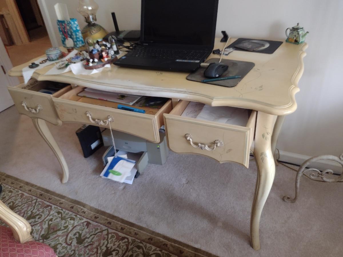 Ethan Allen Country French Style Desk- Approx 52" x 26 1/2" x 30" Tall. No contents included. Item is located downstairs and must be carried up a flight of steps for removal.