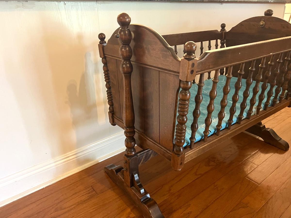 Ethan Allen Dark Antiqued Pine Old Tavern Cradle in excellent condition with pad. Measures 33 inches tall, 40 inches long and 22 inches wide.