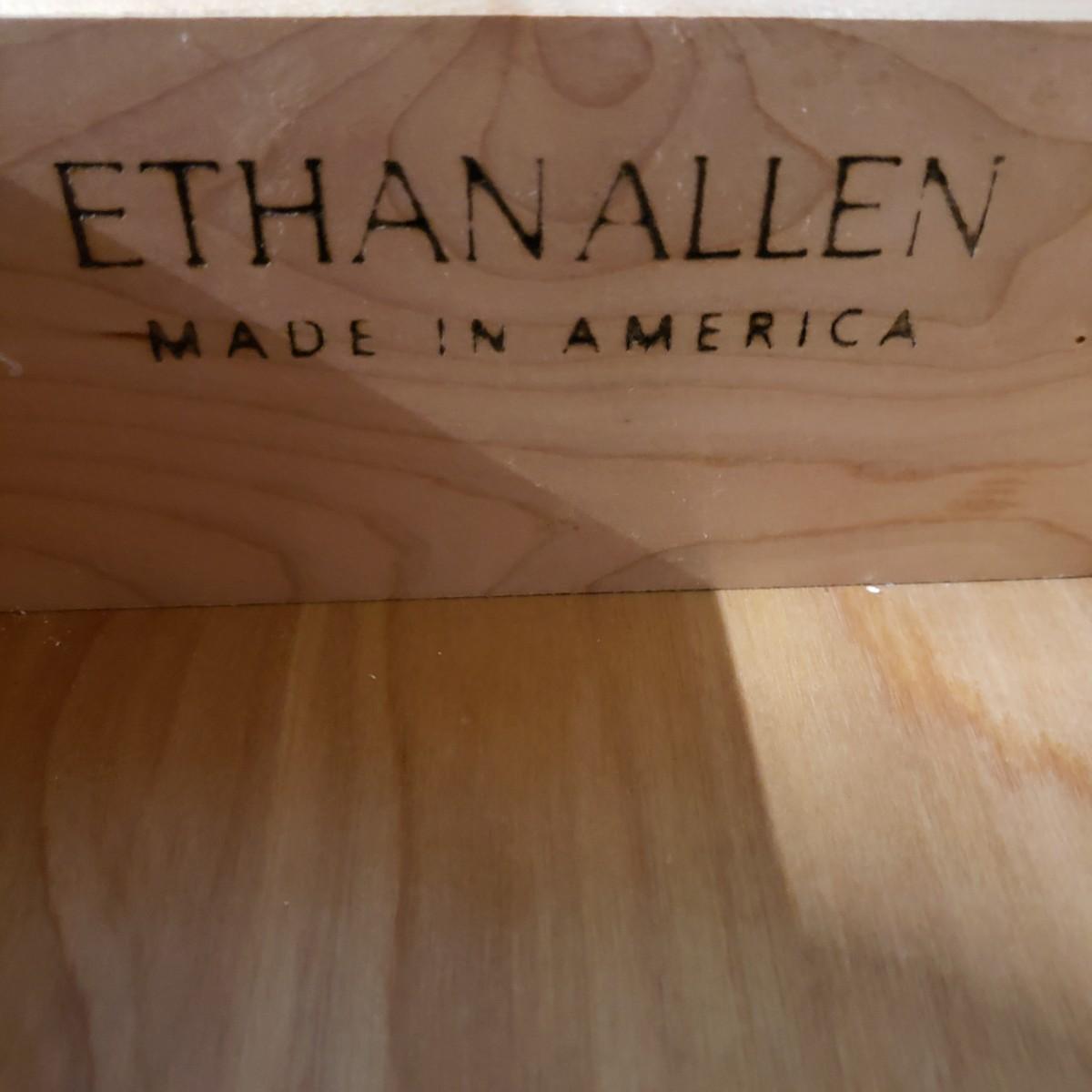 This Ethan Allen side table features a dovetailed tailed drawer and a distressed finish. The table measures 25" x 17" x 29"H. The top has some blemishes, see picture. The table has a shelf on the bottom. The drawer has a corner broken off, see pictures