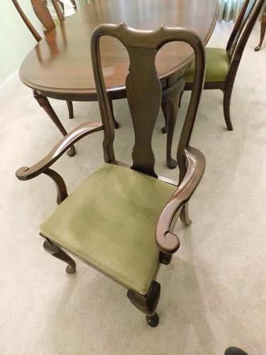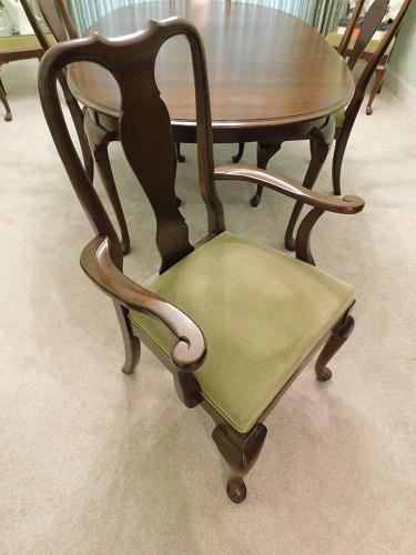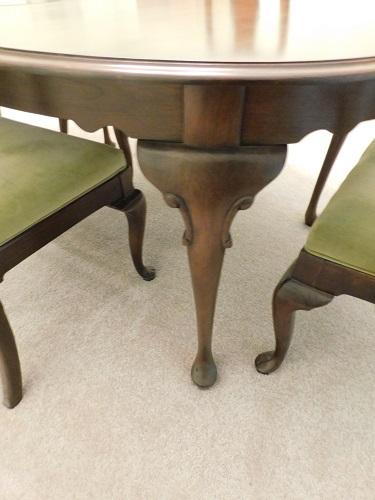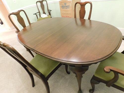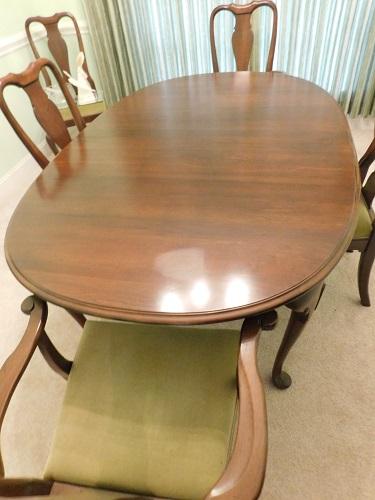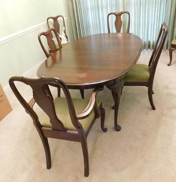 Ethan Allen Dining Table with Six Upholstered Seat Chairs and 18" Leaf expect some wear or scratches. Chairs are very clean.