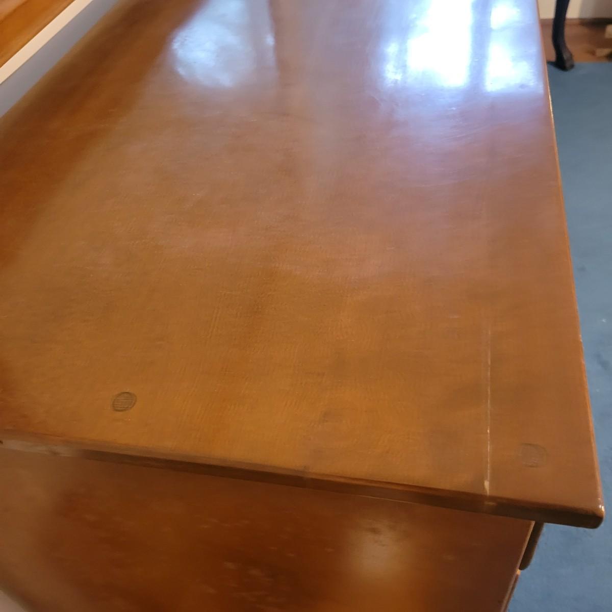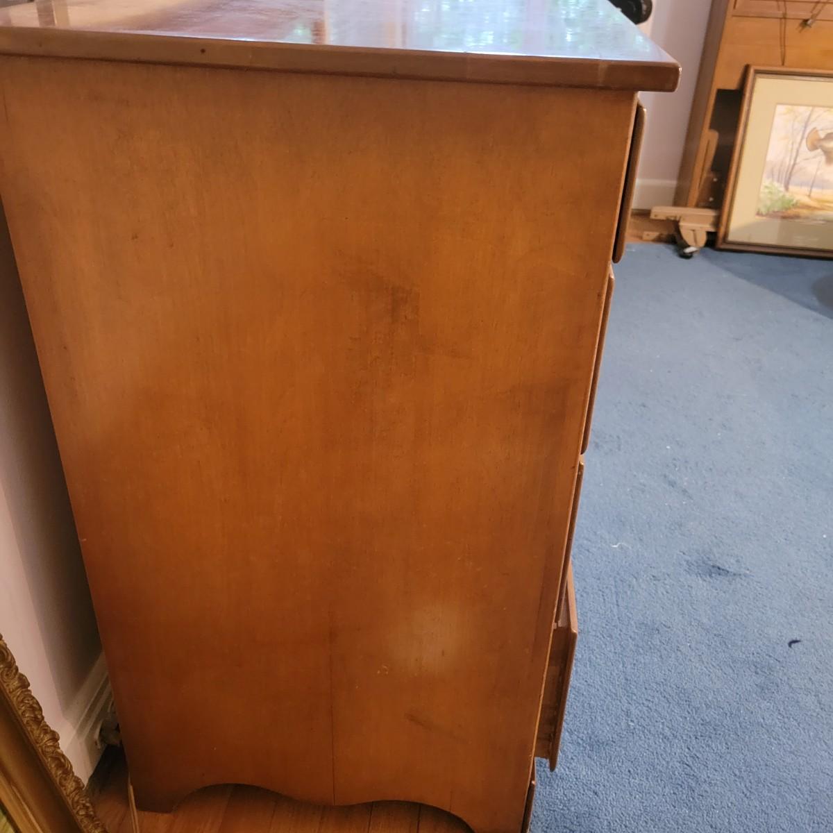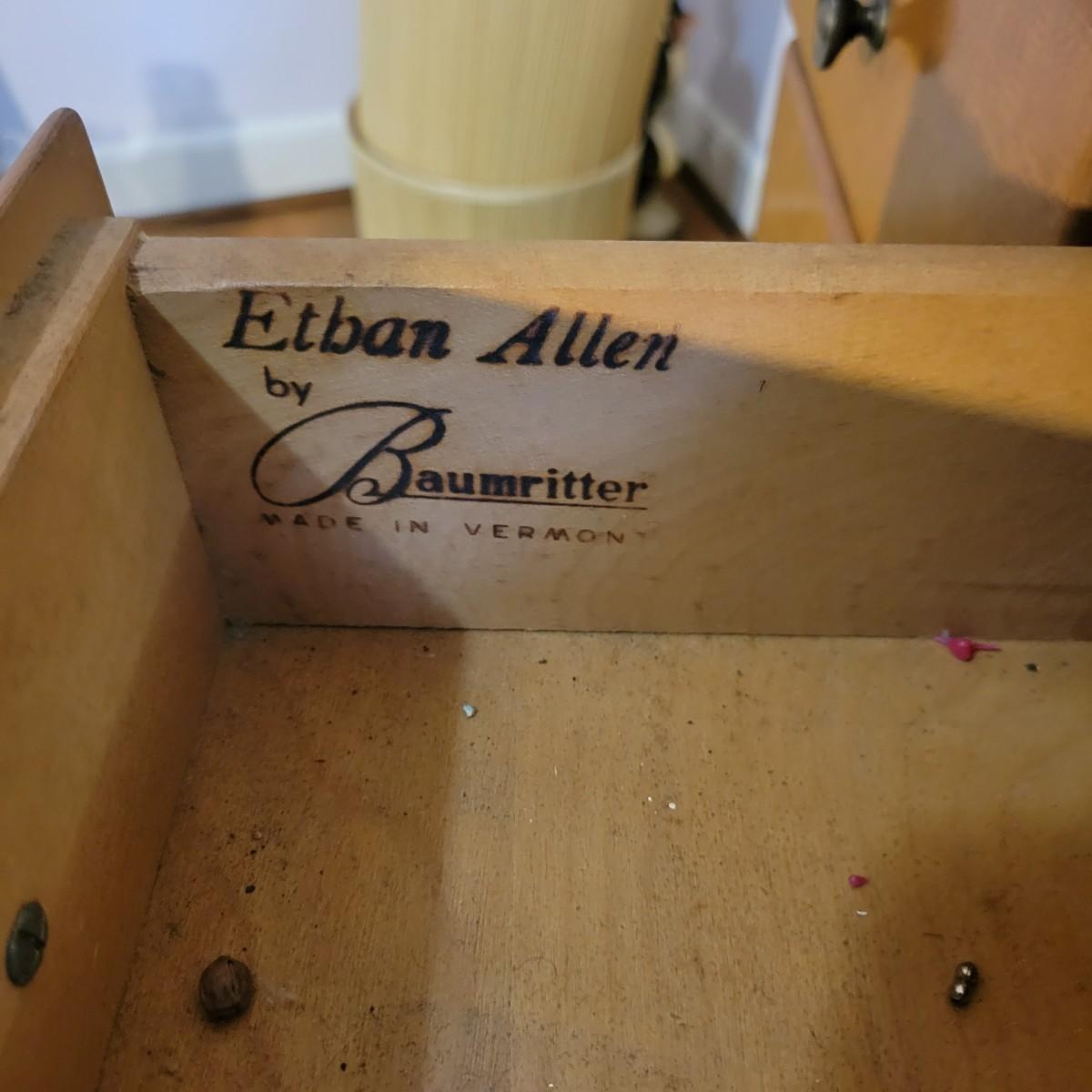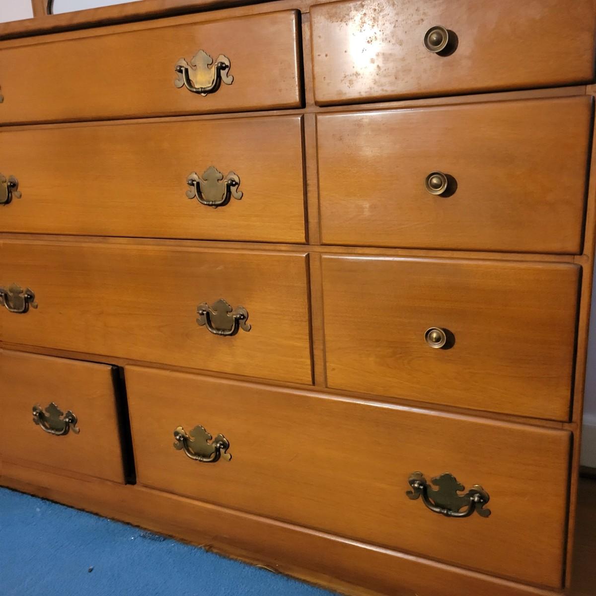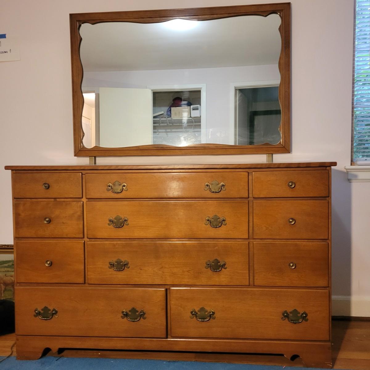 An Ethan Allen by Baumritter nine drawer dresser with an attached mirror in good condition. Dresser features dovetailed drawers and an adjustable height mirror that attaches directly to the dresser, but can also be wall mounted. Dresser measures approximately 55" x 20" x 34". Mirror measures approximately 47" x 31" x 1". Mirror will likely need to be separated from the dresser to be moved. Local pickup only. The winning bidder is advised to bring help to move this heavy item.