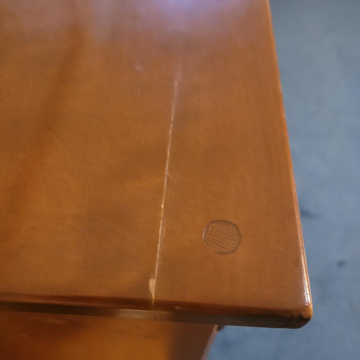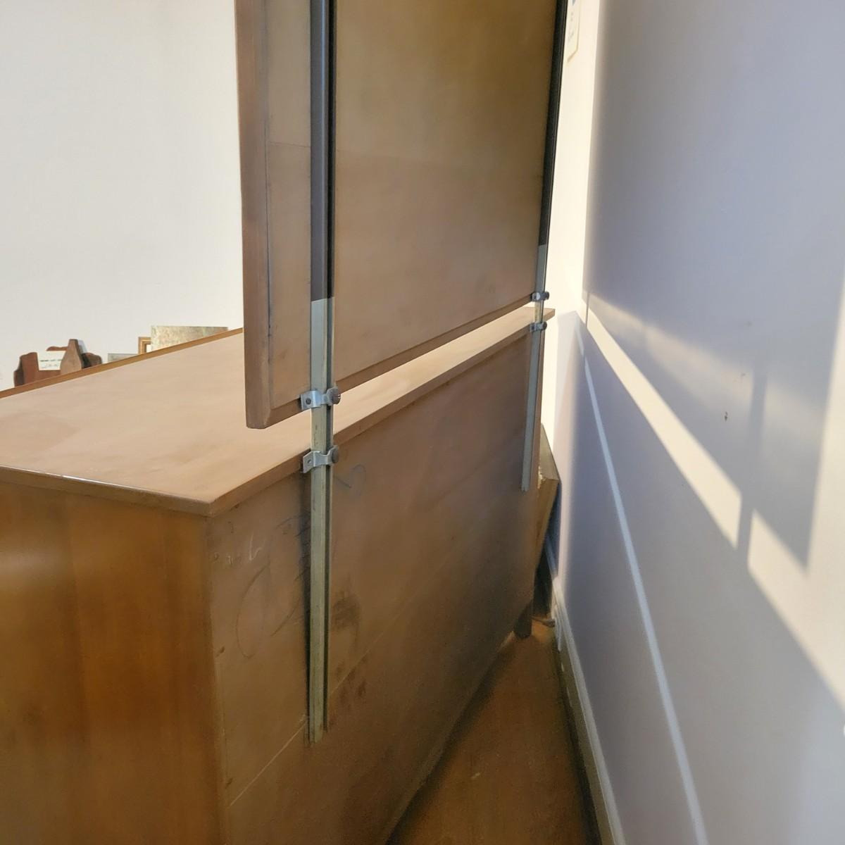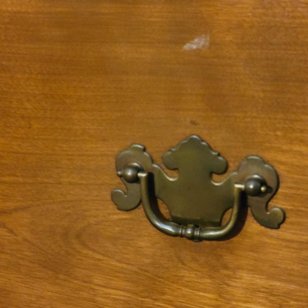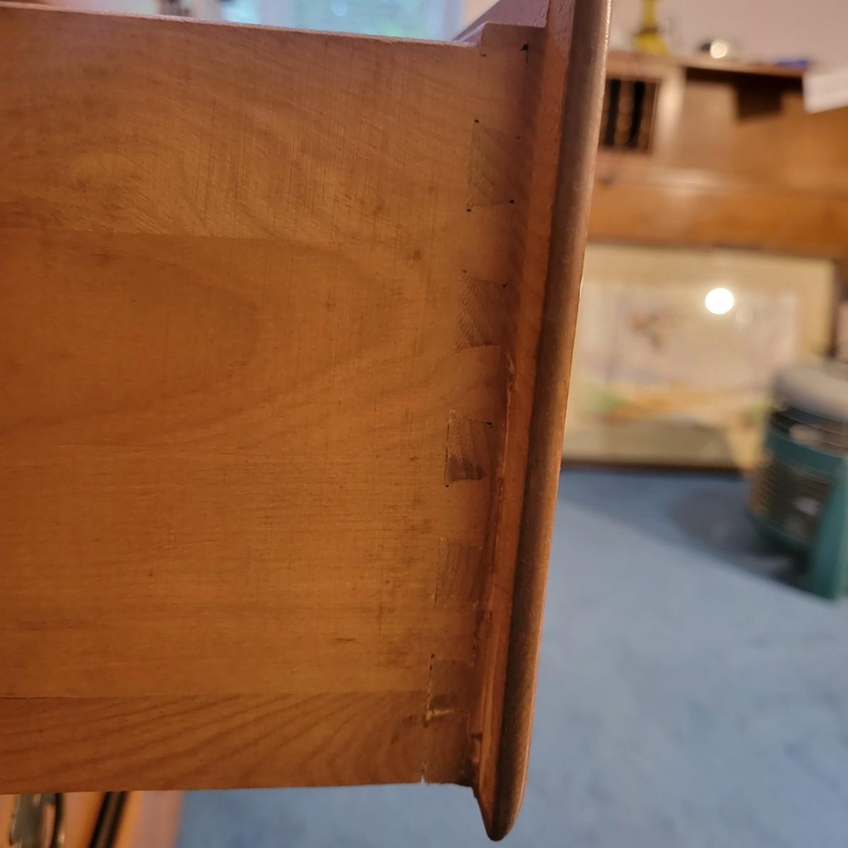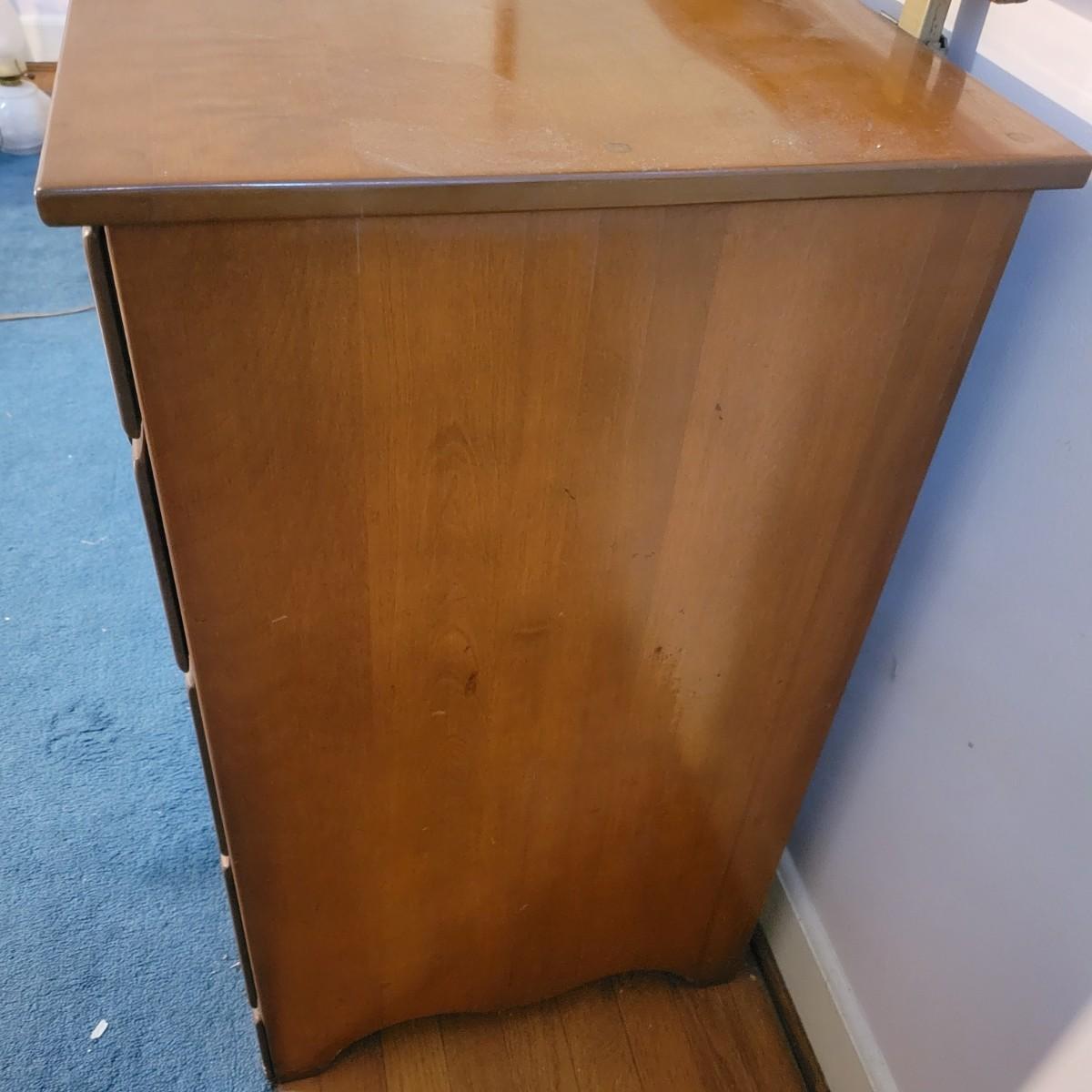 An Ethan Allen by Baumritter nine drawer dresser with an attached mirror in good condition. Dresser features dovetailed drawers and an adjustable height mirror that attaches directly to the dresser, but can also be wall mounted. Dresser measures approximately 55" x 20" x 34". Mirror measures approximately 47" x 31" x 1". Mirror will likely need to be separated from the dresser to be moved. Local pickup only. The winning bidder is advised to bring help to move this heavy item.