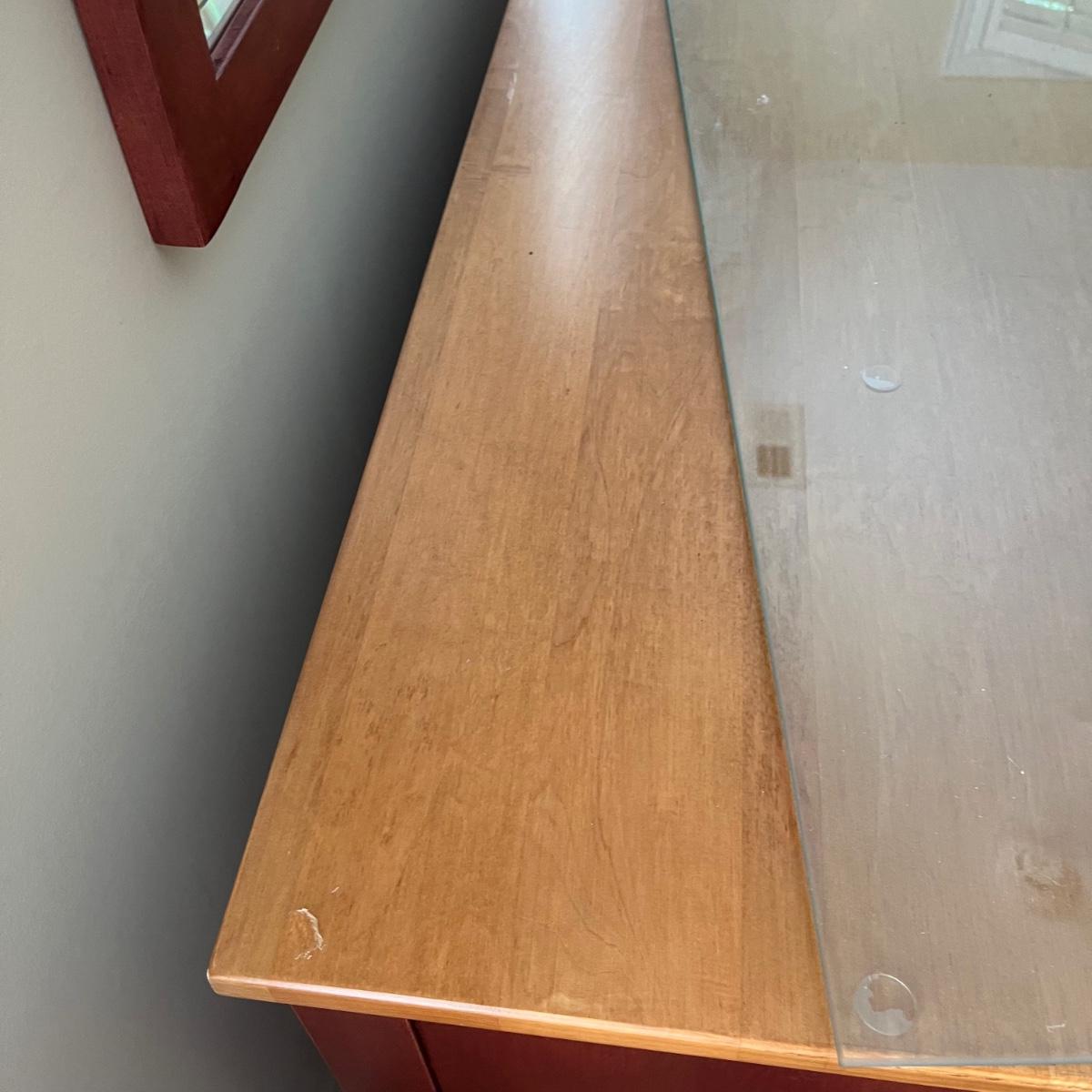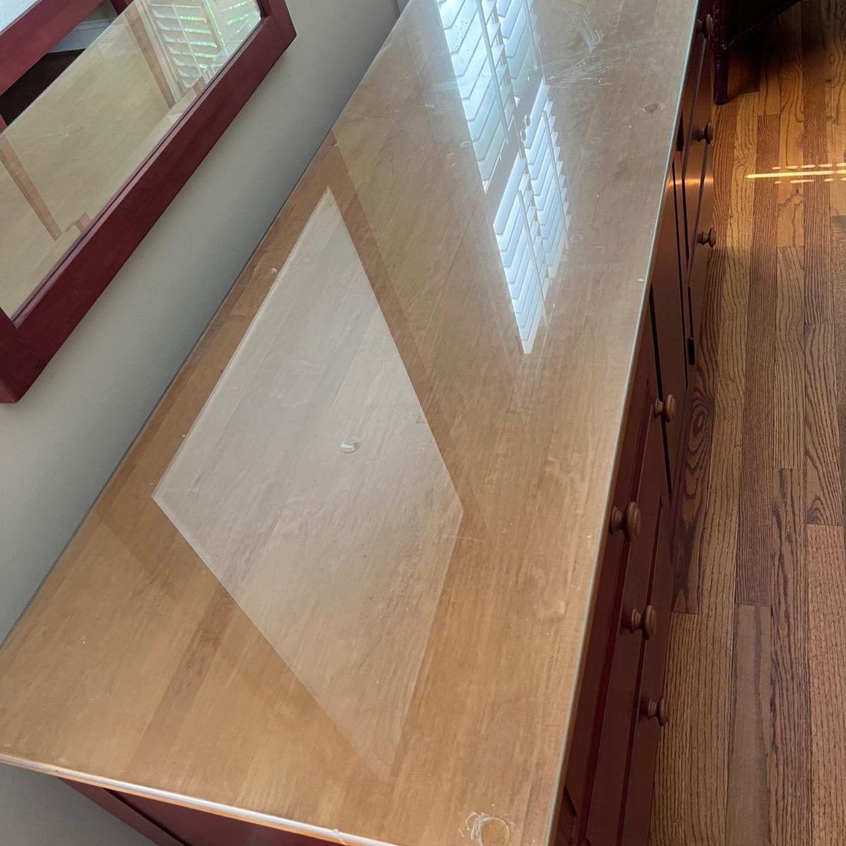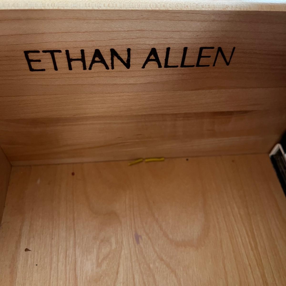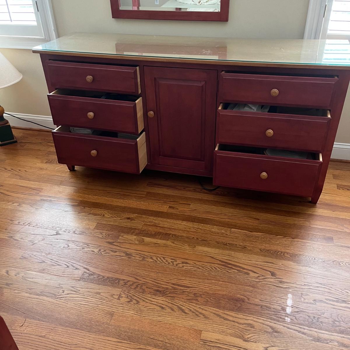 Lot includes a six dovetailed drawer wooden Ethan Allen dresser with a cabinet in the middle. Dresser has glass on top of wooden top. Bring help to move as item is substantial and up a flight of stairs. Dresser measures 67” x 19” x 32”. Mirror in pictures is not included in this lot, but is available in this auction.