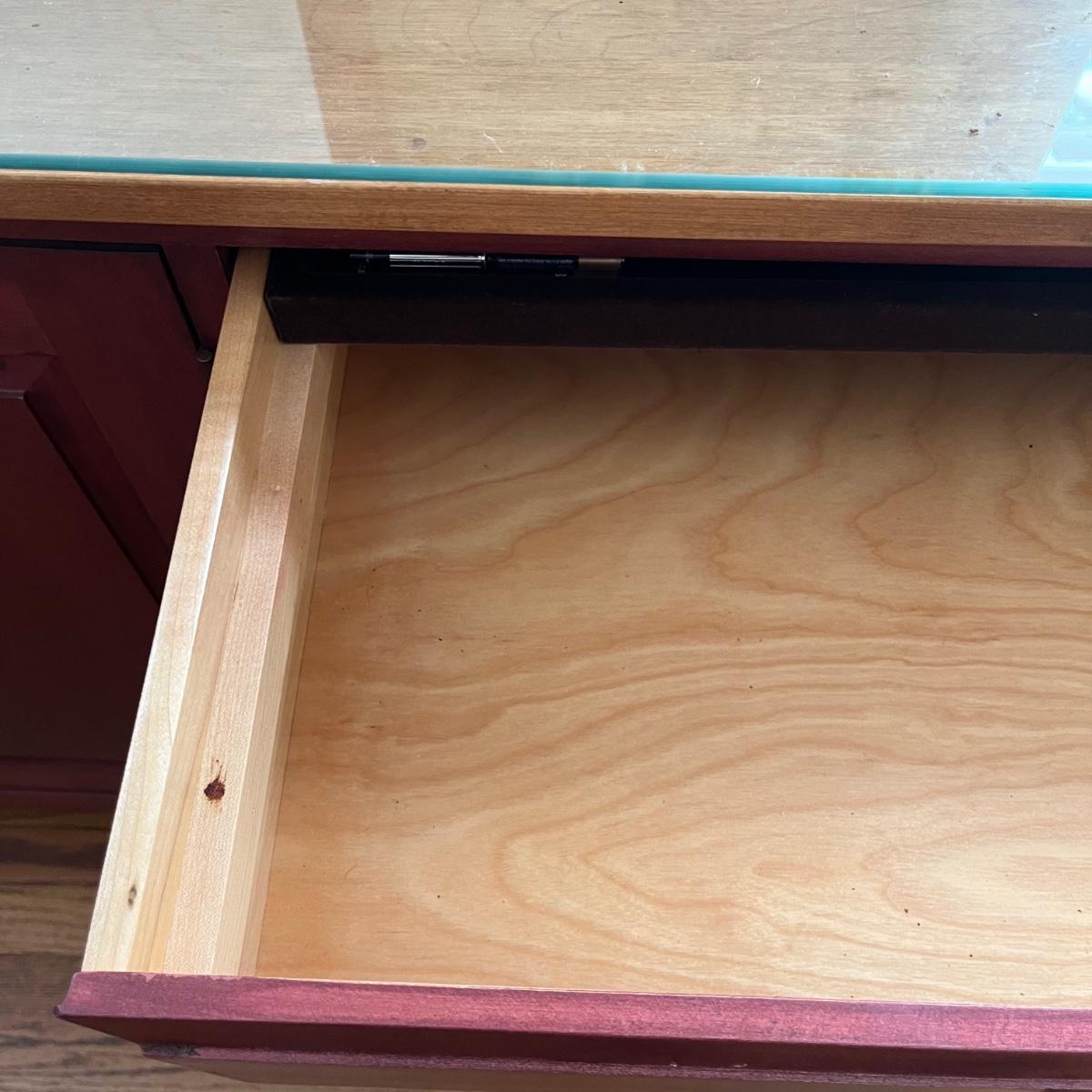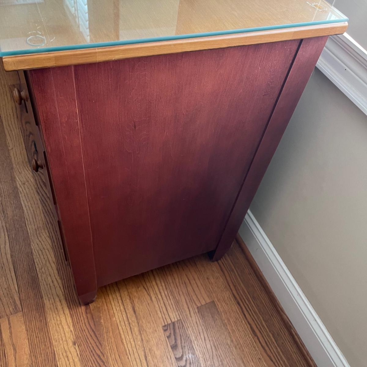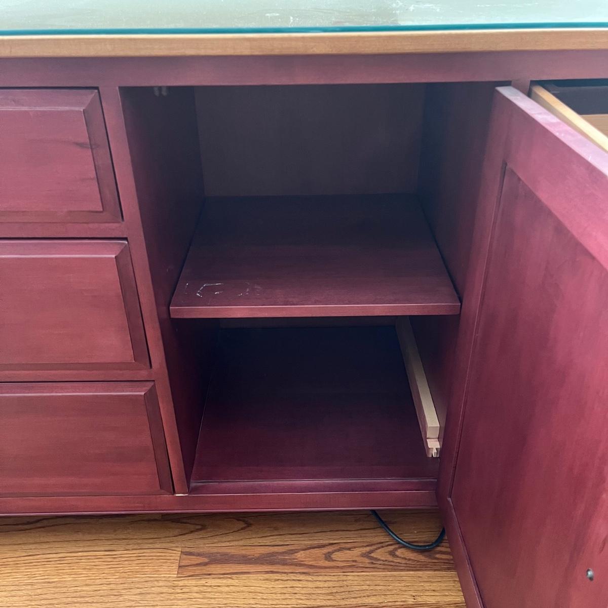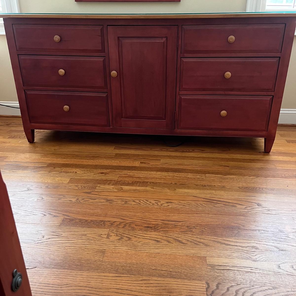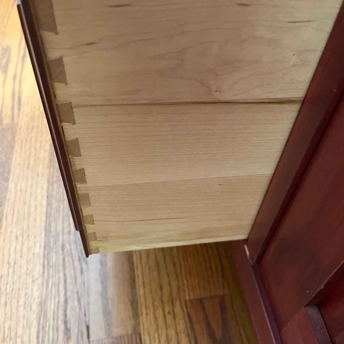Lot includes a six dovetailed drawer wooden Ethan Allen dresser with a cabinet in the middle. Dresser has glass on top of wooden top. Bring help to move as item is substantial and up a flight of stairs. Dresser measures 67” x 19” x 32”. Mirror in pictures is not included in this lot, but is available in this auction.