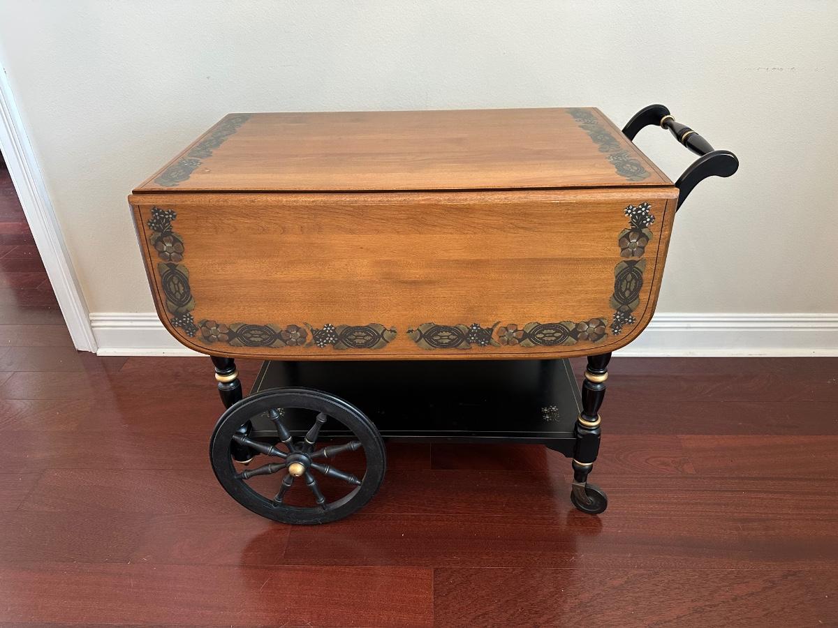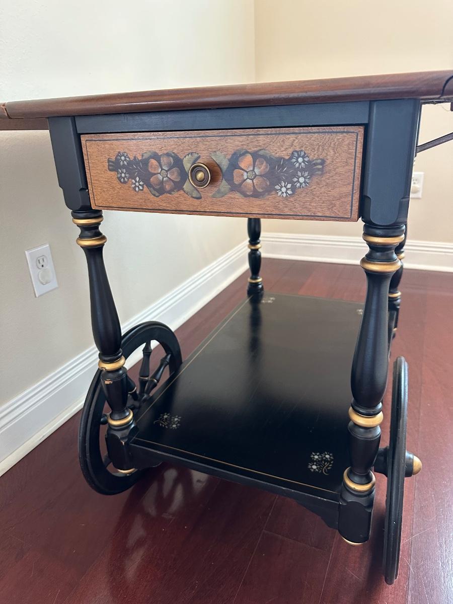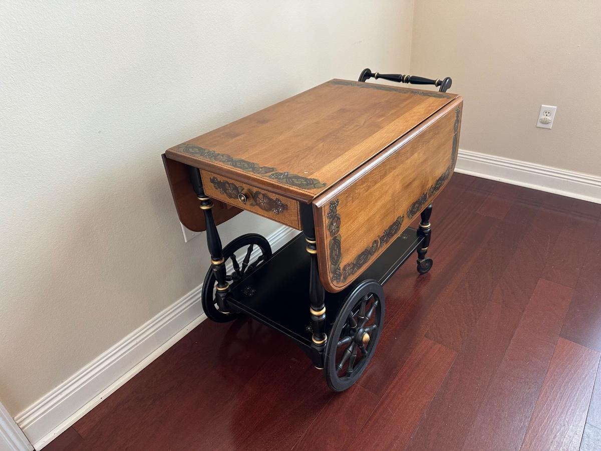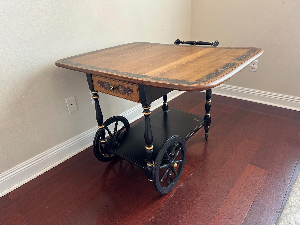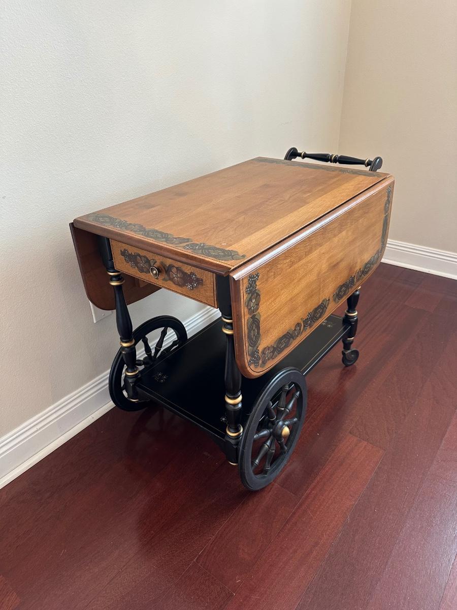 Ethan Allen wooden tea cart featuring drop-leaf sides, a single drawer with floral inlay, and turned black-and-gilt accented legs.