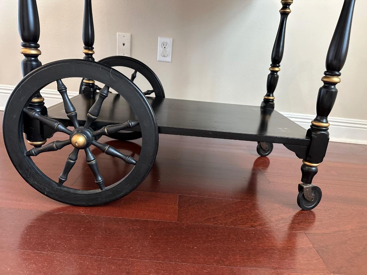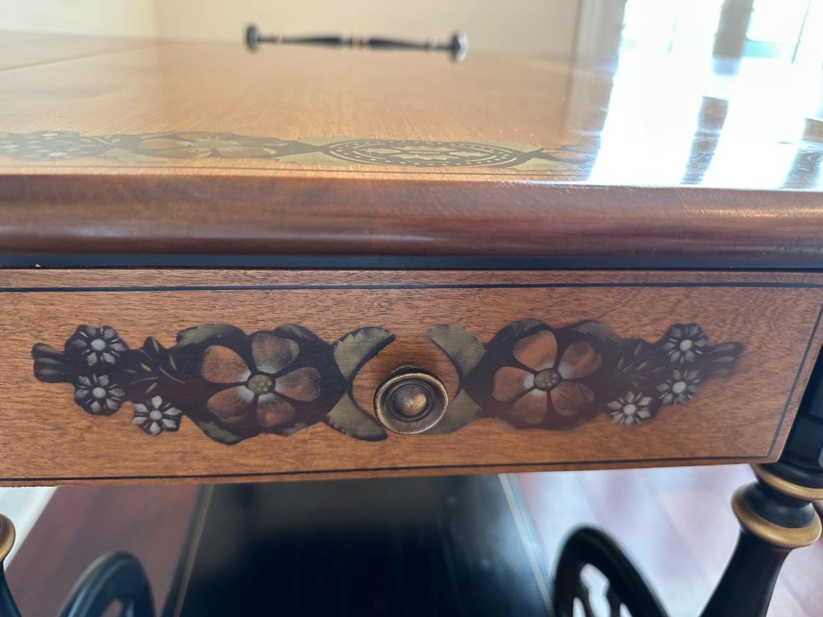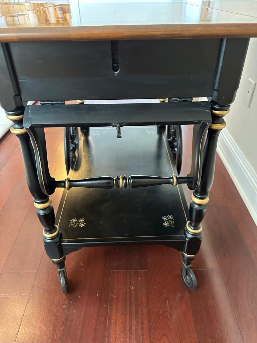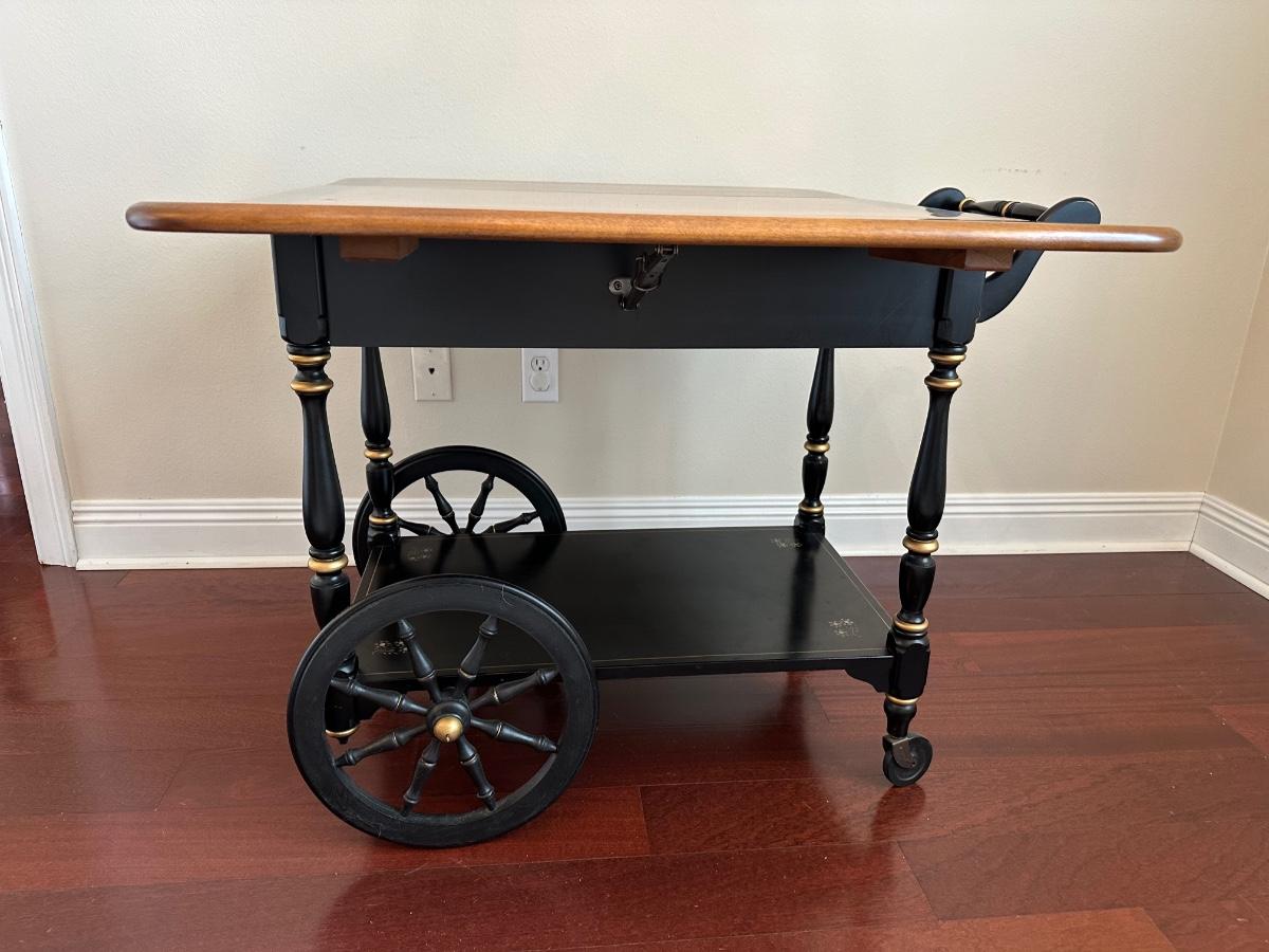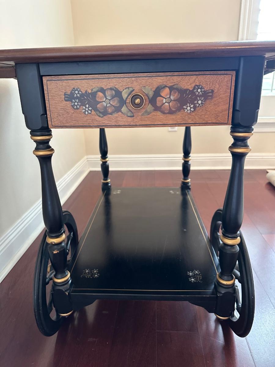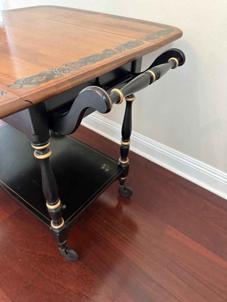 Ethan Allen wooden tea cart featuring drop-leaf sides, a single drawer with floral inlay, and turned black-and-gilt accented legs.