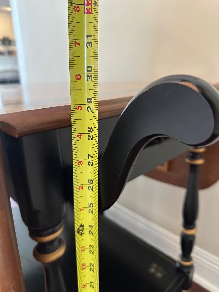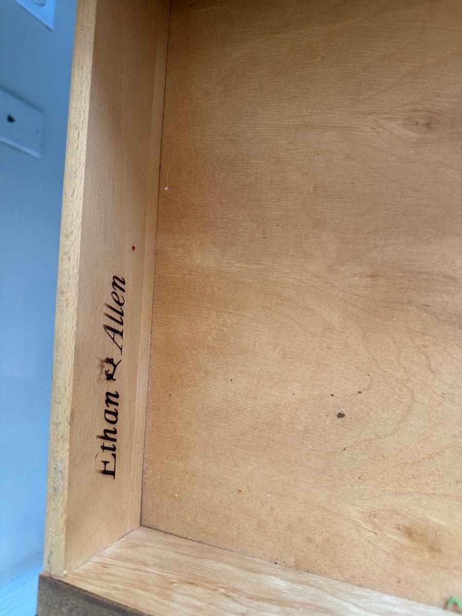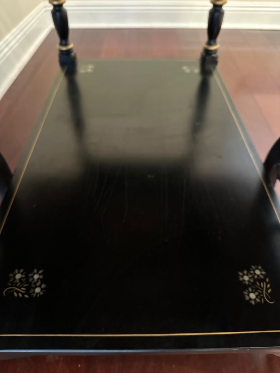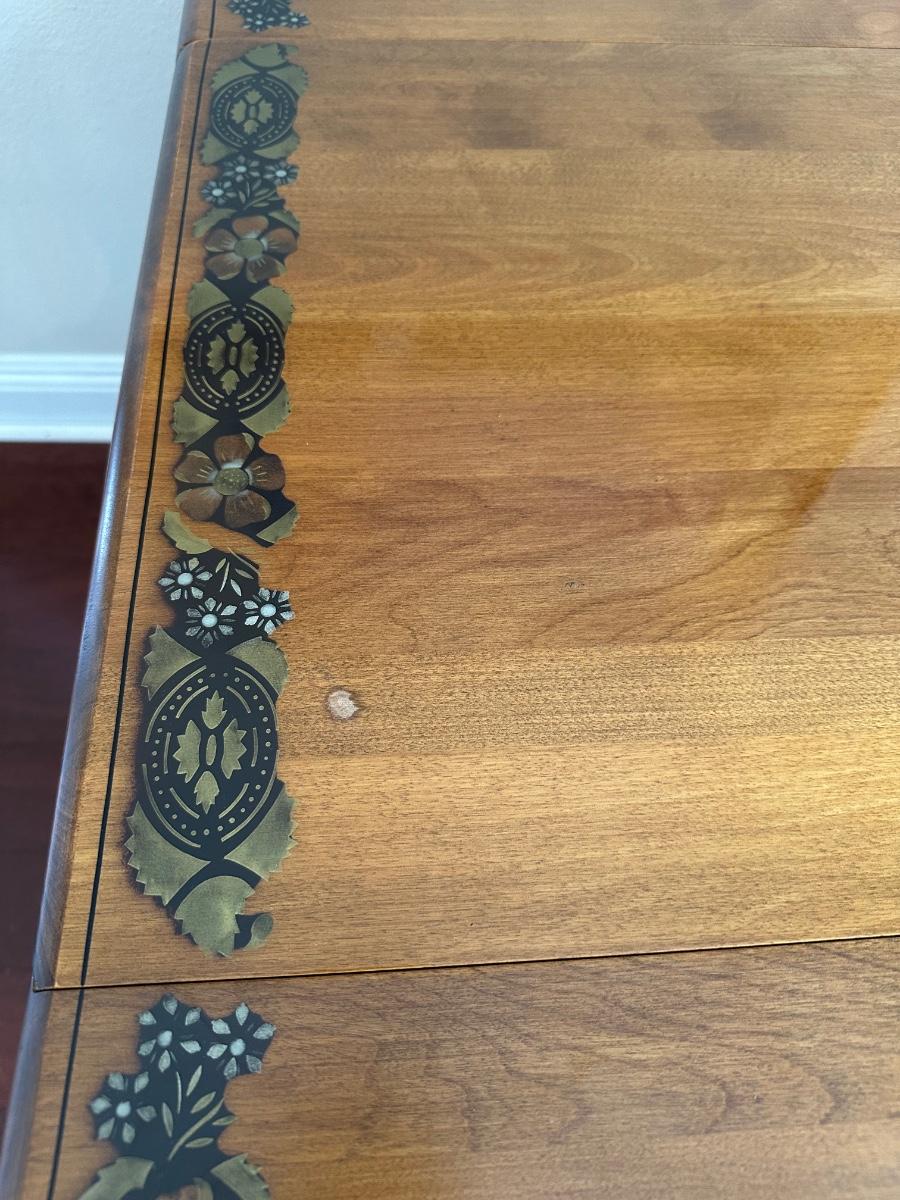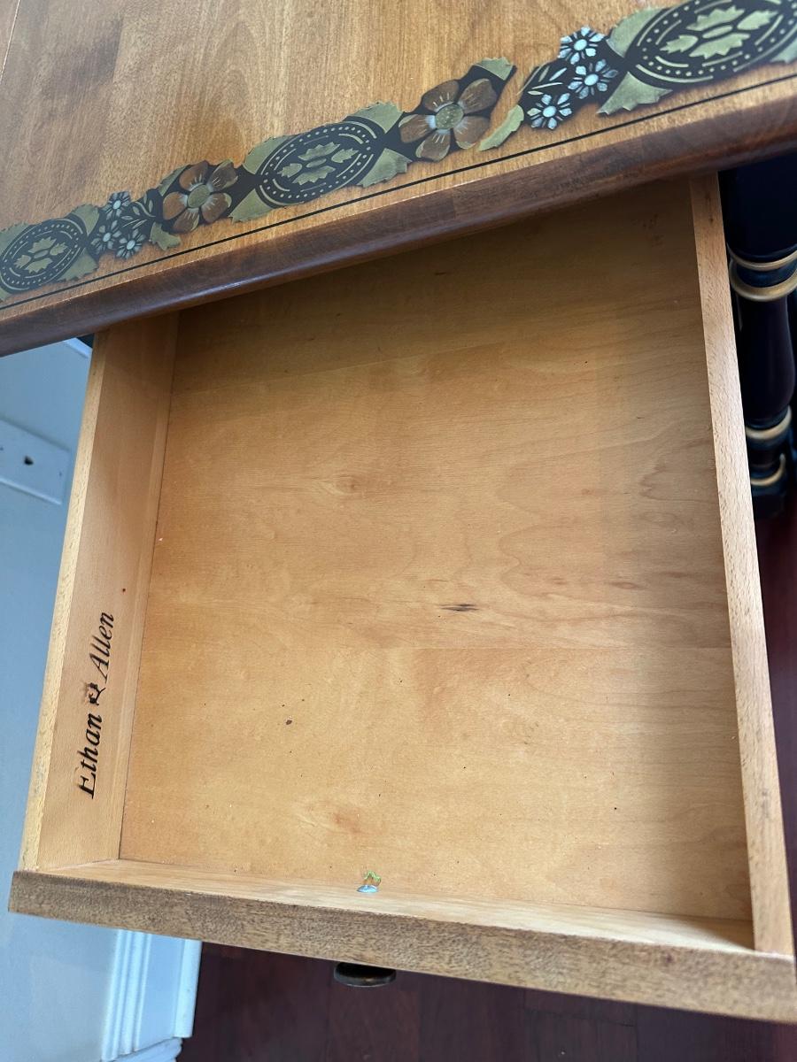 Ethan Allen wooden tea cart featuring drop-leaf sides, a single drawer with floral inlay, and turned black-and-gilt accented legs.