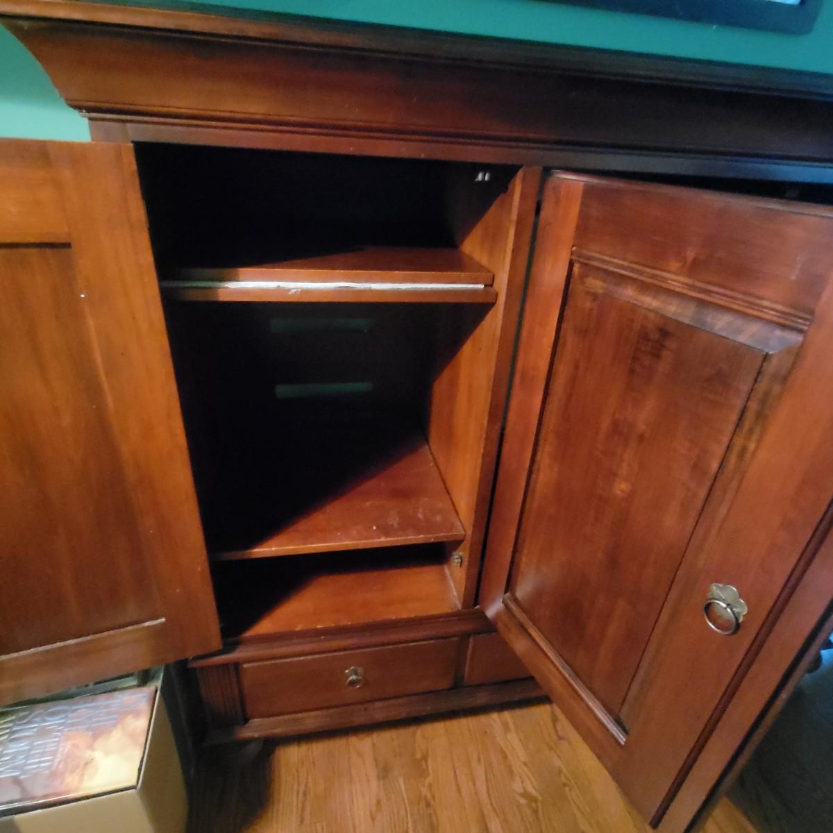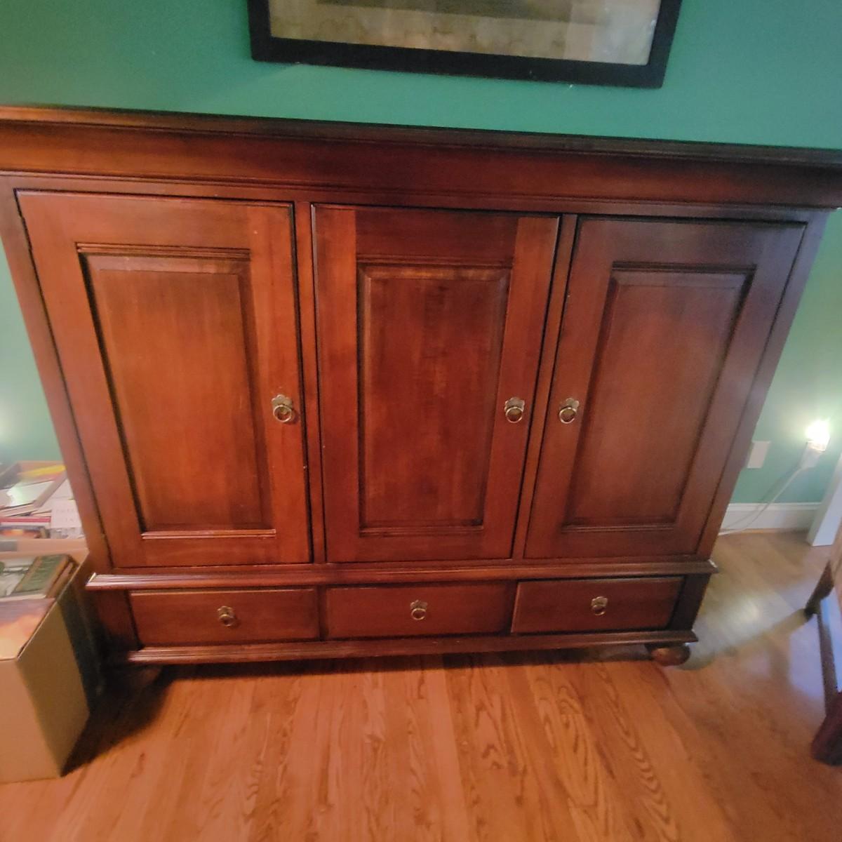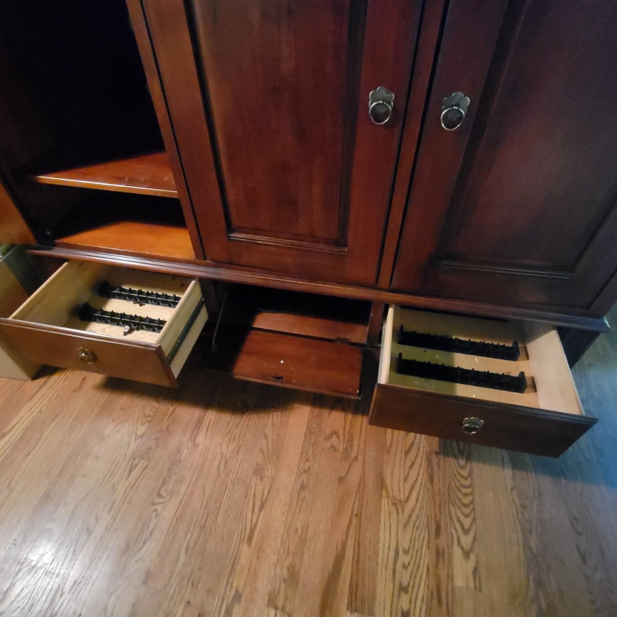 Solid wood Ethan Allen entertainment center with brass hardware, dovetailed drawers, and a 1/4" glass top. Matches other living room furniture pieces that are found in different lots in this auction. Measures approximately 64" x 26" x 53". Local pickup only