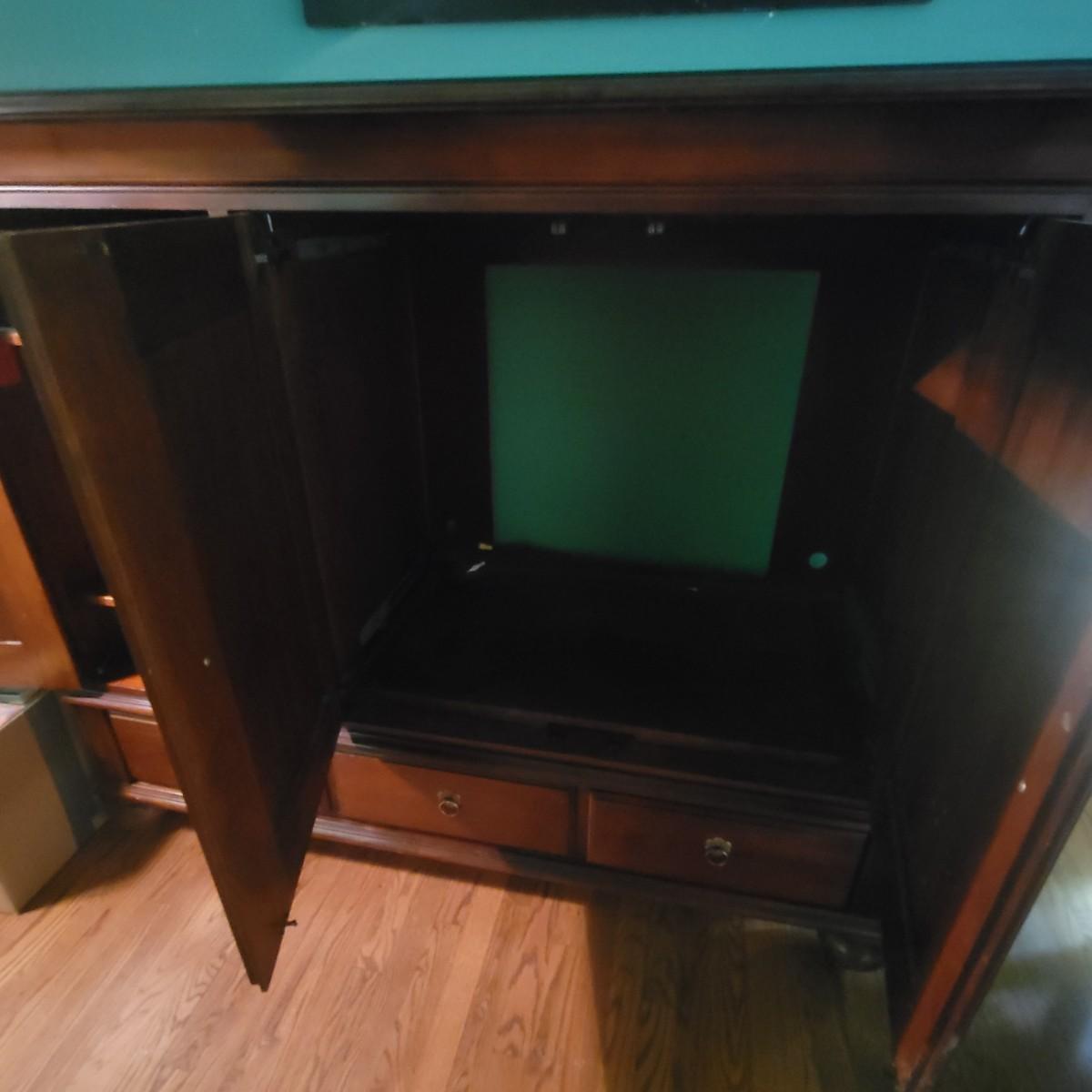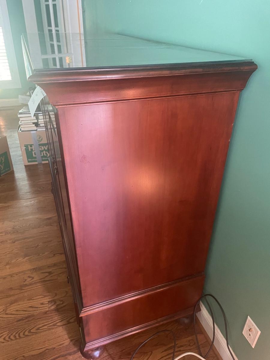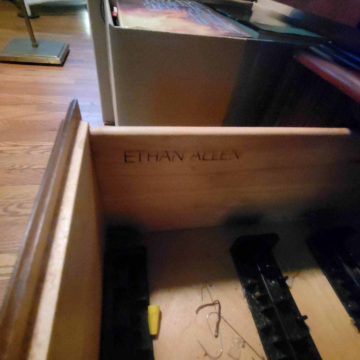 Solid wood Ethan Allen entertainment center with brass hardware, dovetailed drawers, and a 1/4" glass top. Matches other living room furniture pieces that are found in different lots in this auction. Measures approximately 64" x 26" x 53". Local pickup only