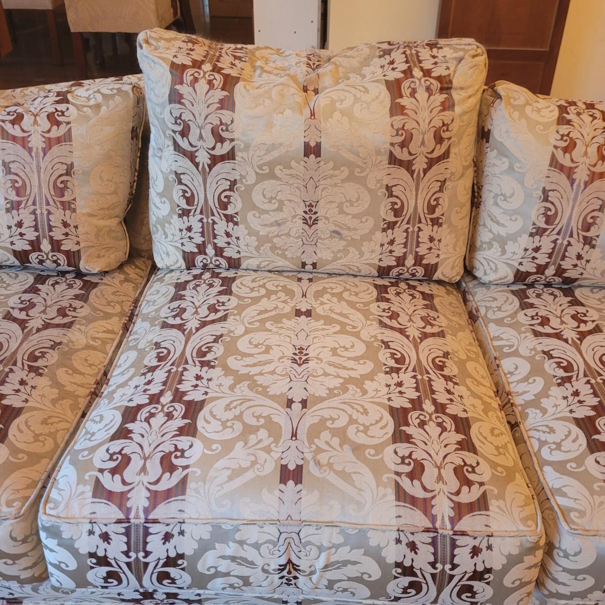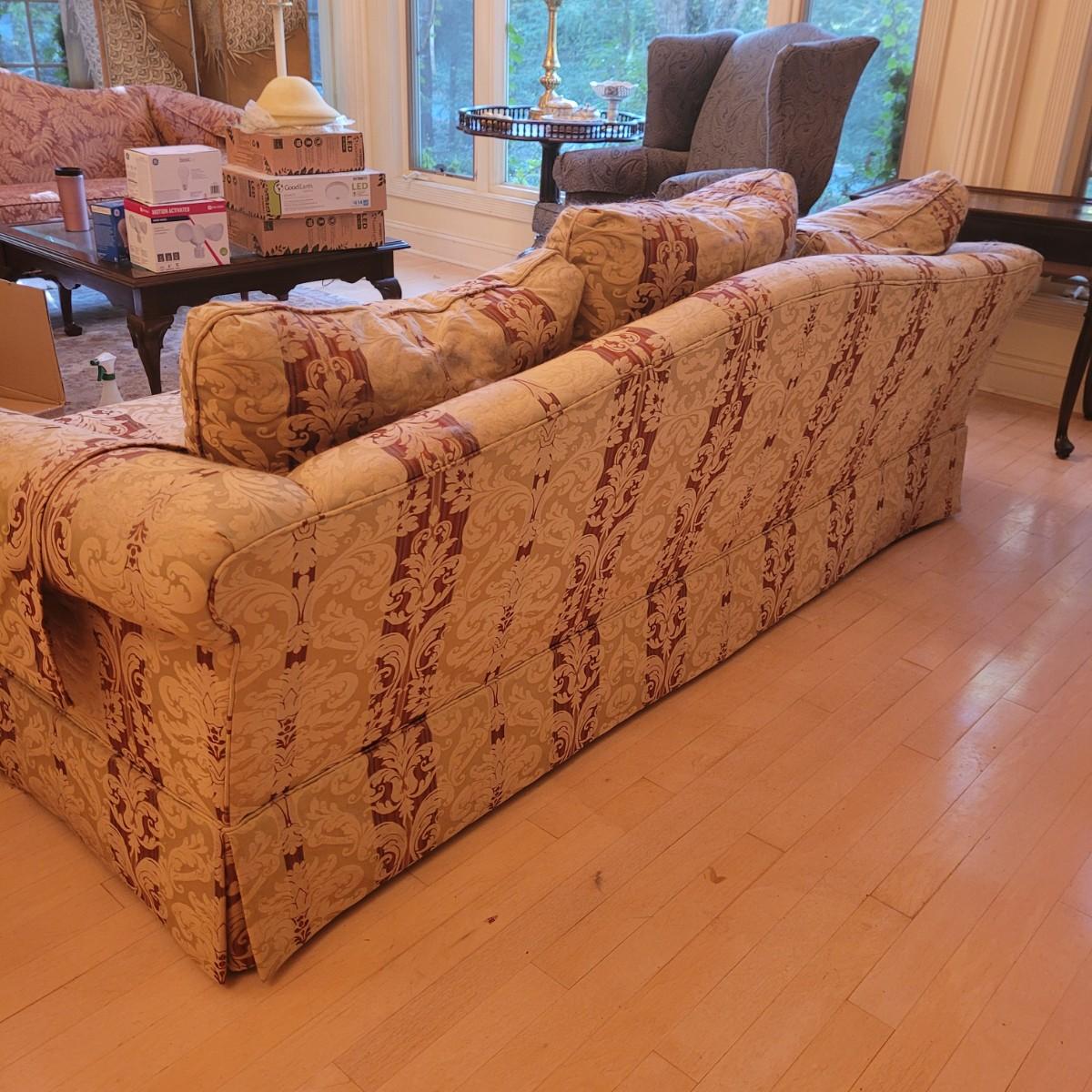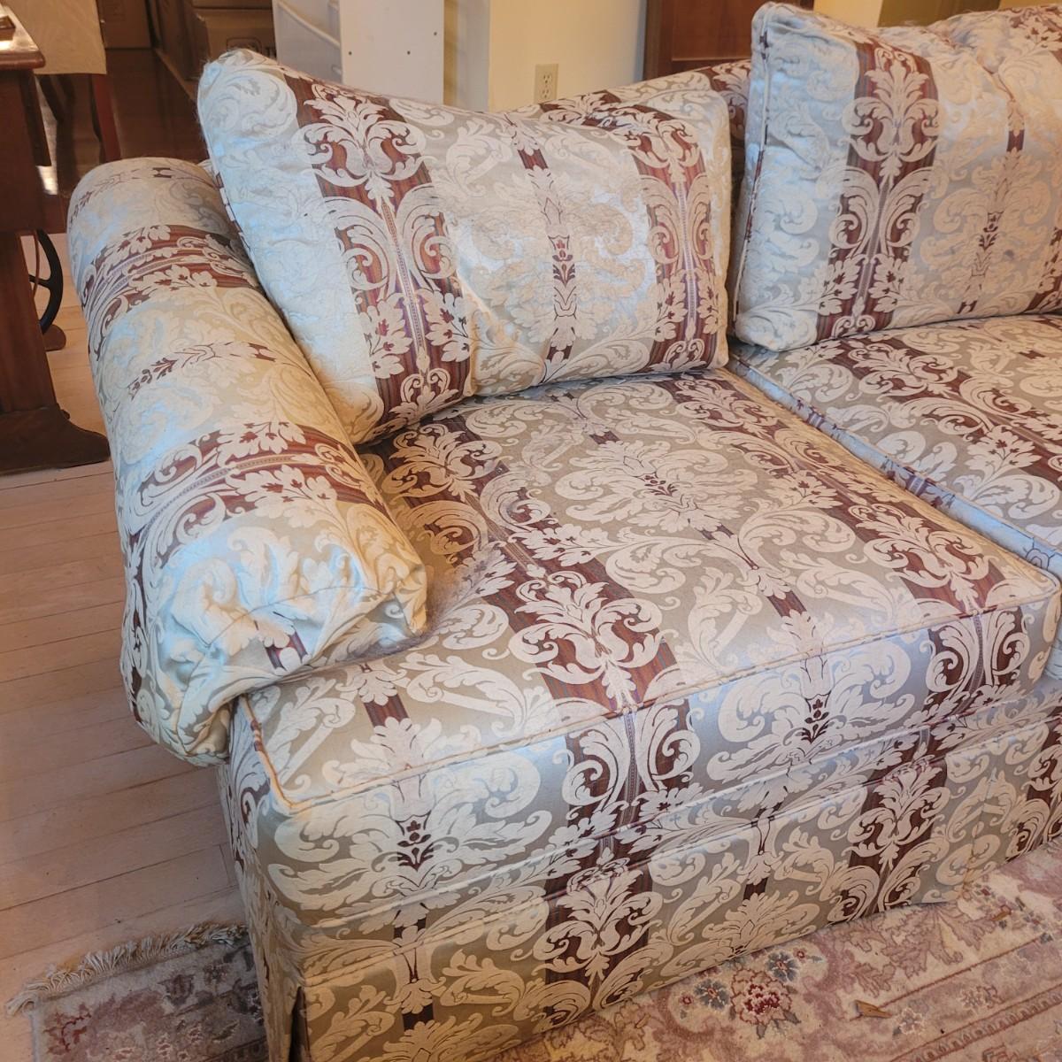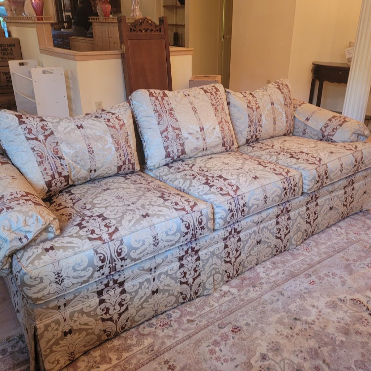 Large sofa with cream colored floral print over multicolored stripes. Cushion covers are removable. Large amount of cat hair on fabric. Measures approximately 85"L x33"W x30"H, seat height 20"H. Please note this was a smoking household and fabric does hold the smell. Local pickup only.