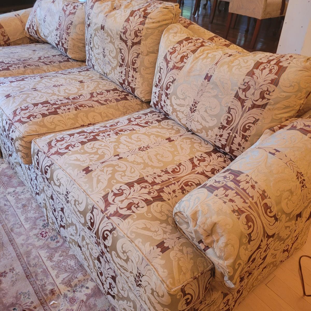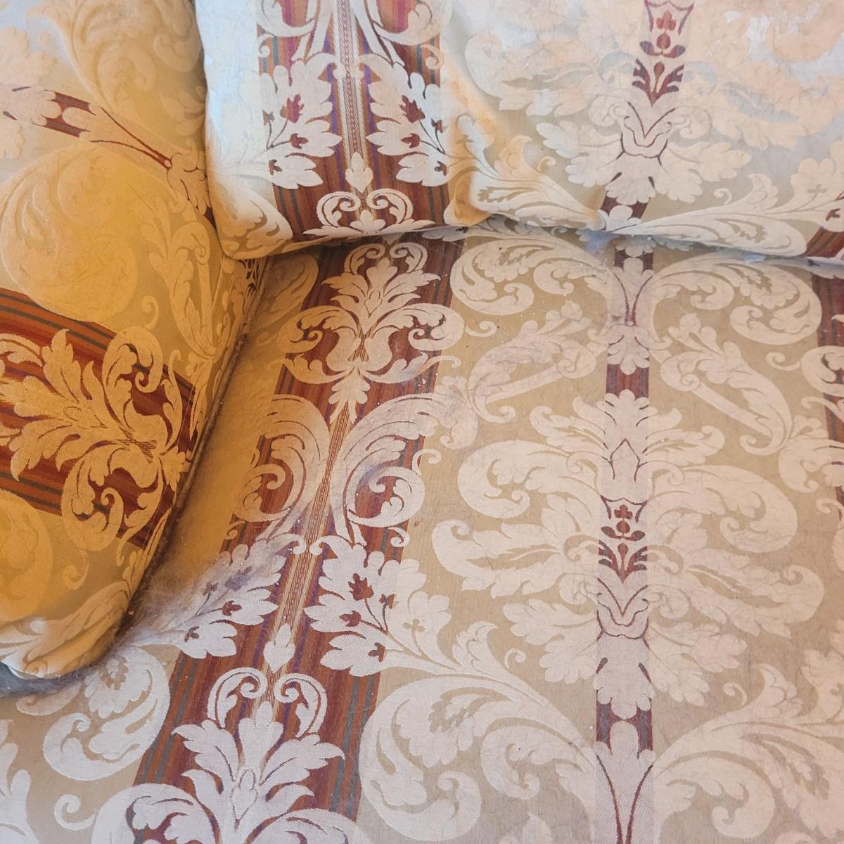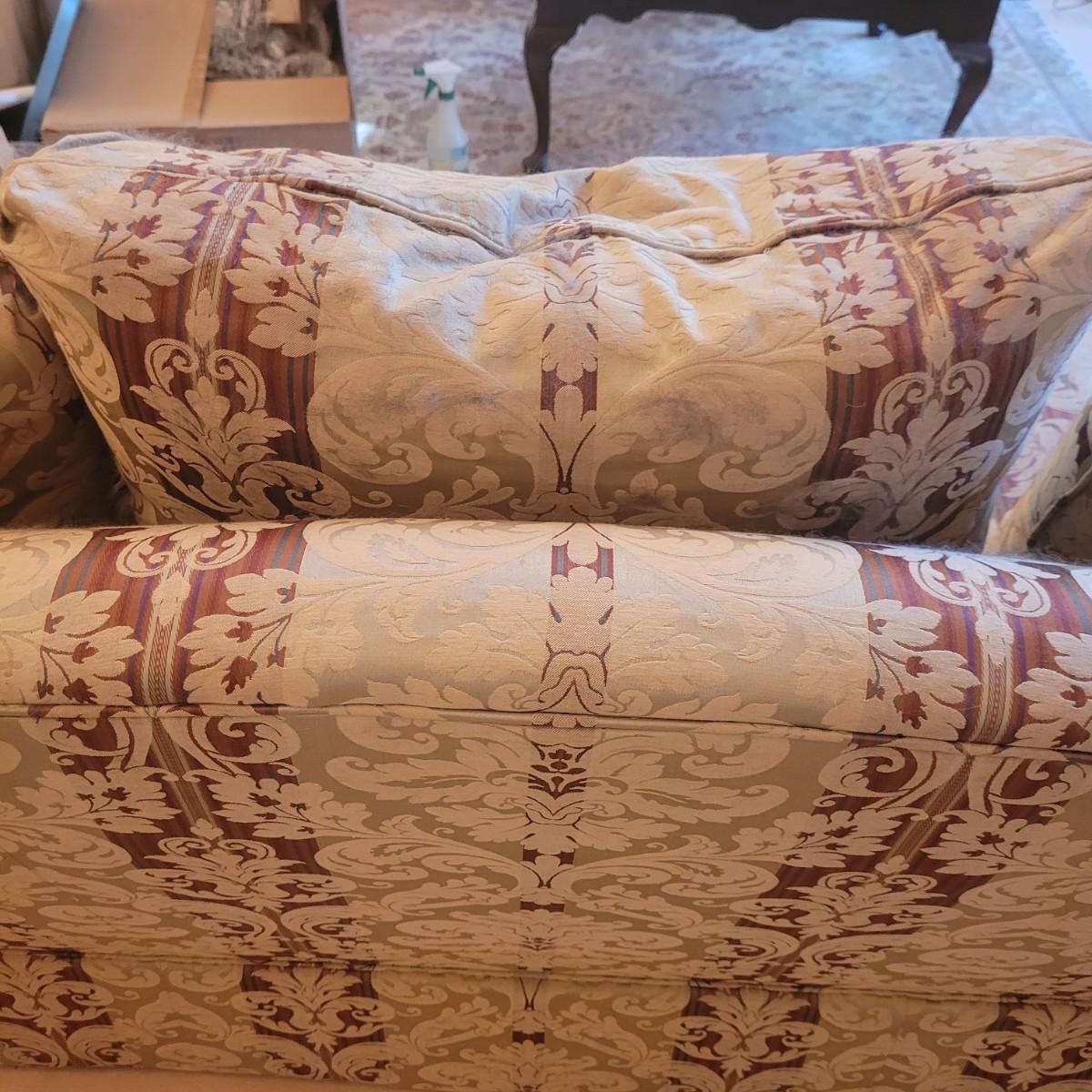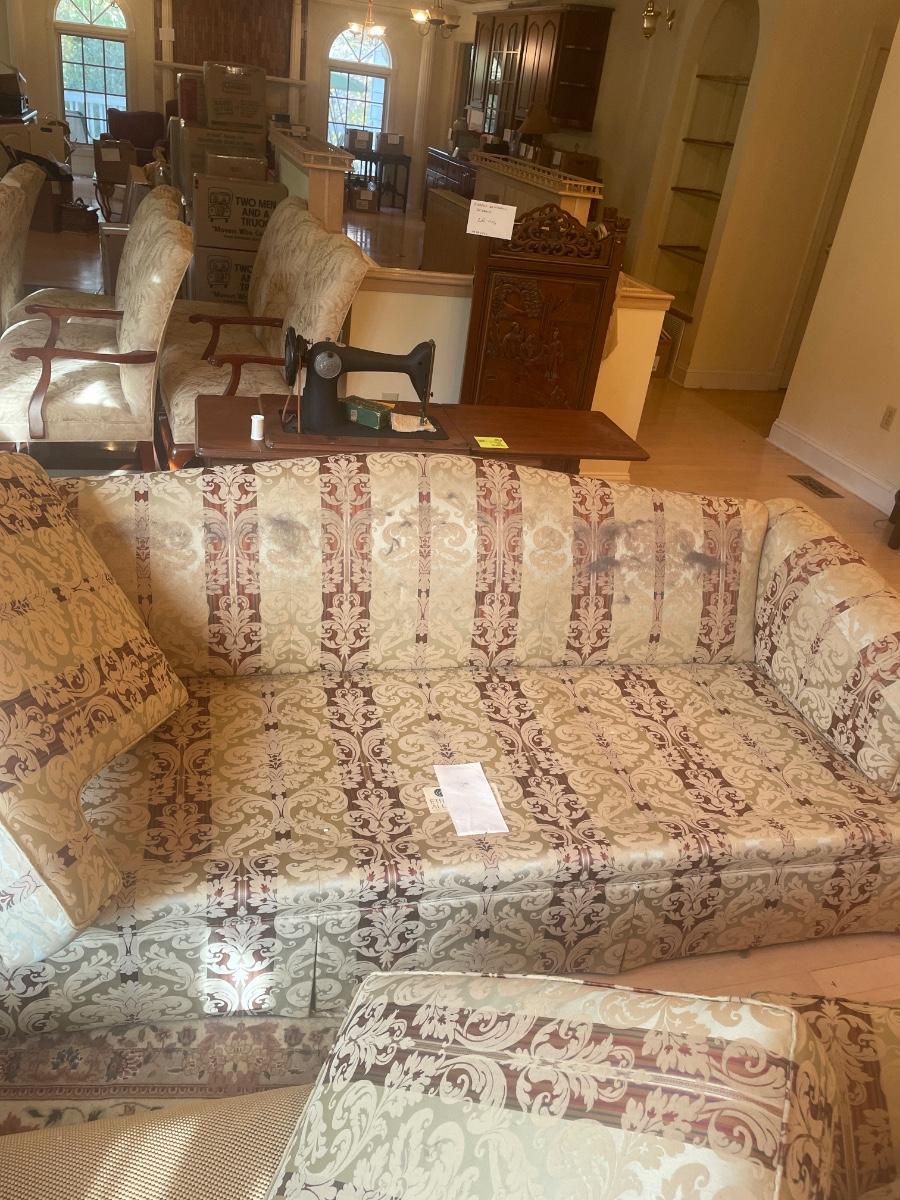 Large sofa with cream colored floral print over multicolored stripes. Cushion covers are removable. Large amount of cat hair on fabric. Measures approximately 85"L x33"W x30"H, seat height 20"H. Please note this was a smoking household and fabric does hold the smell. Local pickup only.