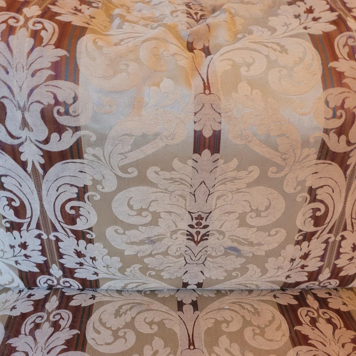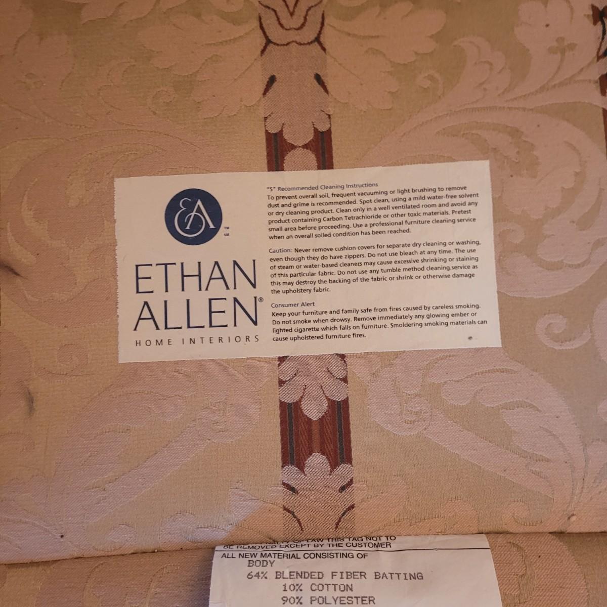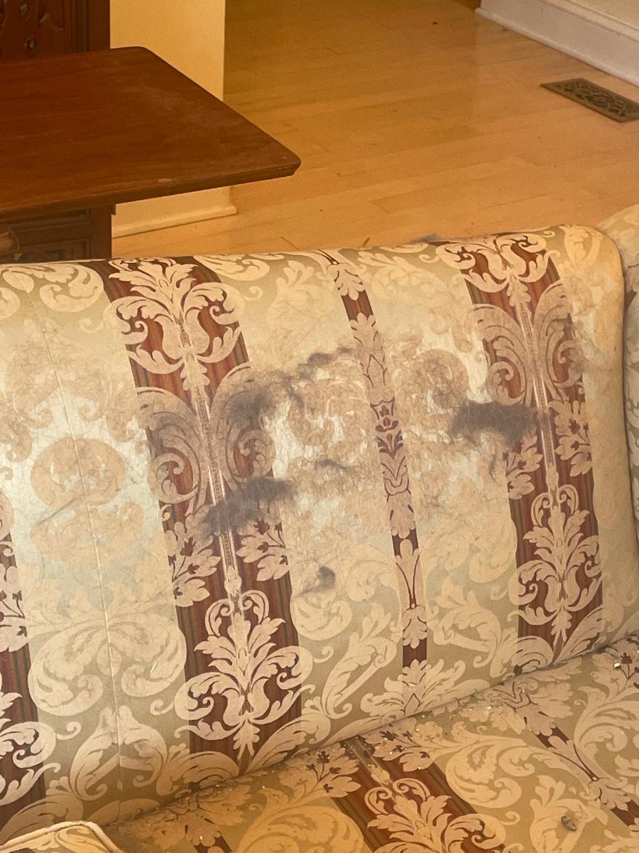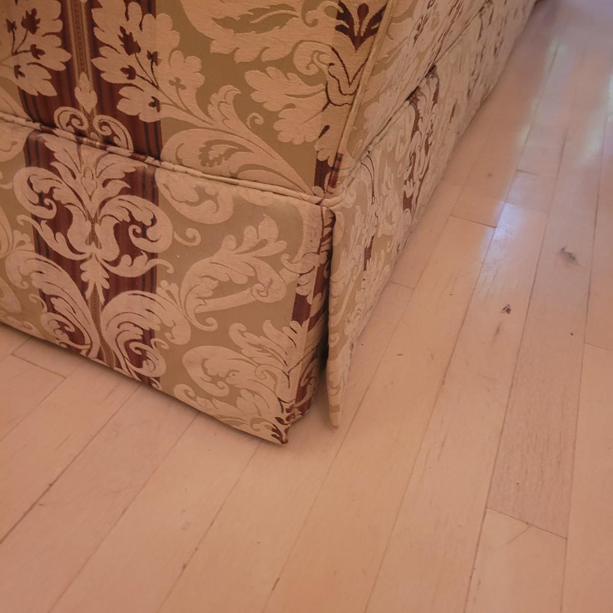 Large sofa with cream colored floral print over multicolored stripes. Cushion covers are removable. Large amount of cat hair on fabric. Measures approximately 85"L x33"W x30"H, seat height 20"H. Please note this was a smoking household and fabric does hold the smell. Local pickup only.