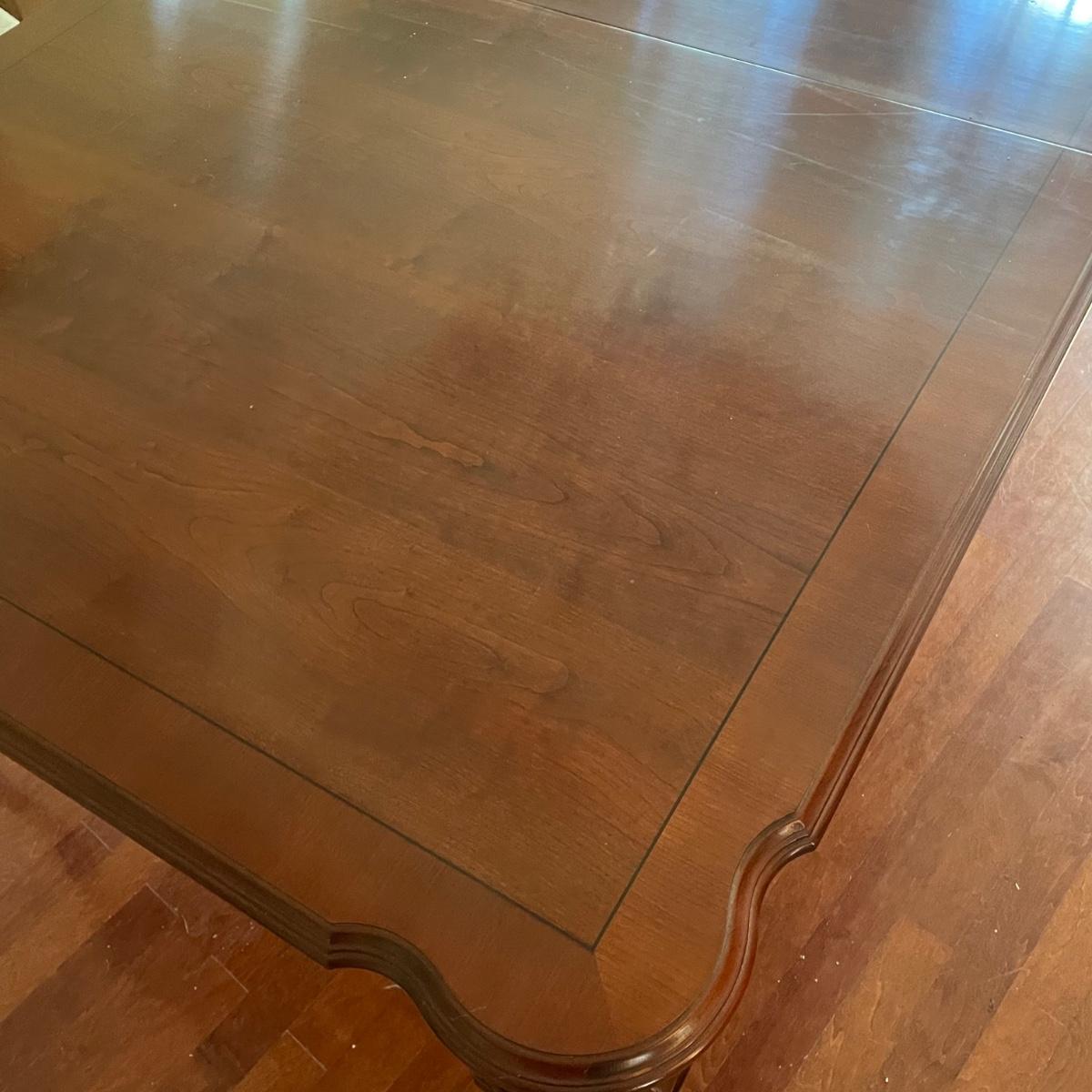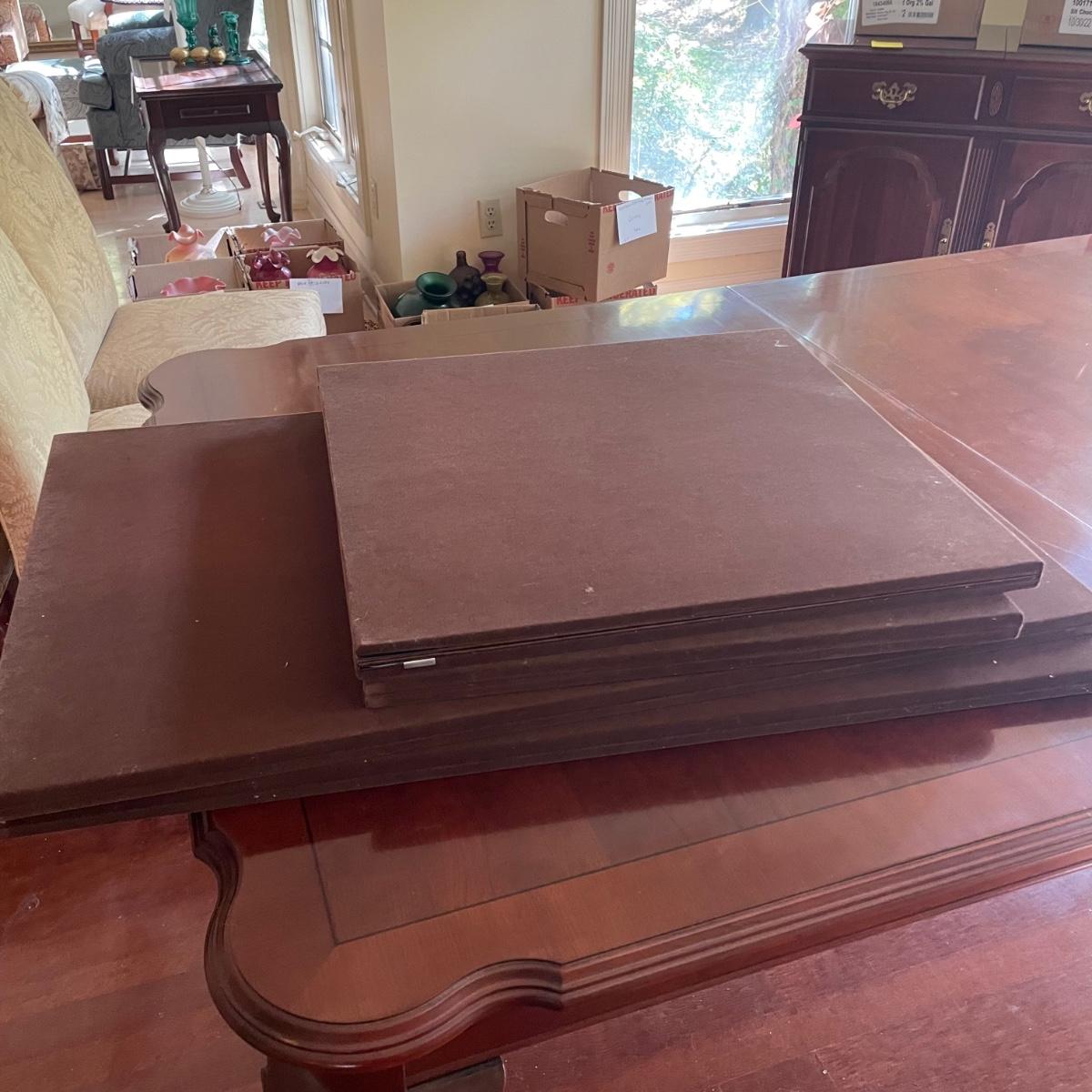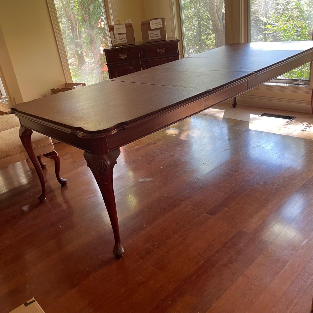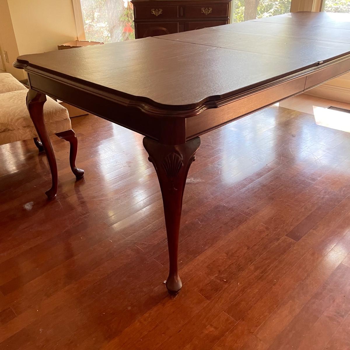 This elegant solid wood Ethan Allen dining table goes from 70” long to 110” with the placement of its two 20” wide leaves. The table comes with custom protective pads. There are a few minor nicks in the table shown in photos but all in all this table has been well cared for. The worst blemish is a small chip on one side, which has been saved and is included and could be glued back on. Table is located in a room with windows, so any irregularities in color in the photos are due to this; the table has no fading. Table is 44” wide x 30” tall. Eight Ethan Allen dining chairs are in another lot in this sale that match this table perfectly and lots more items of this same collection in this sale. Table is heavy; the winning bidder must bring help to load.