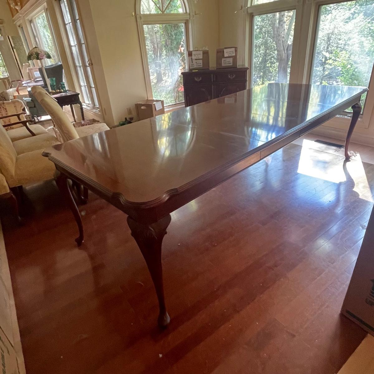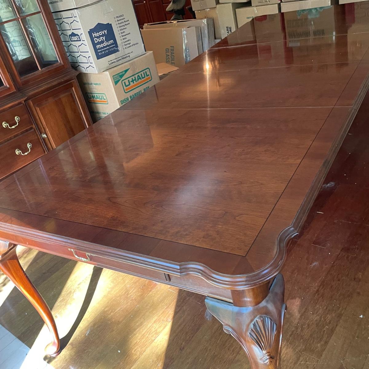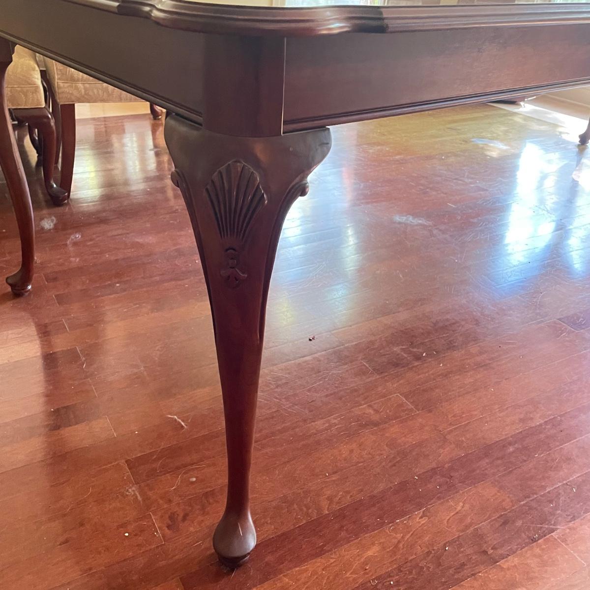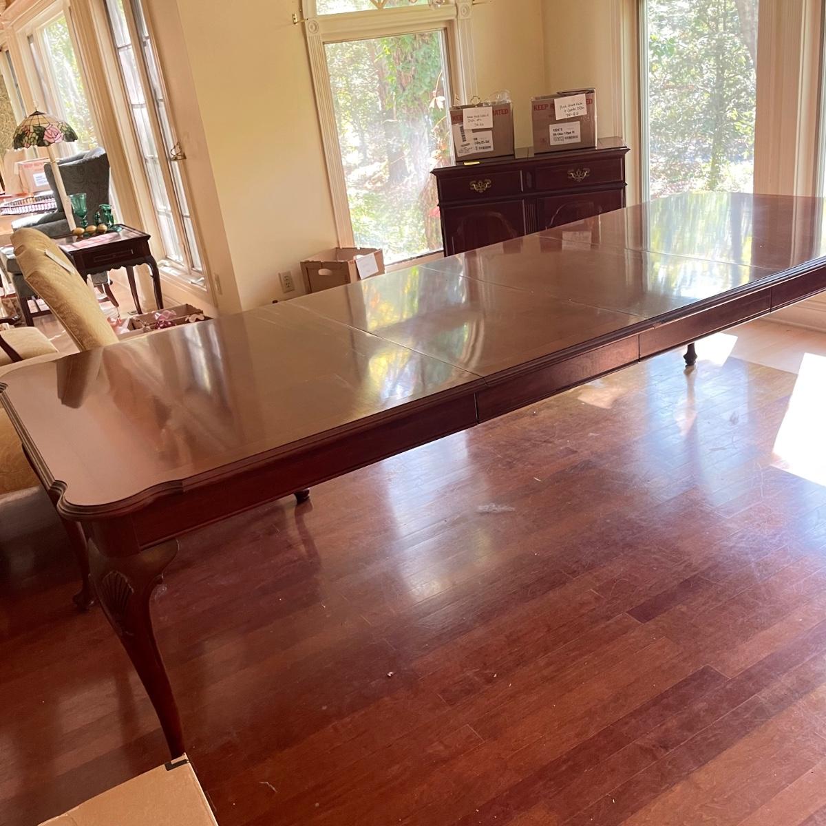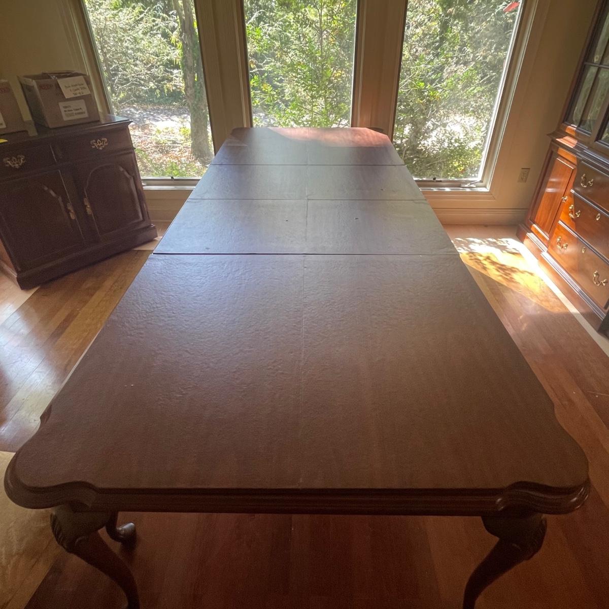 This elegant solid wood Ethan Allen dining table goes from 70” long to 110” with the placement of its two 20” wide leaves. The table comes with custom protective pads. There are a few minor nicks in the table shown in photos but all in all this table has been well cared for. The worst blemish is a small chip on one side, which has been saved and is included and could be glued back on. Table is located in a room with windows, so any irregularities in color in the photos are due to this; the table has no fading. Table is 44” wide x 30” tall. Eight Ethan Allen dining chairs are in another lot in this sale that match this table perfectly and lots more items of this same collection in this sale. Table is heavy; the winning bidder must bring help to load.