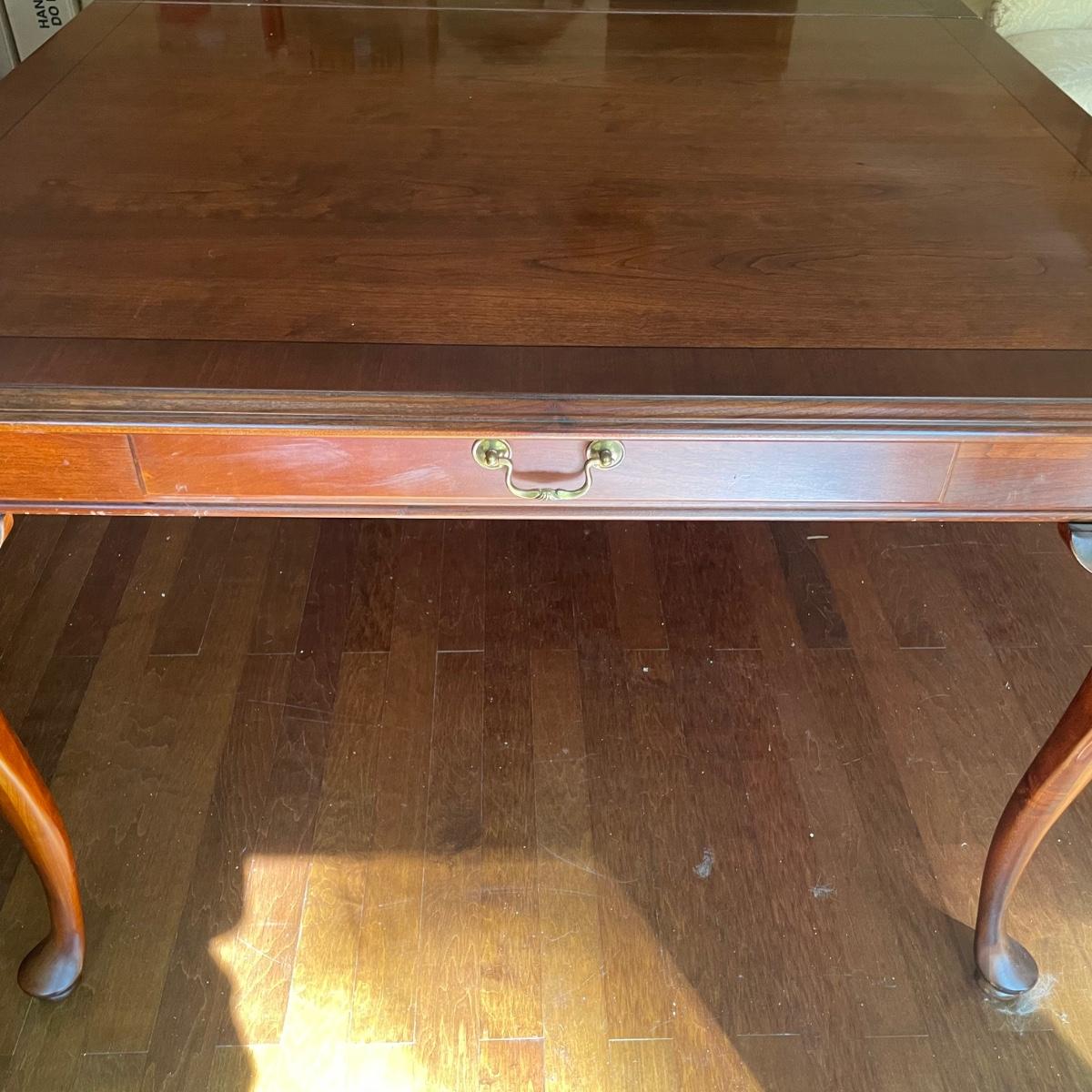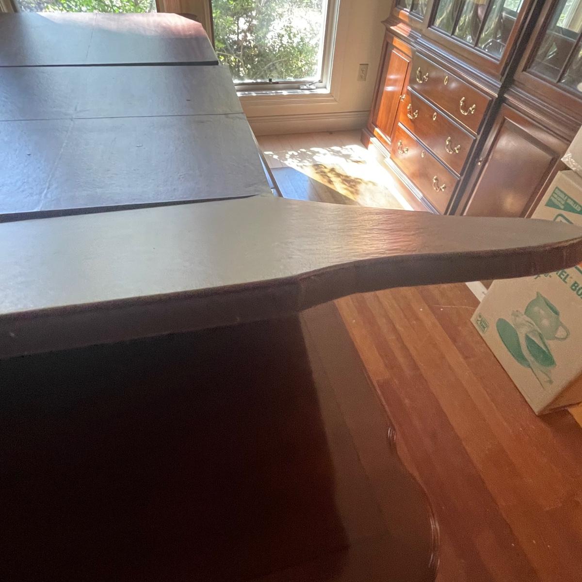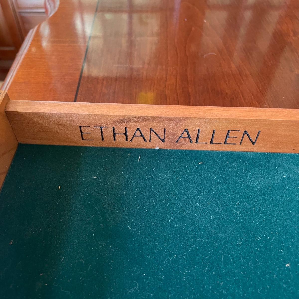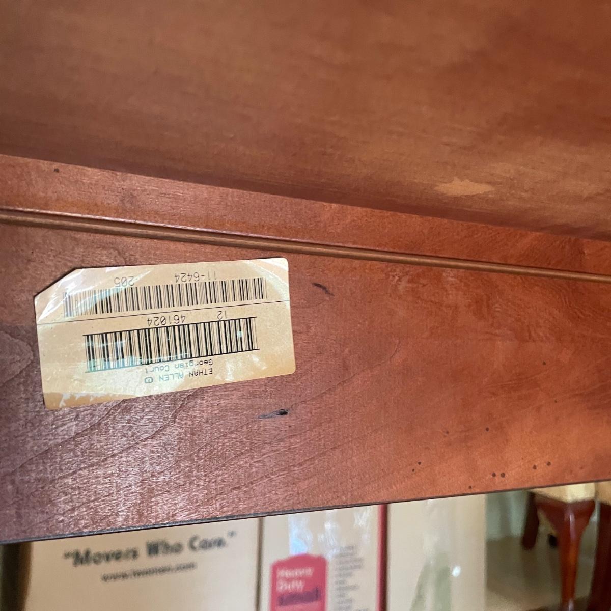 This elegant solid wood Ethan Allen dining table goes from 70” long to 110” with the placement of its two 20” wide leaves. The table comes with custom protective pads. There are a few minor nicks in the table shown in photos but all in all this table has been well cared for. The worst blemish is a small chip on one side, which has been saved and is included and could be glued back on. Table is located in a room with windows, so any irregularities in color in the photos are due to this; the table has no fading. Table is 44” wide x 30” tall. Eight Ethan Allen dining chairs are in another lot in this sale that match this table perfectly and lots more items of this same collection in this sale. Table is heavy; the winning bidder must bring help to load.