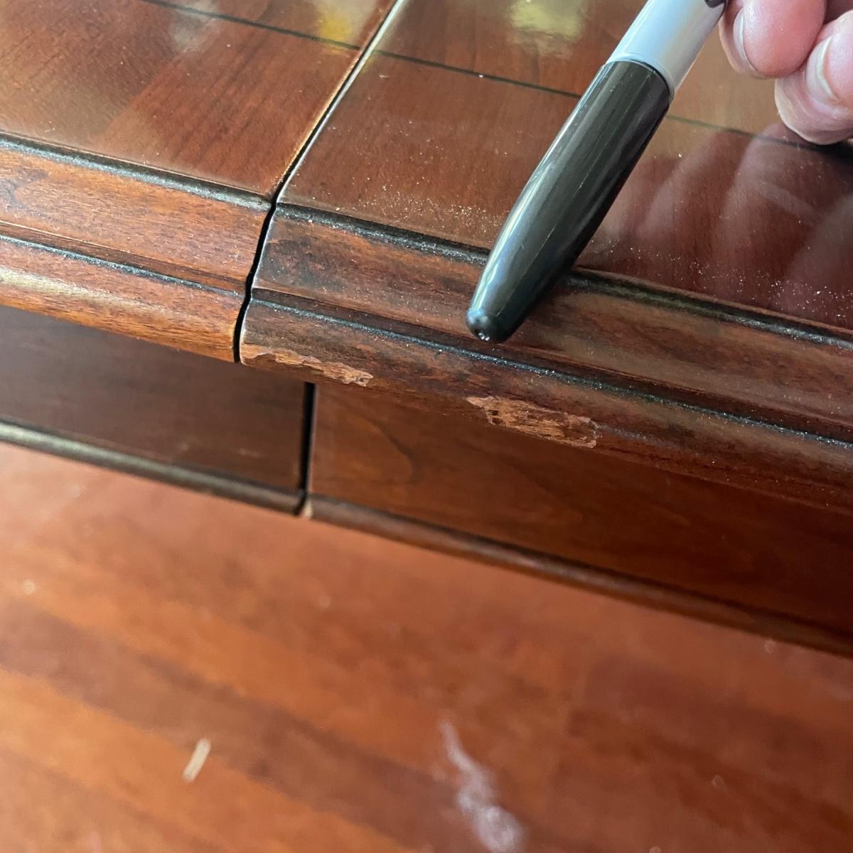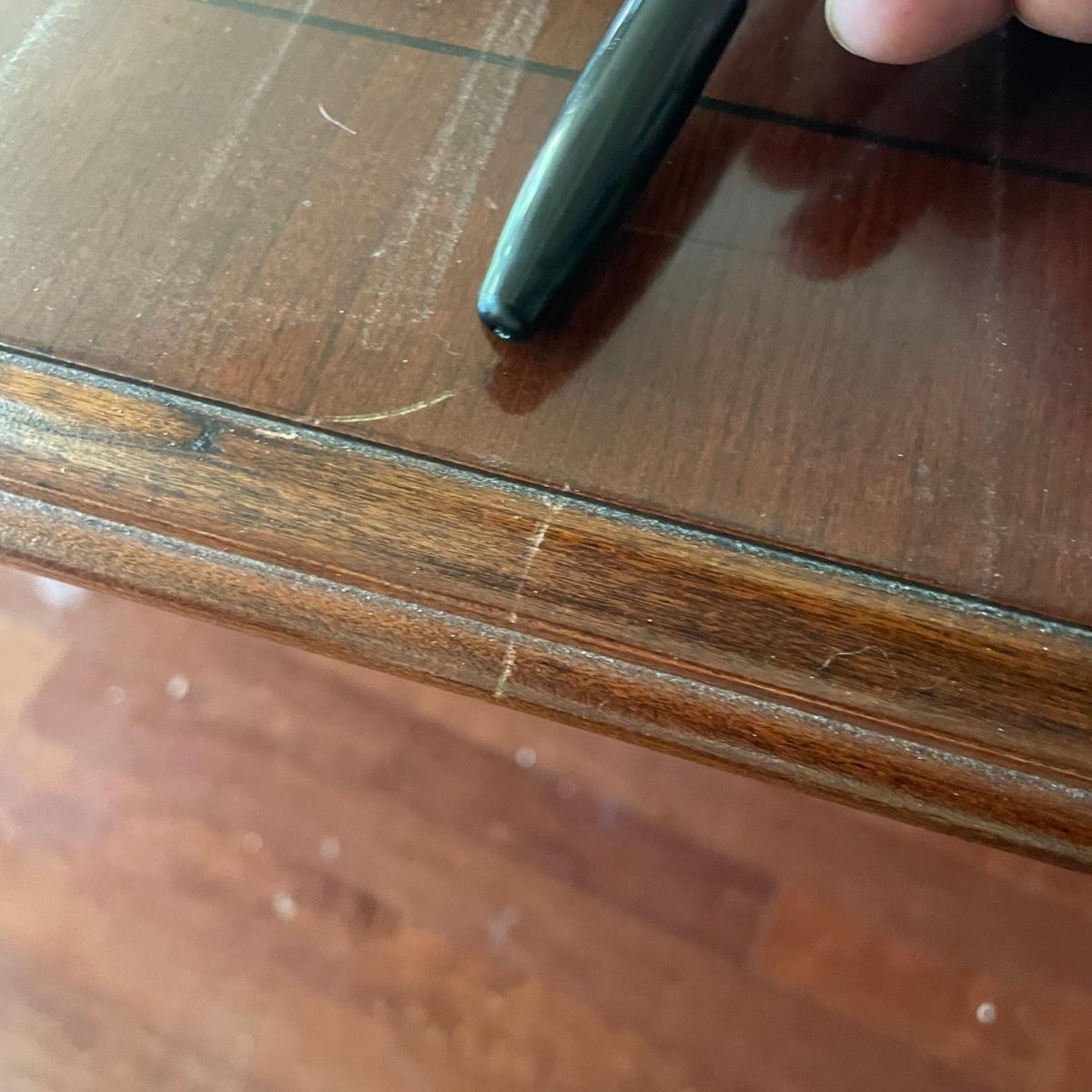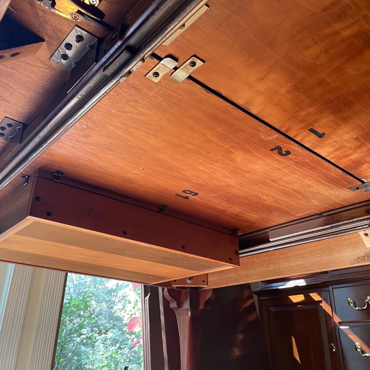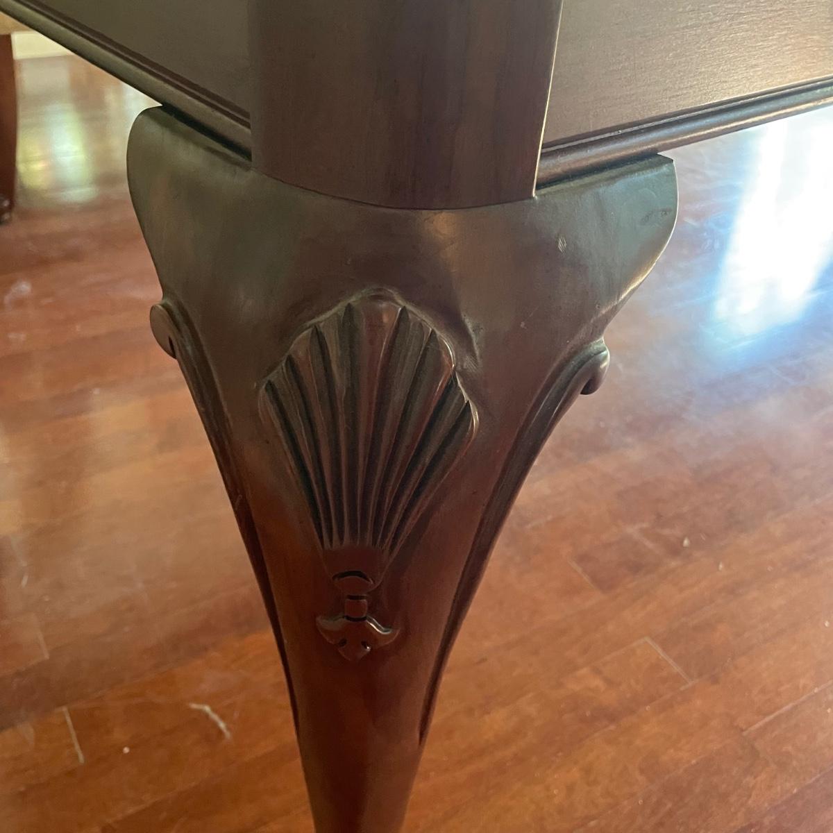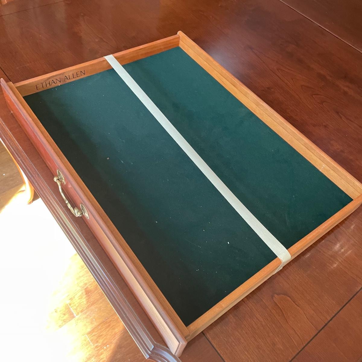This elegant solid wood Ethan Allen dining table goes from 70” long to 110” with the placement of its two 20” wide leaves. The table comes with custom protective pads. There are a few minor nicks in the table shown in photos but all in all this table has been well cared for. The worst blemish is a small chip on one side, which has been saved and is included and could be glued back on. Table is located in a room with windows, so any irregularities in color in the photos are due to this; the table has no fading. Table is 44” wide x 30” tall. Eight Ethan Allen dining chairs are in another lot in this sale that match this table perfectly and lots more items of this same collection in this sale. Table is heavy; the winning bidder must bring help to load.