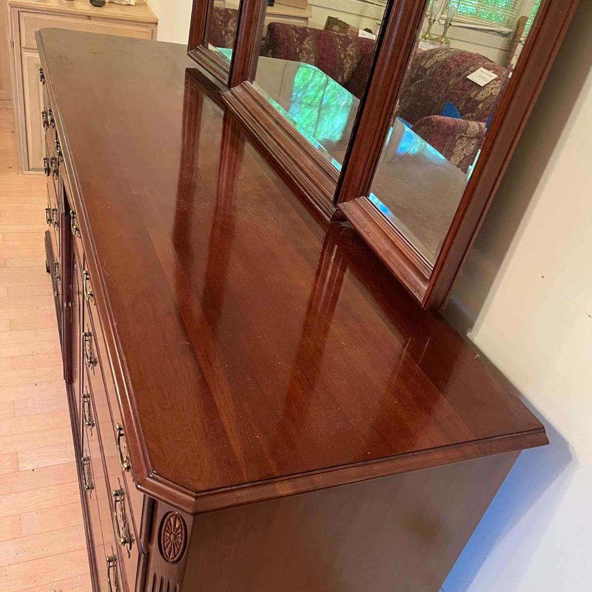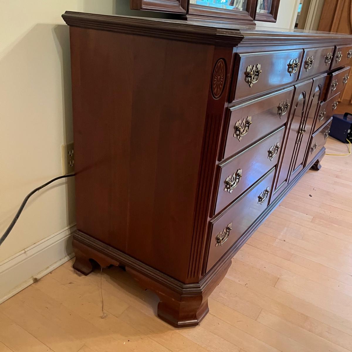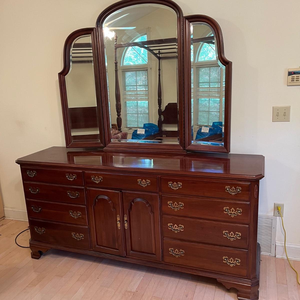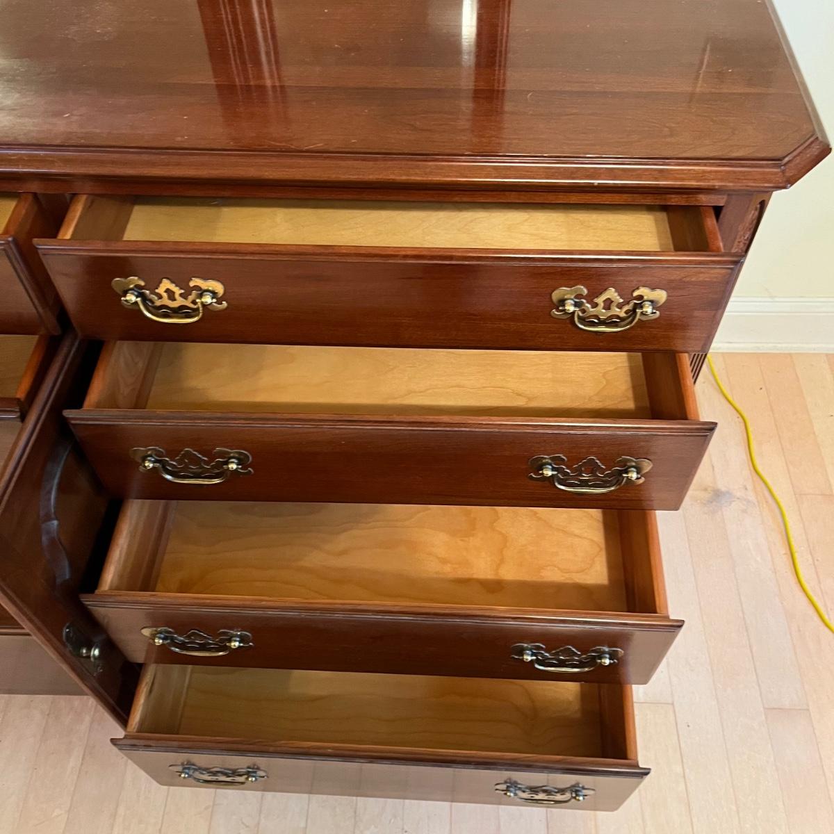 Lot includes a Ethan Allen Georgian Court dresser and mirror. Dresser has nine dovetailed drawers and two more drawers behind cabinet, it is in excellent condition. Mirror is detachable for moving. There are a number of other lots in this sale that are also this Ethan Allen collection. Bring help item is substantial. Dresser measures 20.5” x 74.5” x 34.5” without mirror and mirror measures 55” x 45.5”.