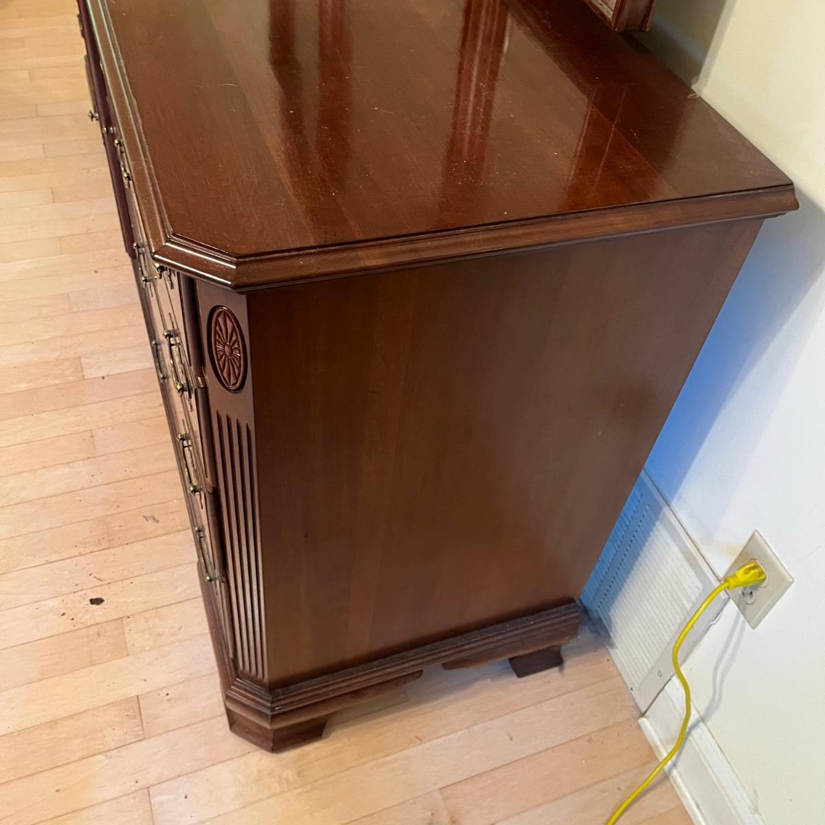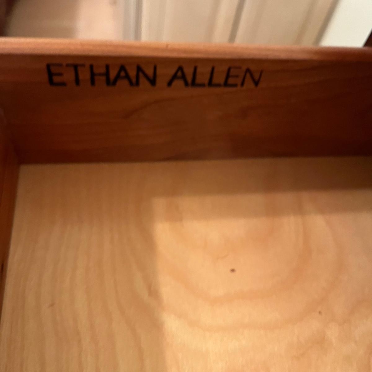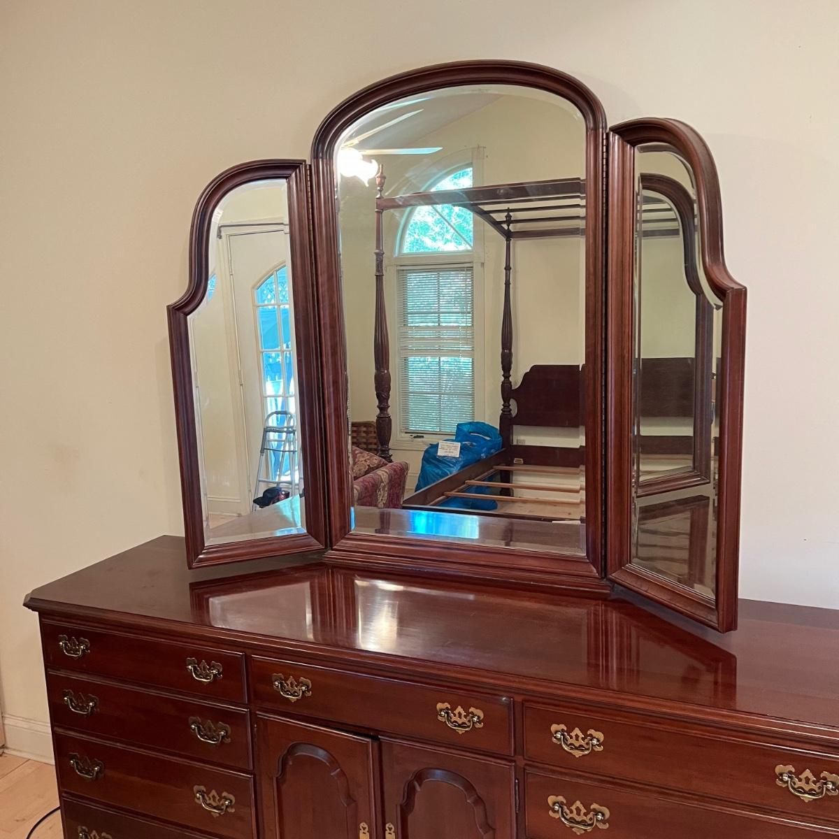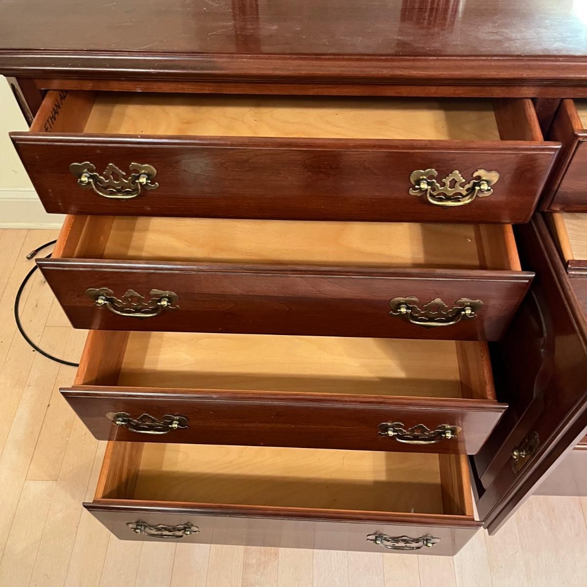 Lot includes a Ethan Allen Georgian Court dresser and mirror. Dresser has nine dovetailed drawers and two more drawers behind cabinet, it is in excellent condition. Mirror is detachable for moving. There are a number of other lots in this sale that are also this Ethan Allen collection. Bring help item is substantial. Dresser measures 20.5” x 74.5” x 34.5” without mirror and mirror measures 55” x 45.5”.