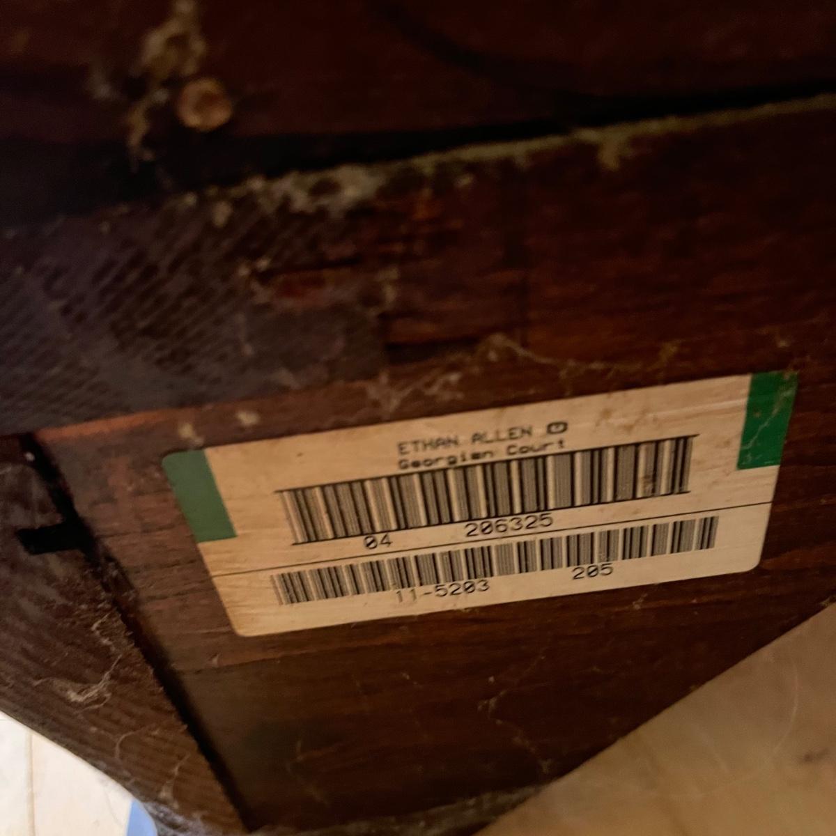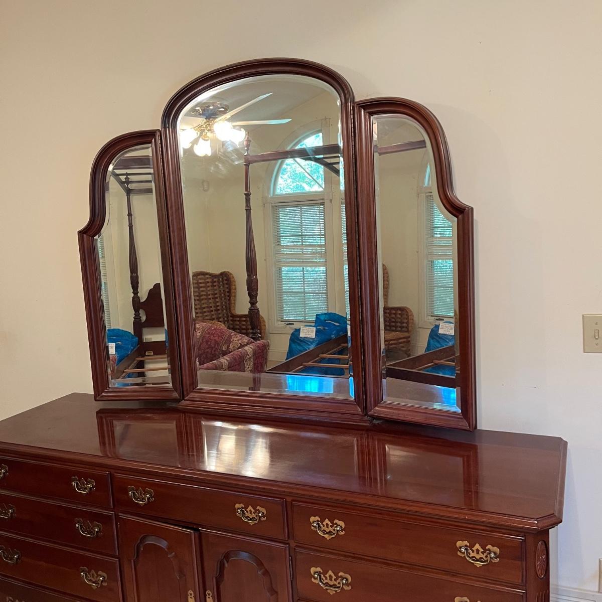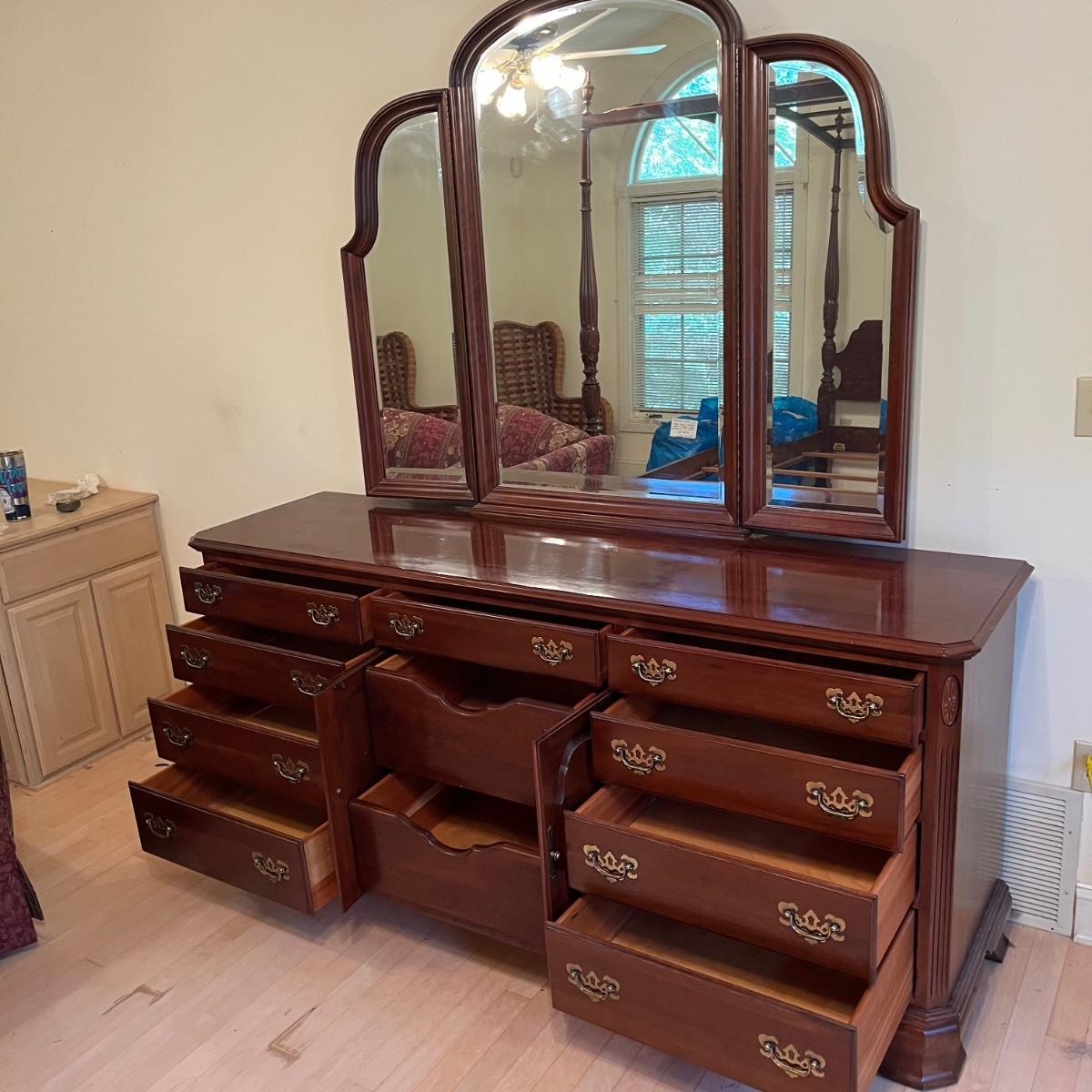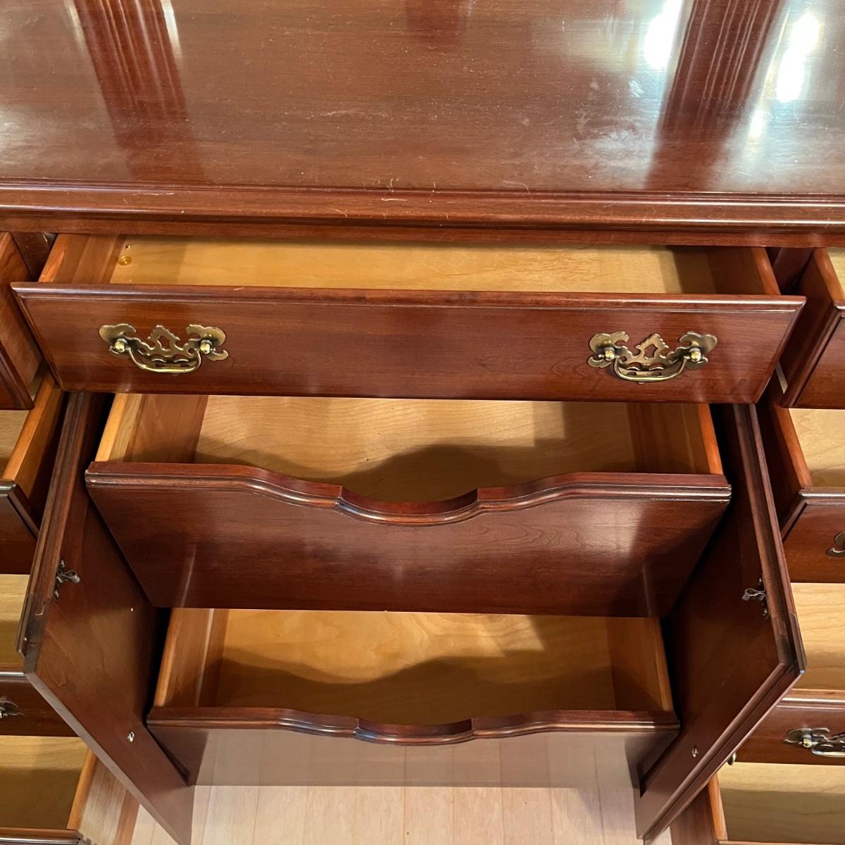 Lot includes a Ethan Allen Georgian Court dresser and mirror. Dresser has nine dovetailed drawers and two more drawers behind cabinet, it is in excellent condition. Mirror is detachable for moving. There are a number of other lots in this sale that are also this Ethan Allen collection. Bring help item is substantial. Dresser measures 20.5” x 74.5” x 34.5” without mirror and mirror measures 55” x 45.5”.